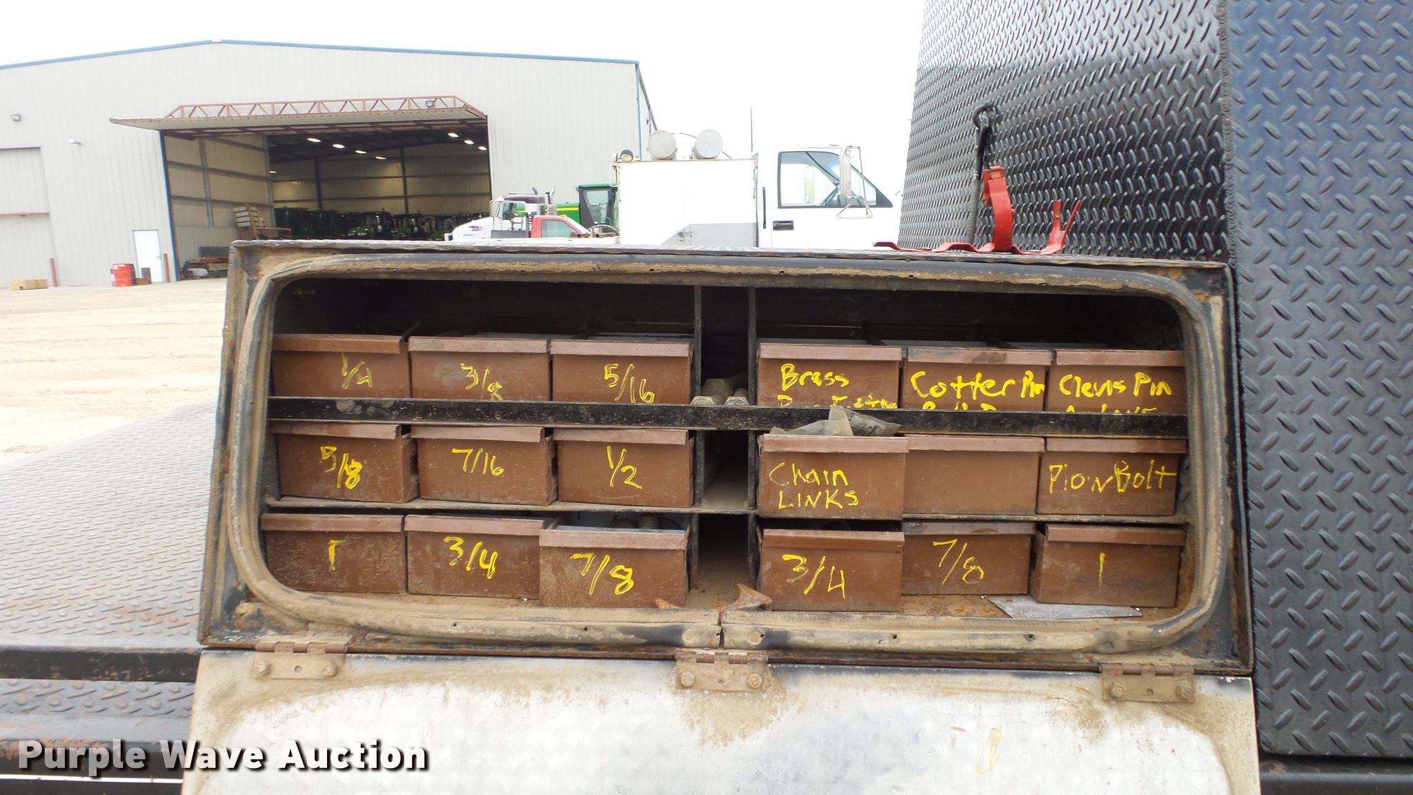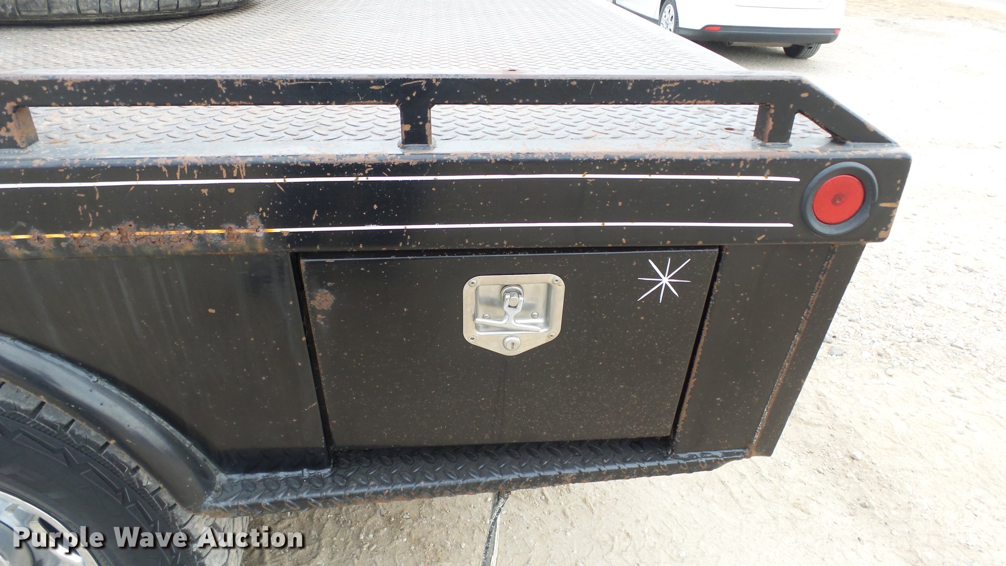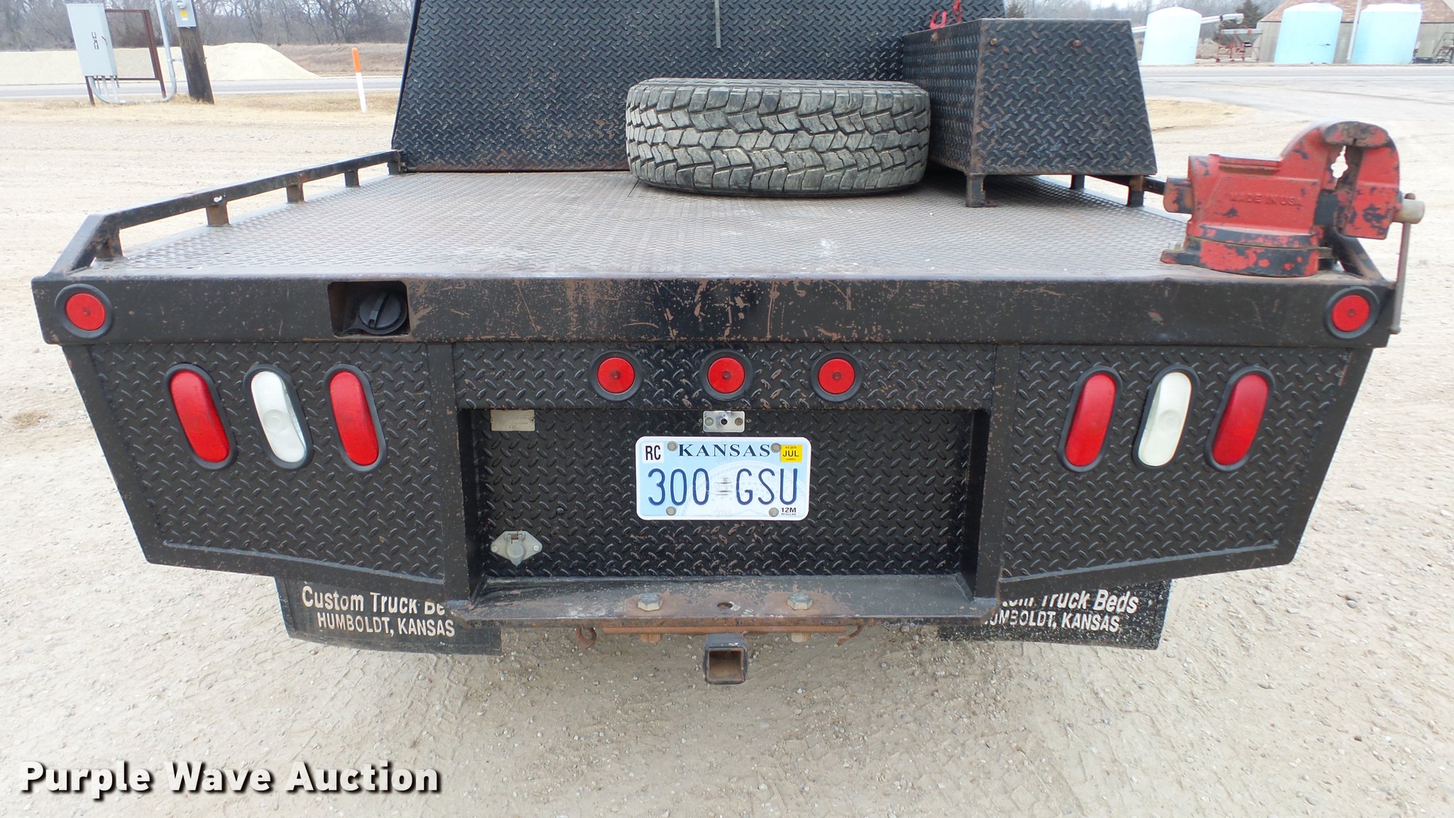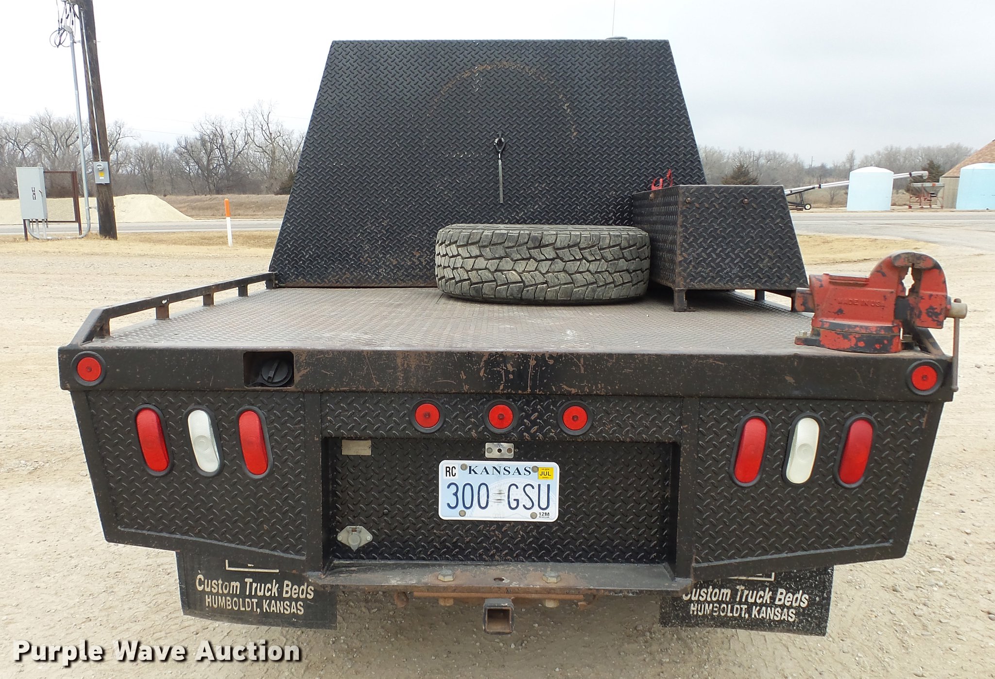 2007 Ford F350 Super Duty XLT flatbed pickup truck. 152,658 miles on odometer, 6.0L V8 OHV 32V turbo diesel engine, Automatic transmission, Four wheel drive, AC and heat, Tilt, Cruise, Power windows, locks, and mirrors, AM/FM/CD, Cloth interior, Trailer brake controller, B&W flatbed 9'3"L x 7'W, Toolbox, 6" vise, Auxiliary fuel tank 12V fuel pump, Hose, Nozzle, Ranch Hand bumper replacement, Front tow hooks, Running boards, Trailer wiring, Receiver hitch, LT275/70R18 tires, Check engine light on, ABS light on , Windshield chipped. Kansas title. 1FDSF35P17EB42865. Knight Farms Retirement - Open inspection Feb. 7 and 12. 1750 US-56. Lyons, KS 67554