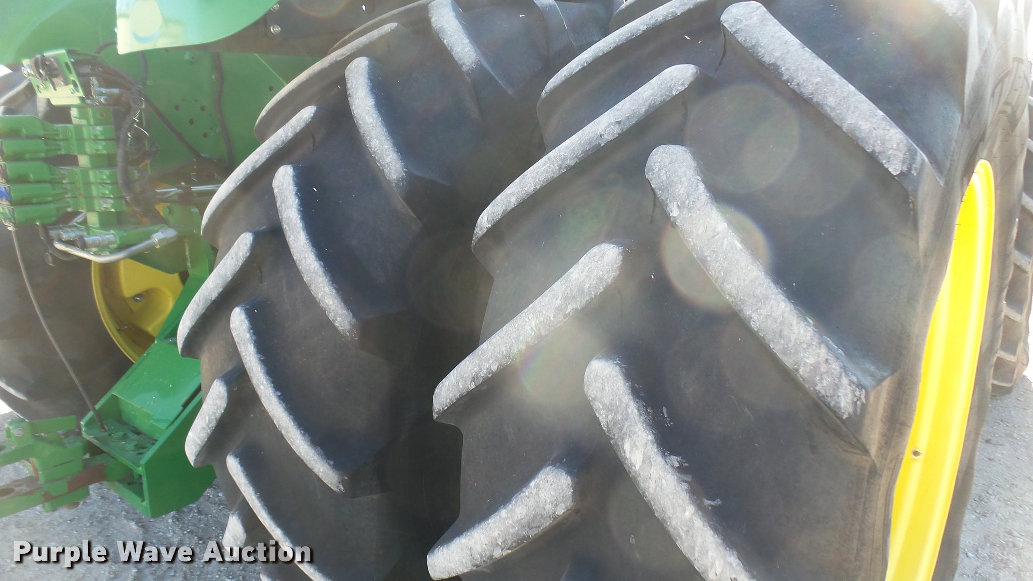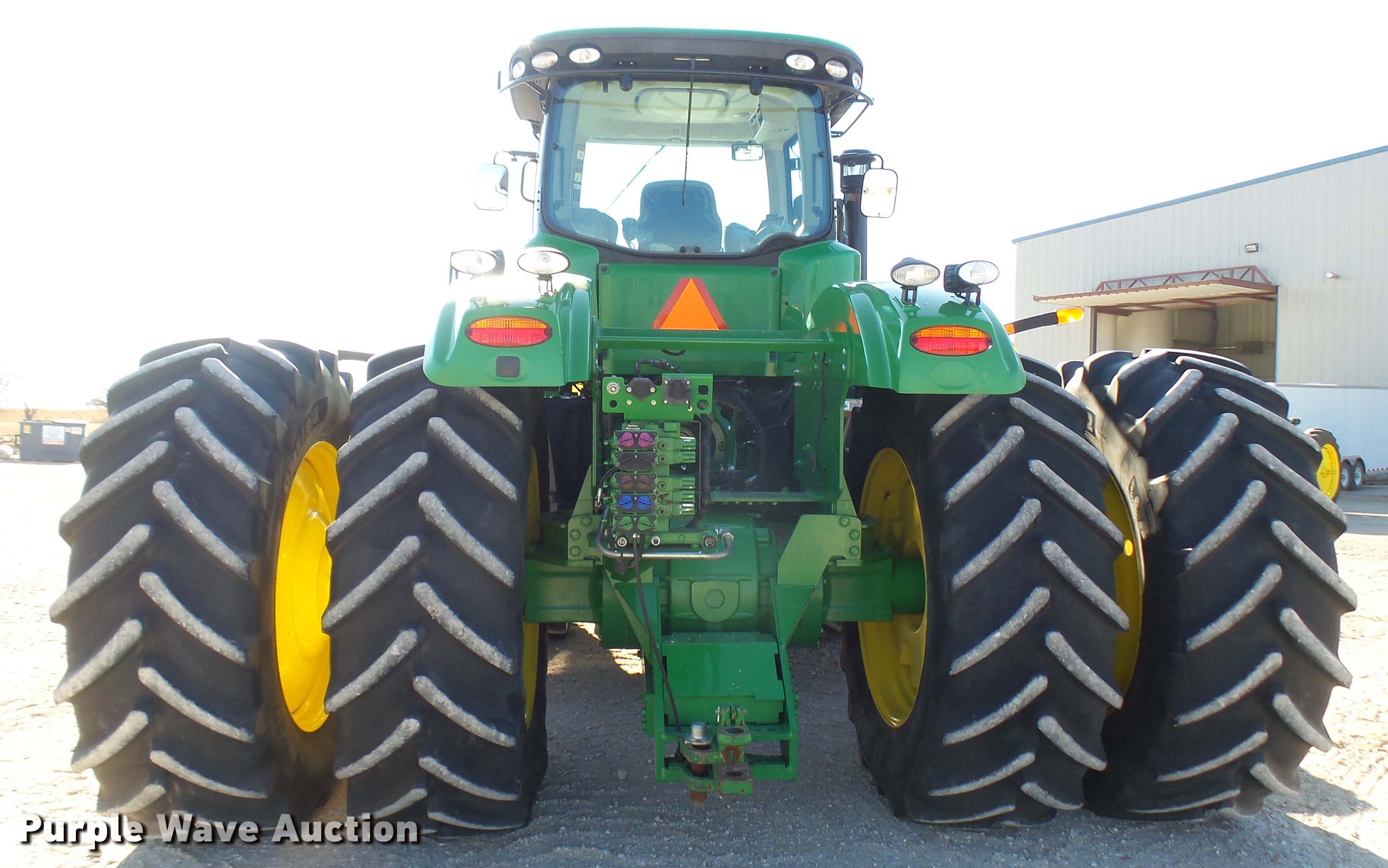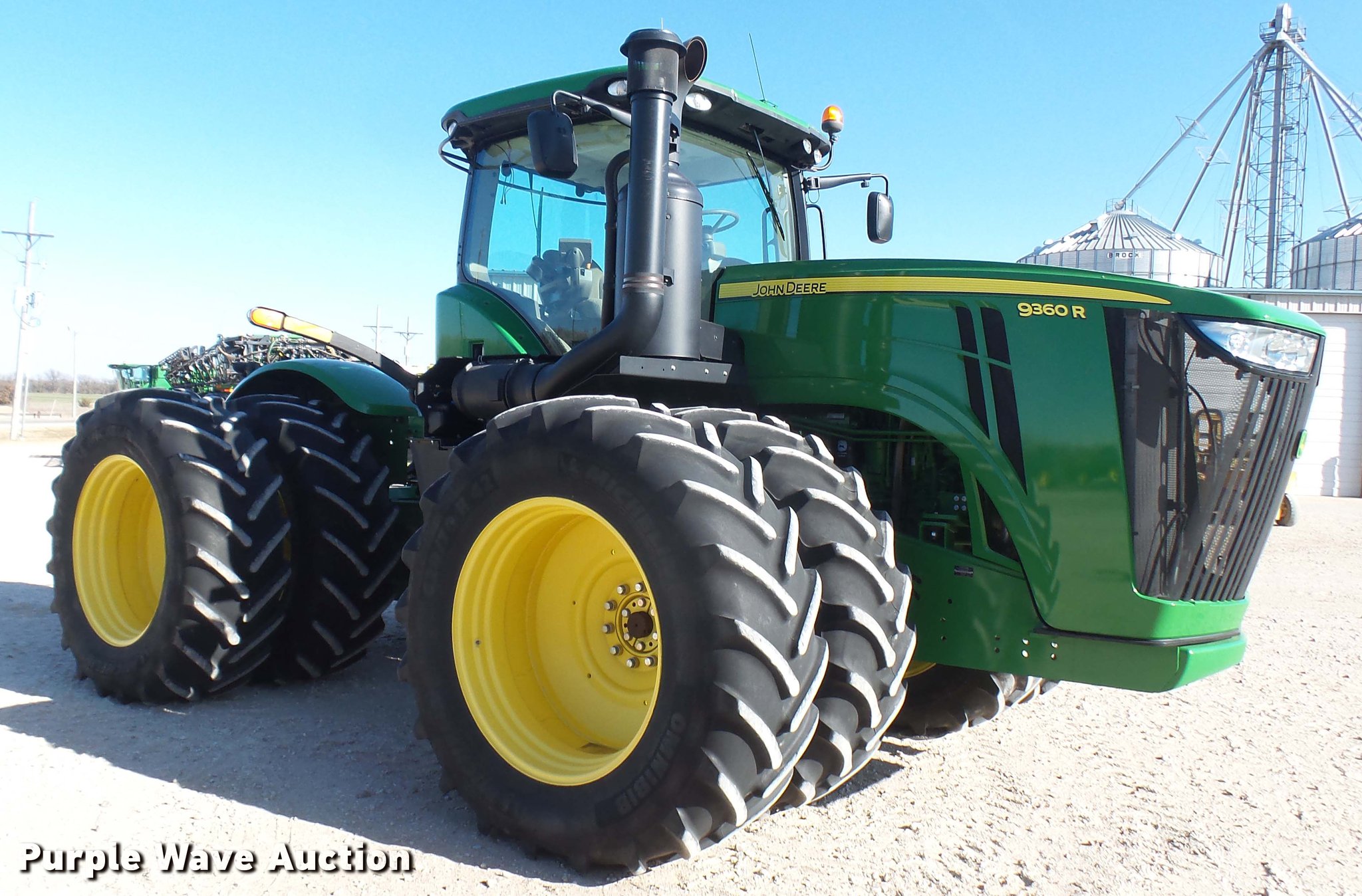 2013 John Deere 9360R 4WD tractor. 2,156 hours on meter, John Deere 6090RW403 9.0L six cylinder turbo diesel engine Serial RG6090R053815, John Deere Powershift transmission 18F-6R gears, Differential lock, AC and heat, AM/FM/CD, Power mirrors, Air suspension seat, Instructor's seat, Tilt steering wheel, Shades, Block heater, Seven pin outlet, ISO electrical outlet, (5) rear hydraulic remote sets, Power beyond hydraulics, (1) inner rear wheel weights, 620/70R42 dual tires, Manuals, Serial 1RW9360RCDP008355. Knight Farms Retirement - Open inspection Feb. 7 and 12. 1750 US-56. Lyons, KS 67554