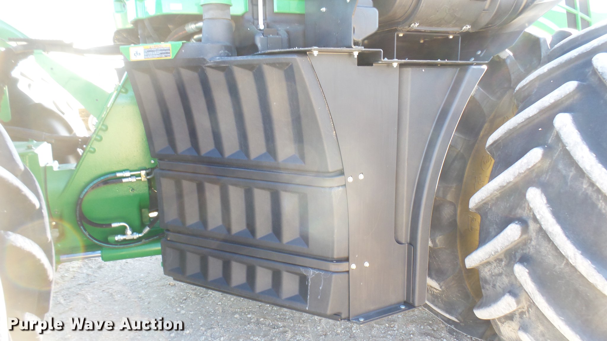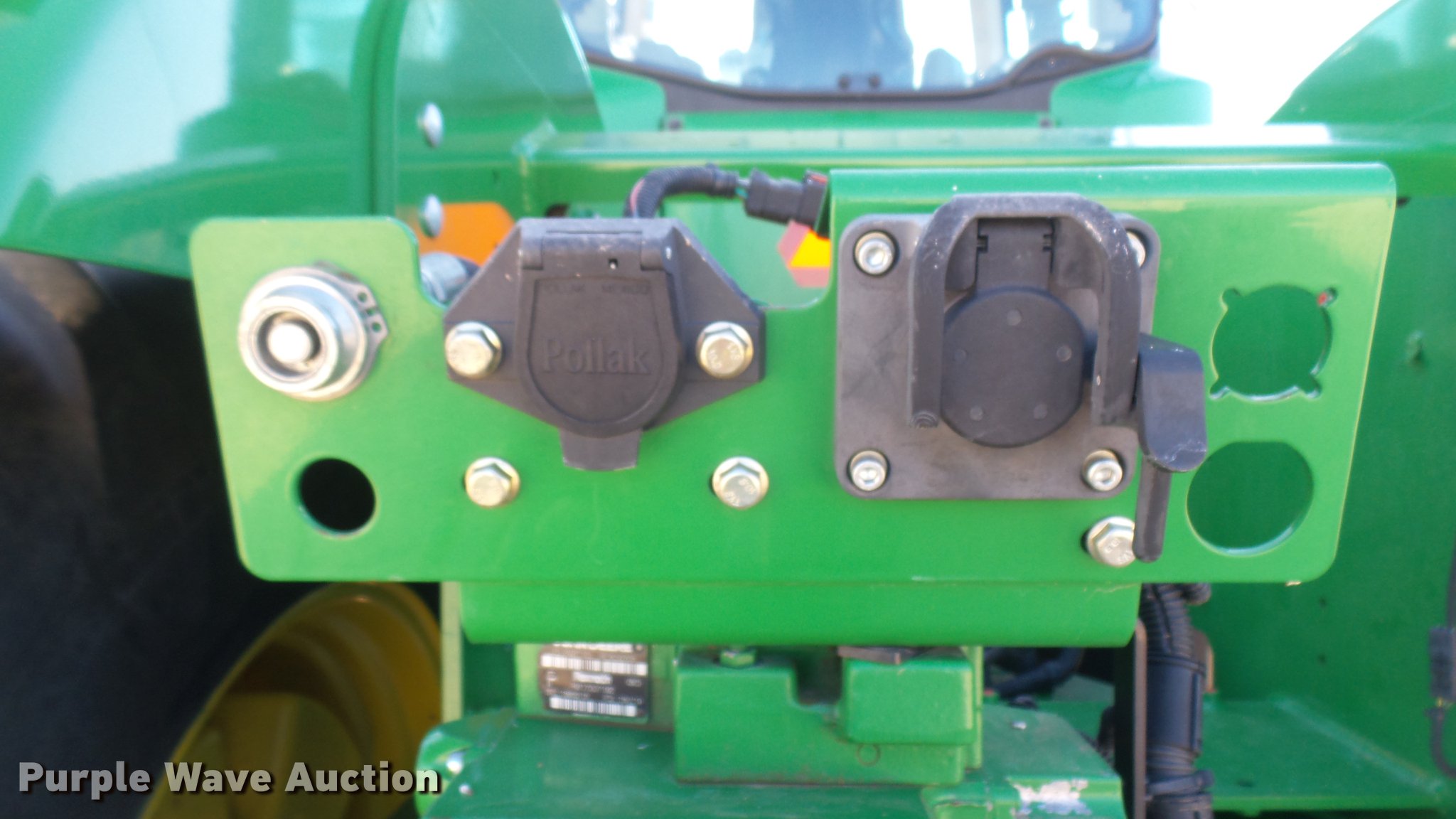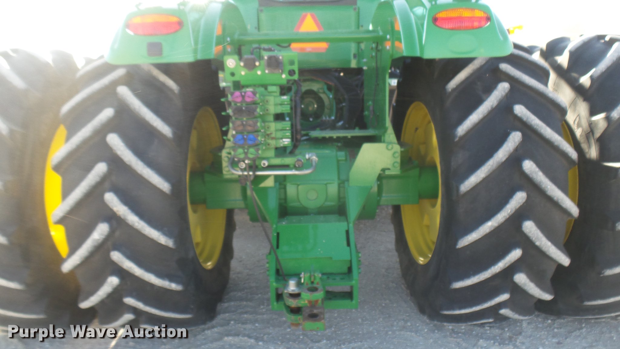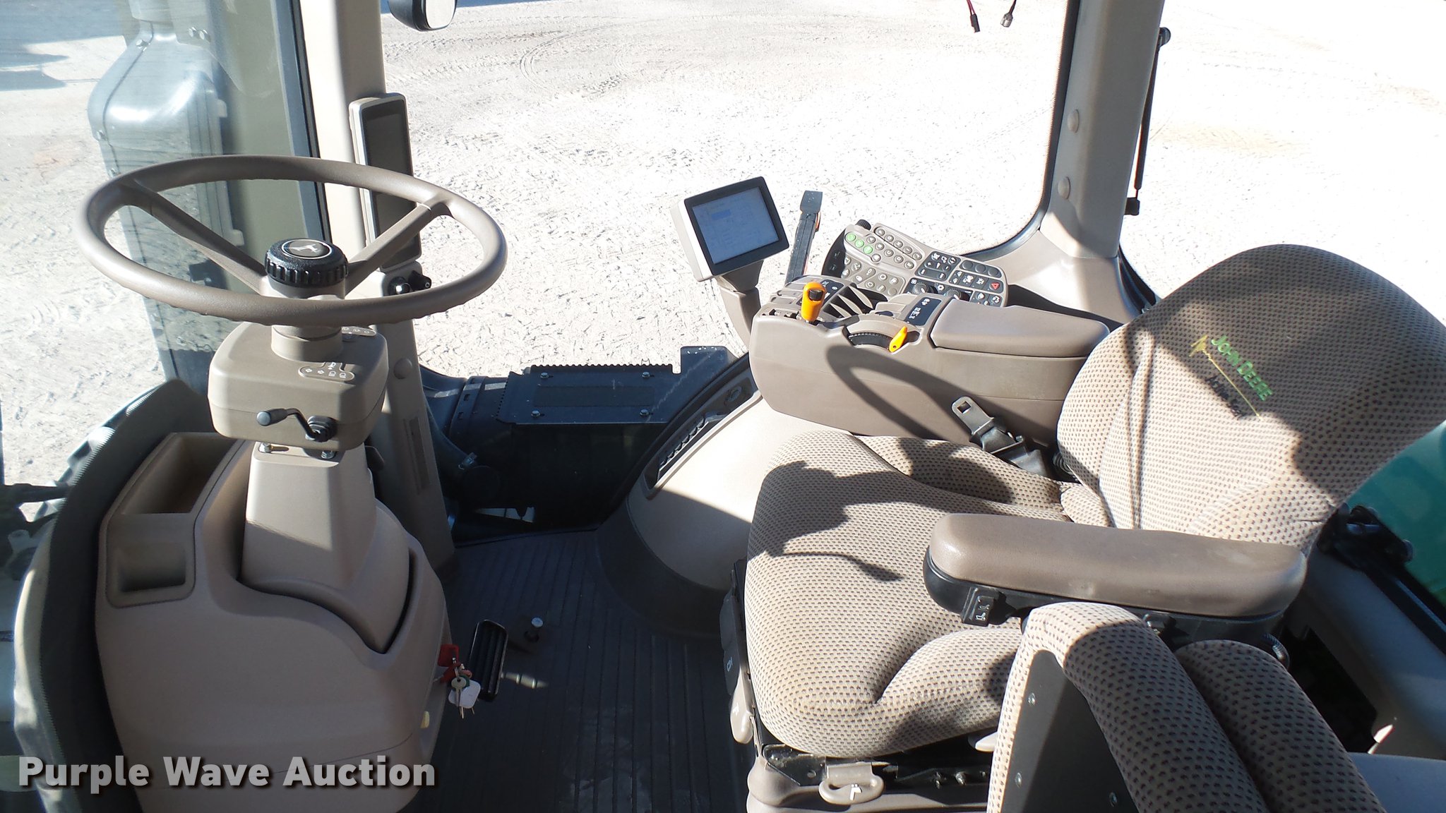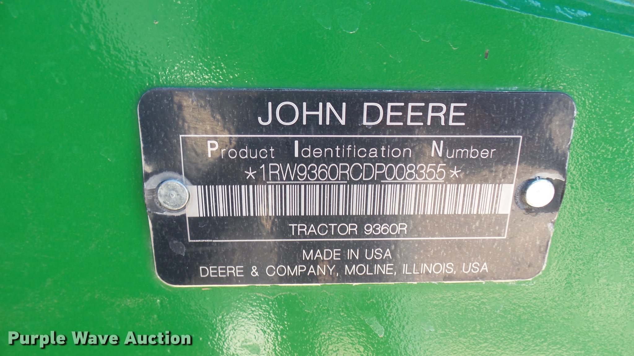 Purple Wave is selling a used Articulated 4-Wheel Drive Tractor in Kansas. This item is a 2013 John Deere 9360R 4WD tractor with the following: 2,156 hours on meter, John Deere 6090RW403 9.0L six cylinder turbo diesel engine, Serial RG6090R053815, John Deere Powershift transmission, 18F-6R gears, Differential lock, AC and heat, AM/FM/CD, Power mirrors, Air suspension seat, Instructor's seat, Tilt steering wheel, Shades, Block heater, Seven pin outlet, ISO electrical outlet, (5) rear hydraulic remote sets, Power beyond hydraulics, (1) inner rear wheel weights, 620/70R42 dual tires, Manuals, Serial 1RW9360RCDP008355
