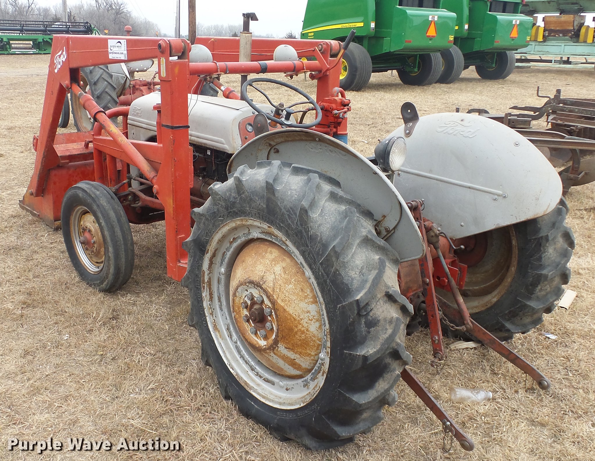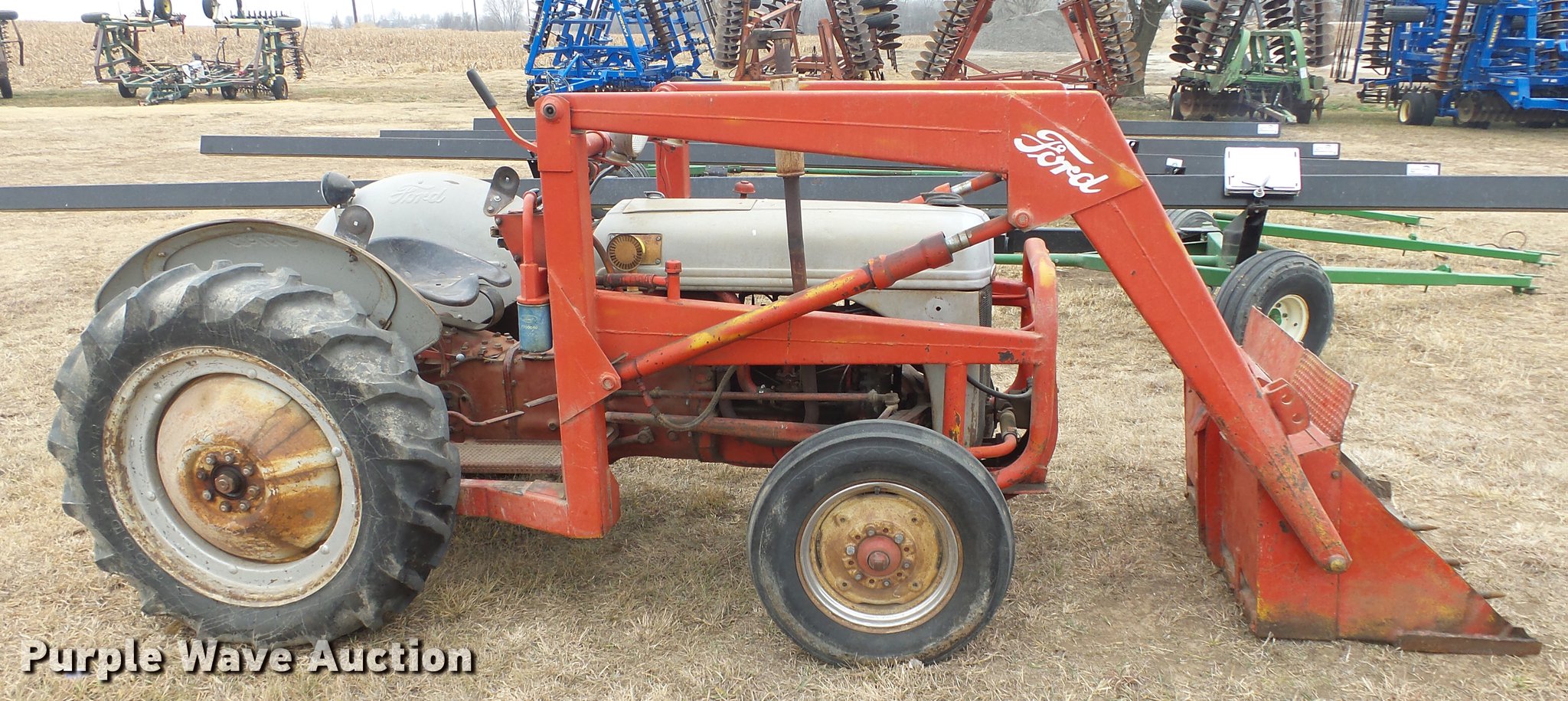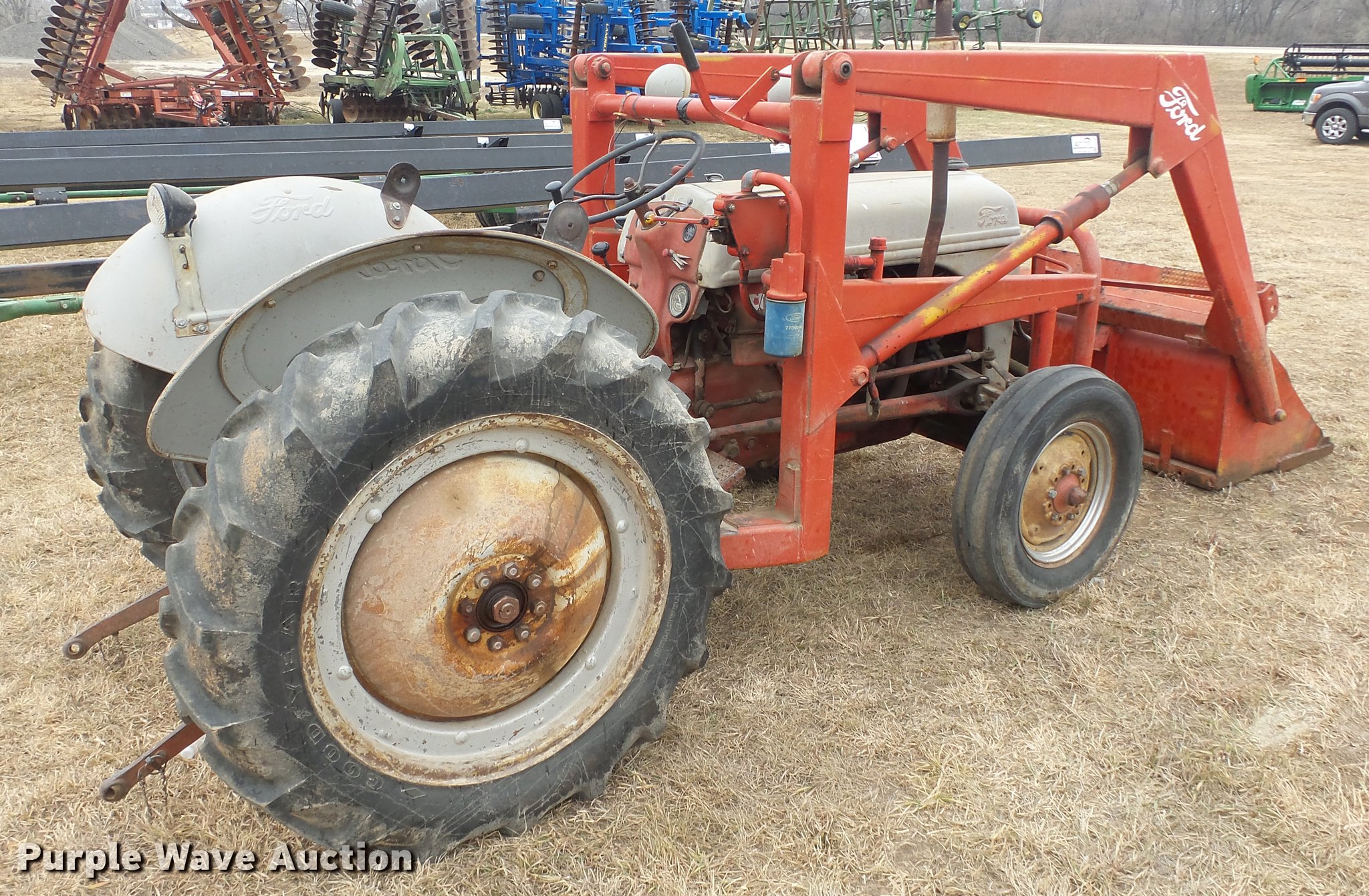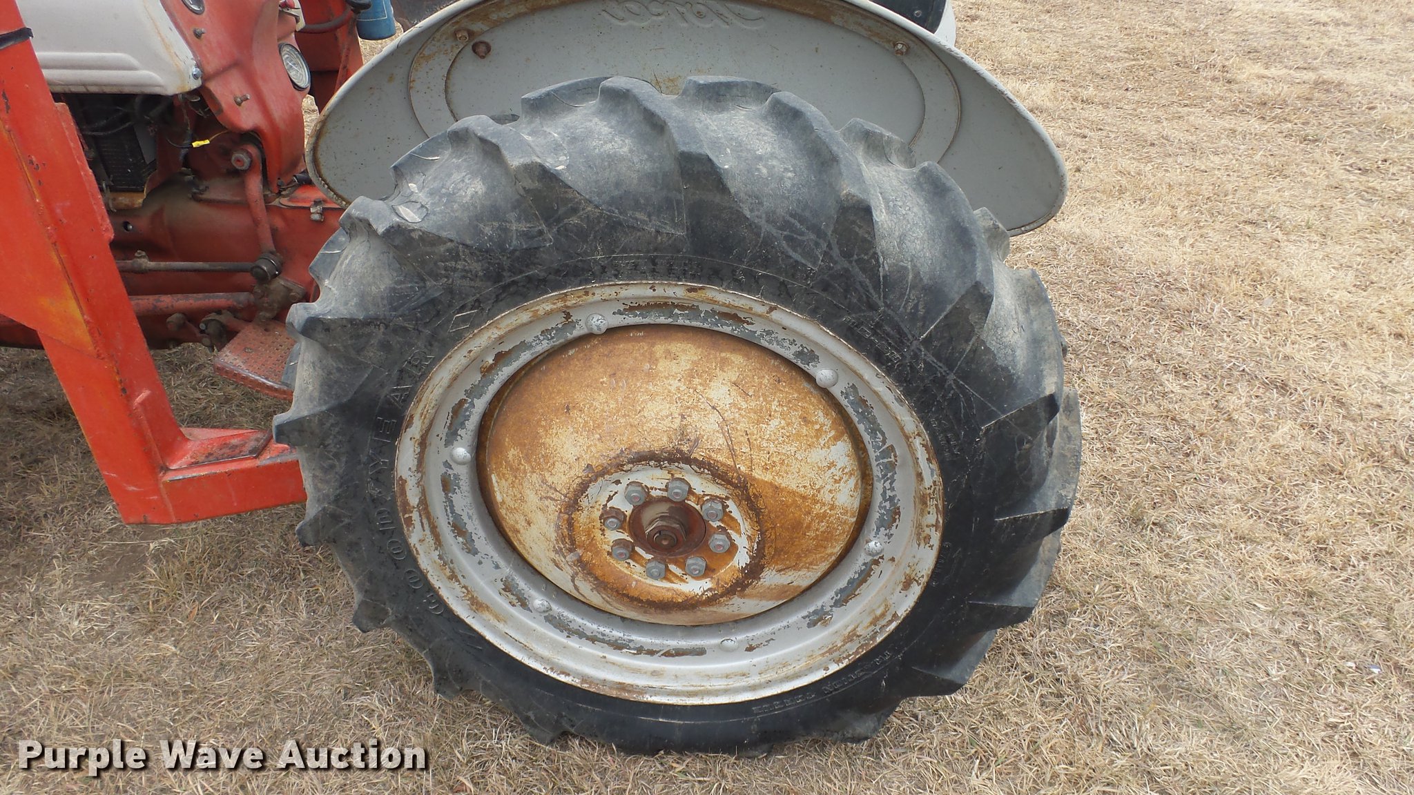 Purple Wave is selling a used Tractor in Kansas. This item is a Ford tractor with the following: 2,667 hours on meter, Four cylinder gas engine, Four speed manual transmission, Work lights, Loader, 40"W bucket, 540 PTO, 6.00-16 front tires, 11.2-28 rear tires