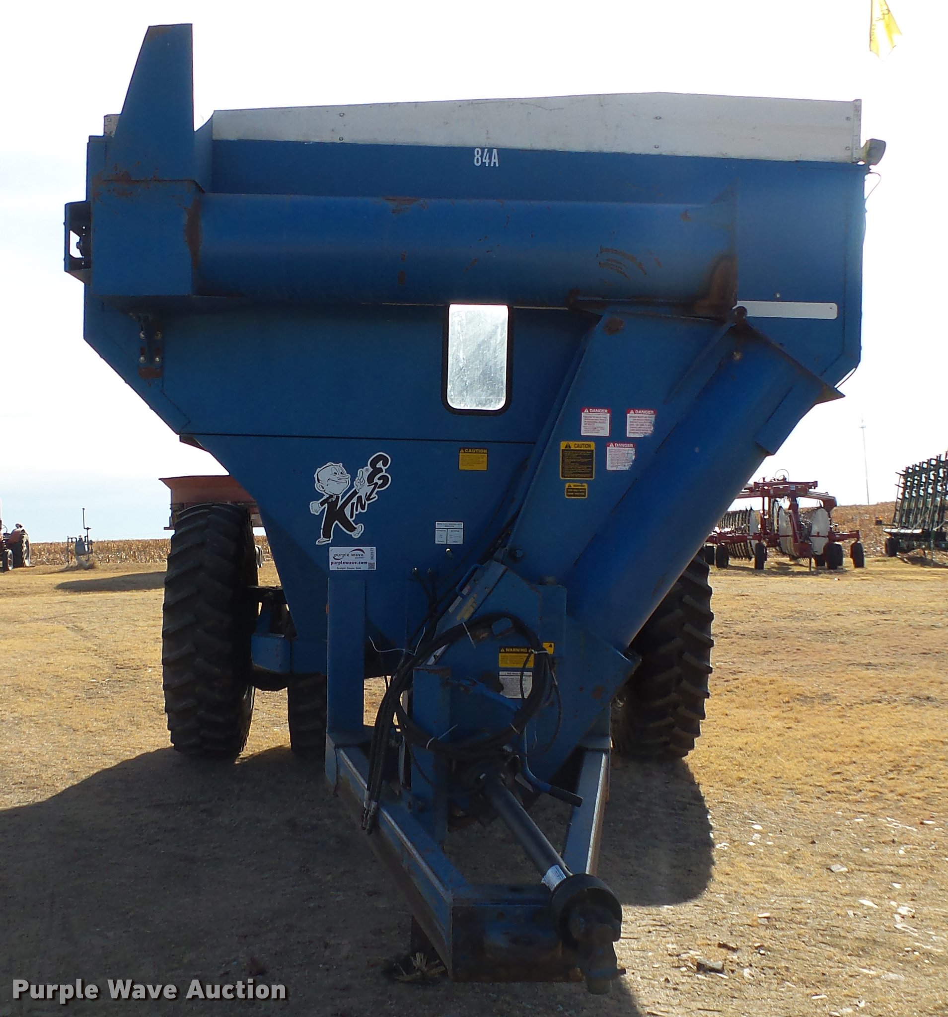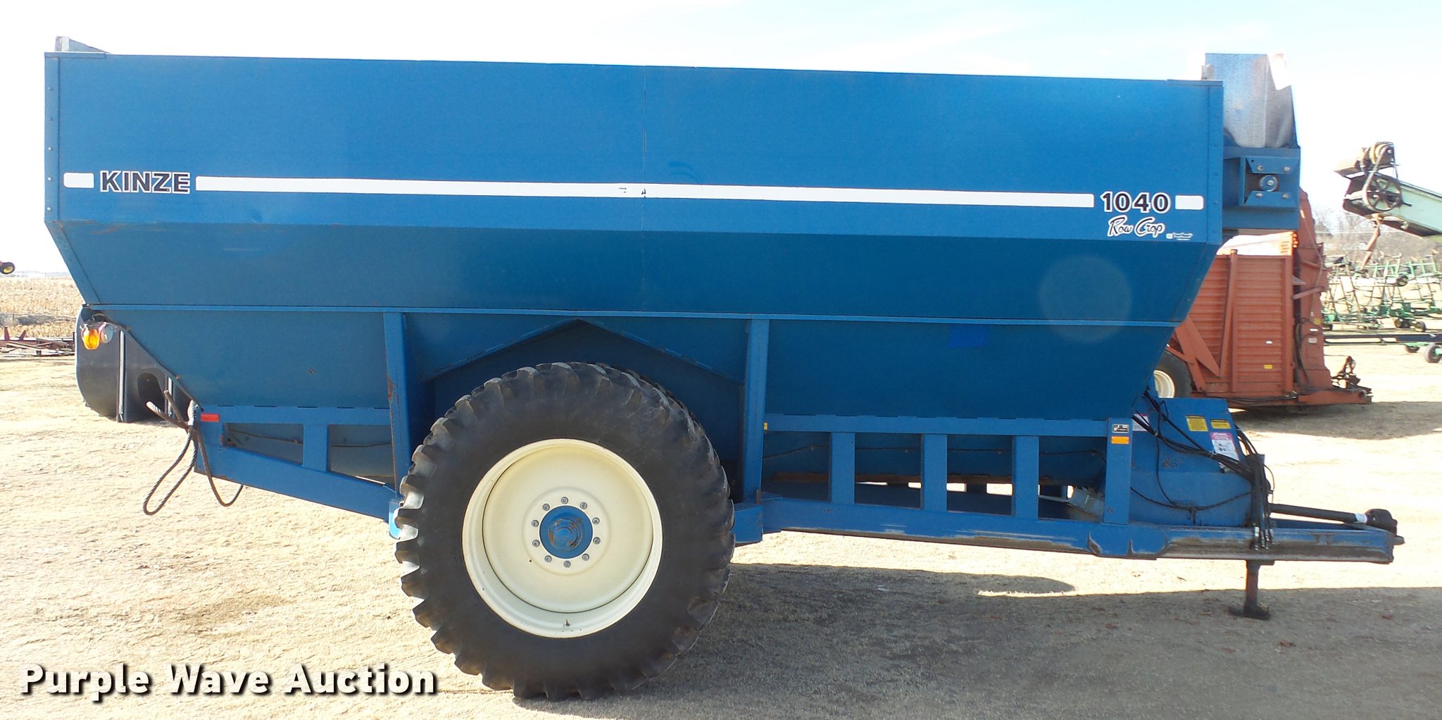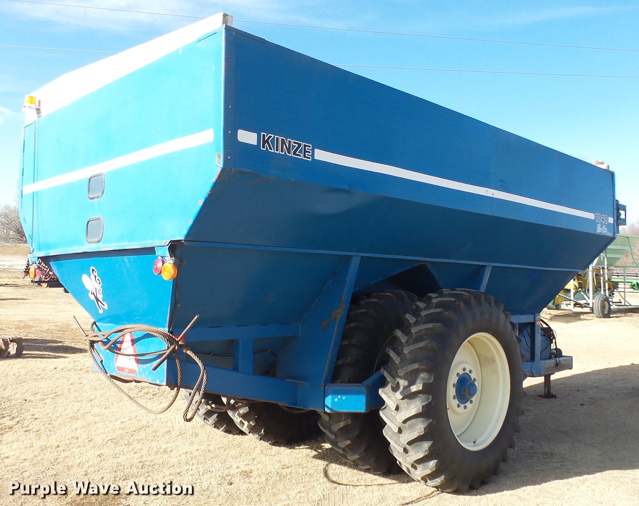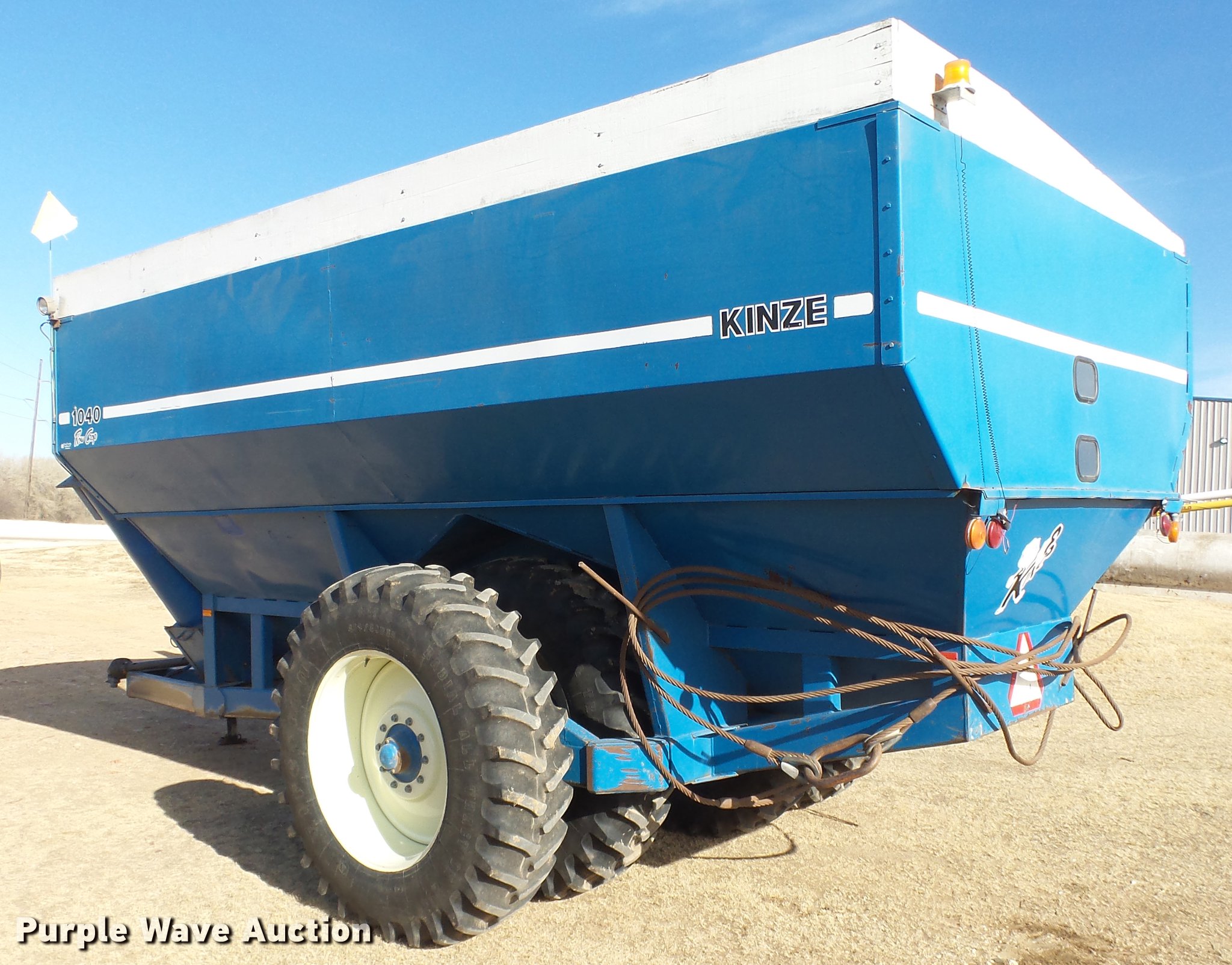 Purple Wave is selling a used Grain Cart or Gravity Wagon in Kansas. This item is a Kinze AW1040 row crop grain cart with the following: 1,000 bushel capacity, Approx. 12'L x 16" diameter unloading auger, Beacon light, Lights, Sight glass, Tip-top boards, Snatch cable, Large 1000 PTO, Pin hitch, Walking tandem axle, 480/80R38 tires, Serial 2636