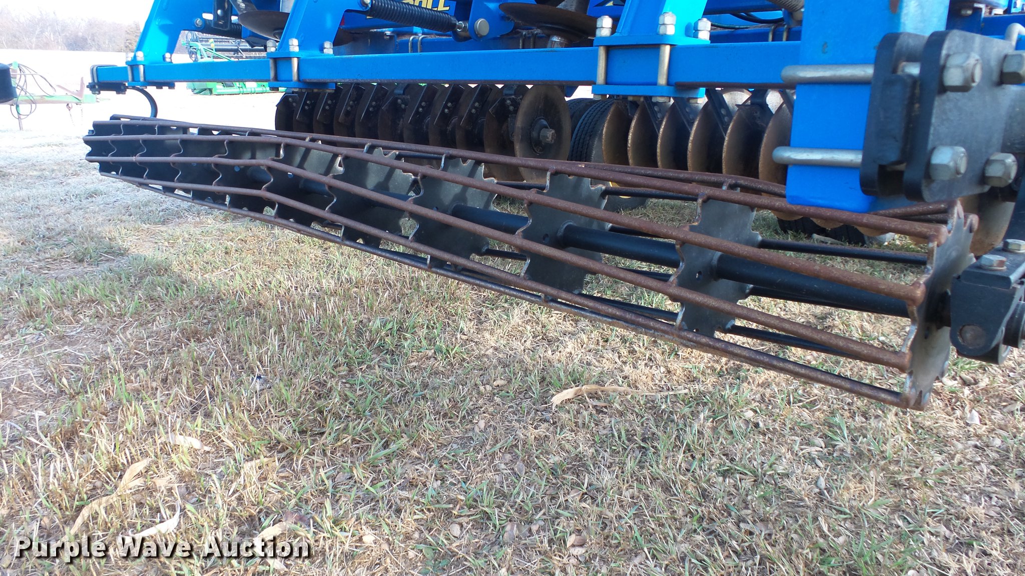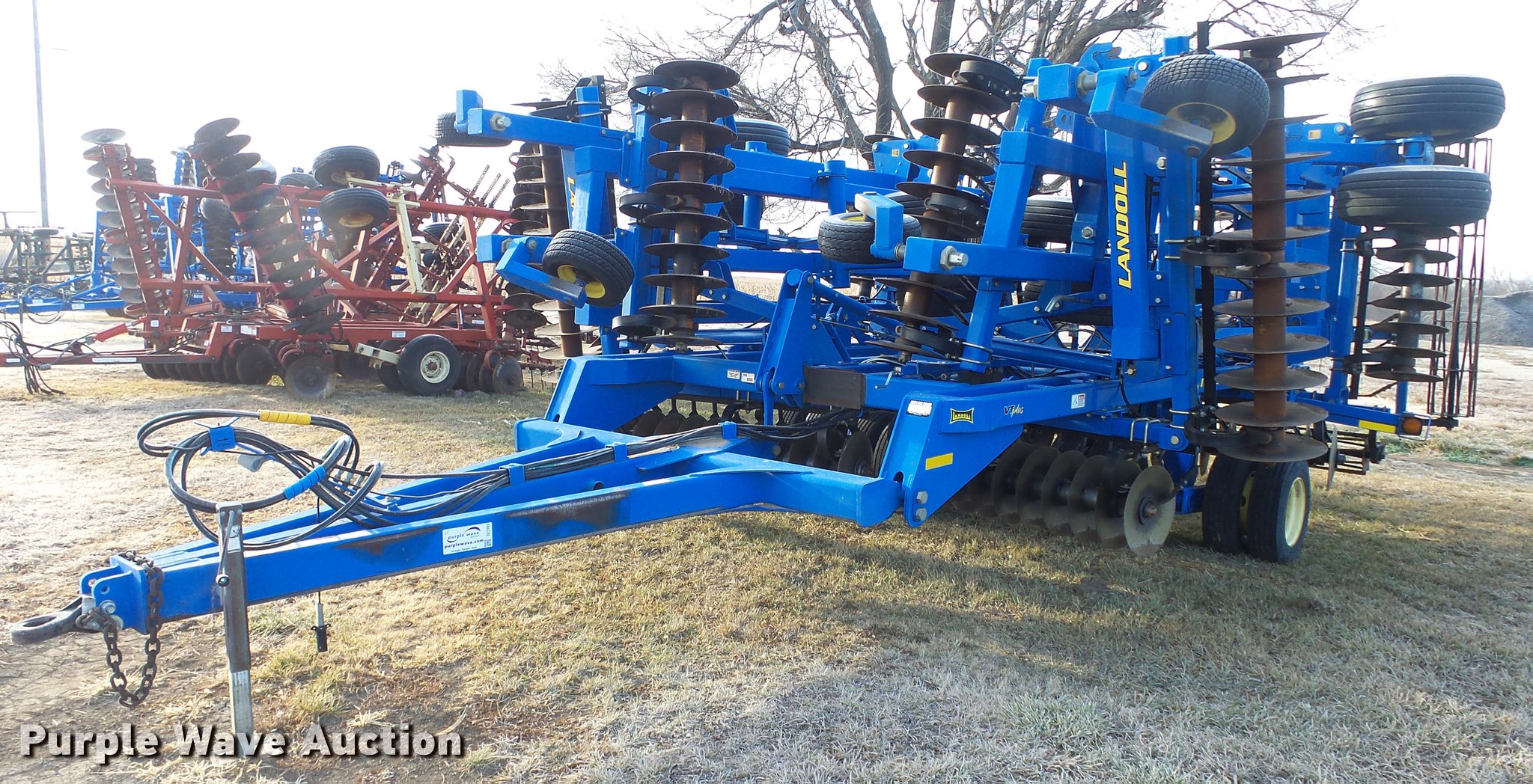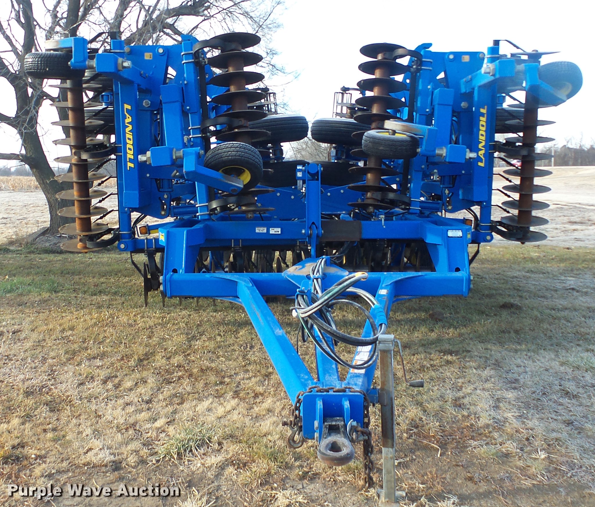 Purple Wave is selling a used Vertical Tillage in Kansas. This item is a 2013 Landoll 7450-39 VT Plus vertical tillage with the following: Appox. 28'W overall, 19" front blade diameter, 20" rear blade diameter, 7" spacing, Disk scrapers, Round bar rolling basket, Hydraulic lift and fold, Transport lights, Hydraulic leveler, Pin/clevis hitch, Double walking tandem axle, (8) 235/75R17.5 main tires, (8) 12.5L-15 wing tires, (4) 20.5x8.0-10 gauge wheels, Serial 74E1304609