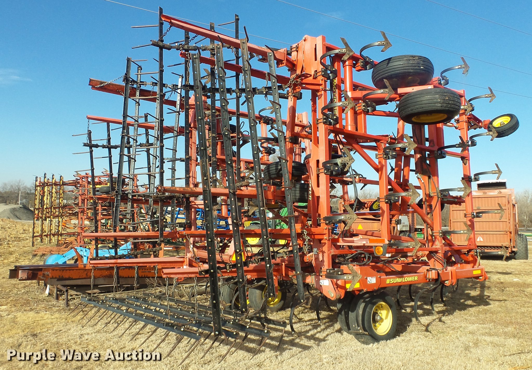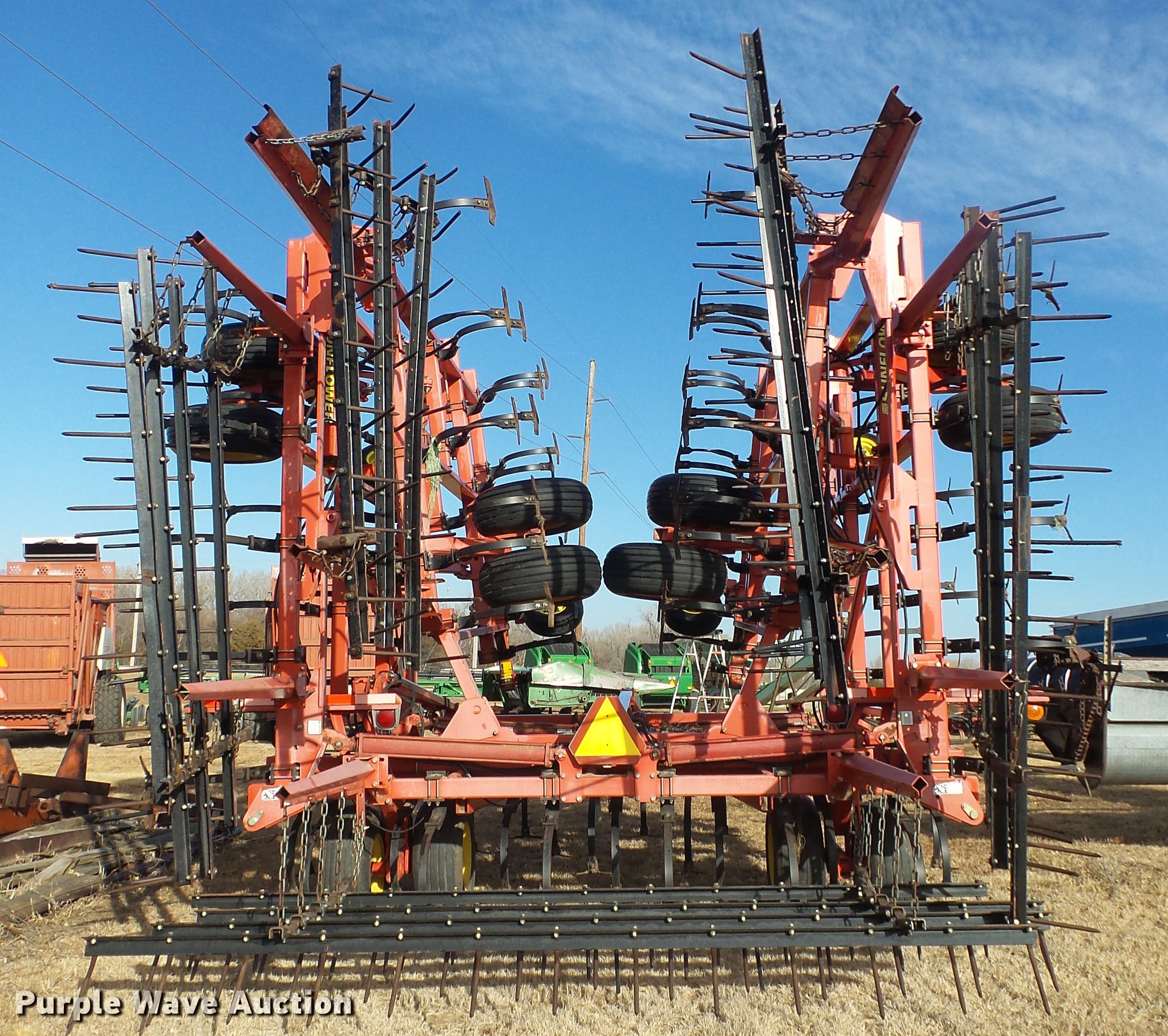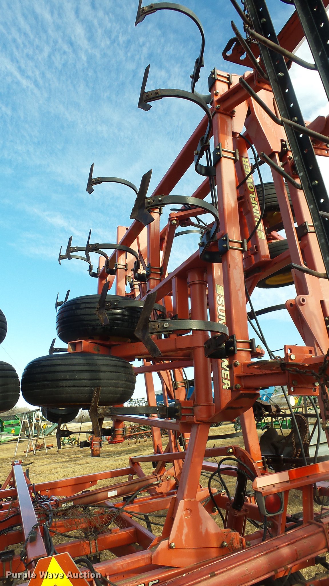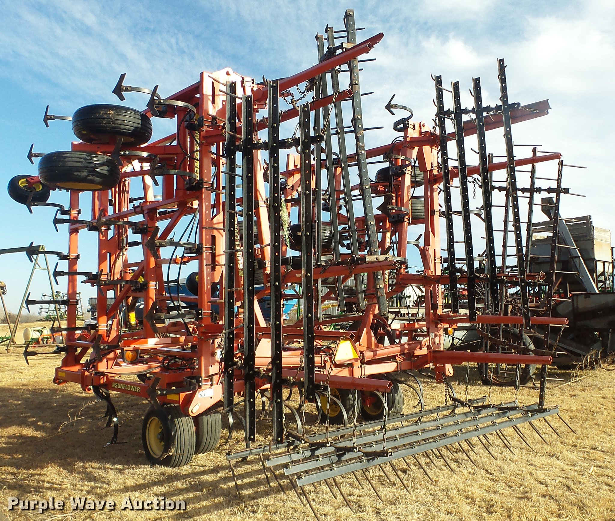 Purple Wave is selling a used Field Cultivator or Sweep Plow in Kansas. This item is a 2006 Sunflower 5055-50 field cultivator with the following: Approx. 50'W, 10" sweep width, 6" spacing, Four bar spike tooth harrow, Manual leveler, Hydraulic lift and fold, Transport lights, Pin/clevis hitch, Walking tandem axle, (4) gauge wheels, (12) 11L-15 tires, Serial 5055H06025