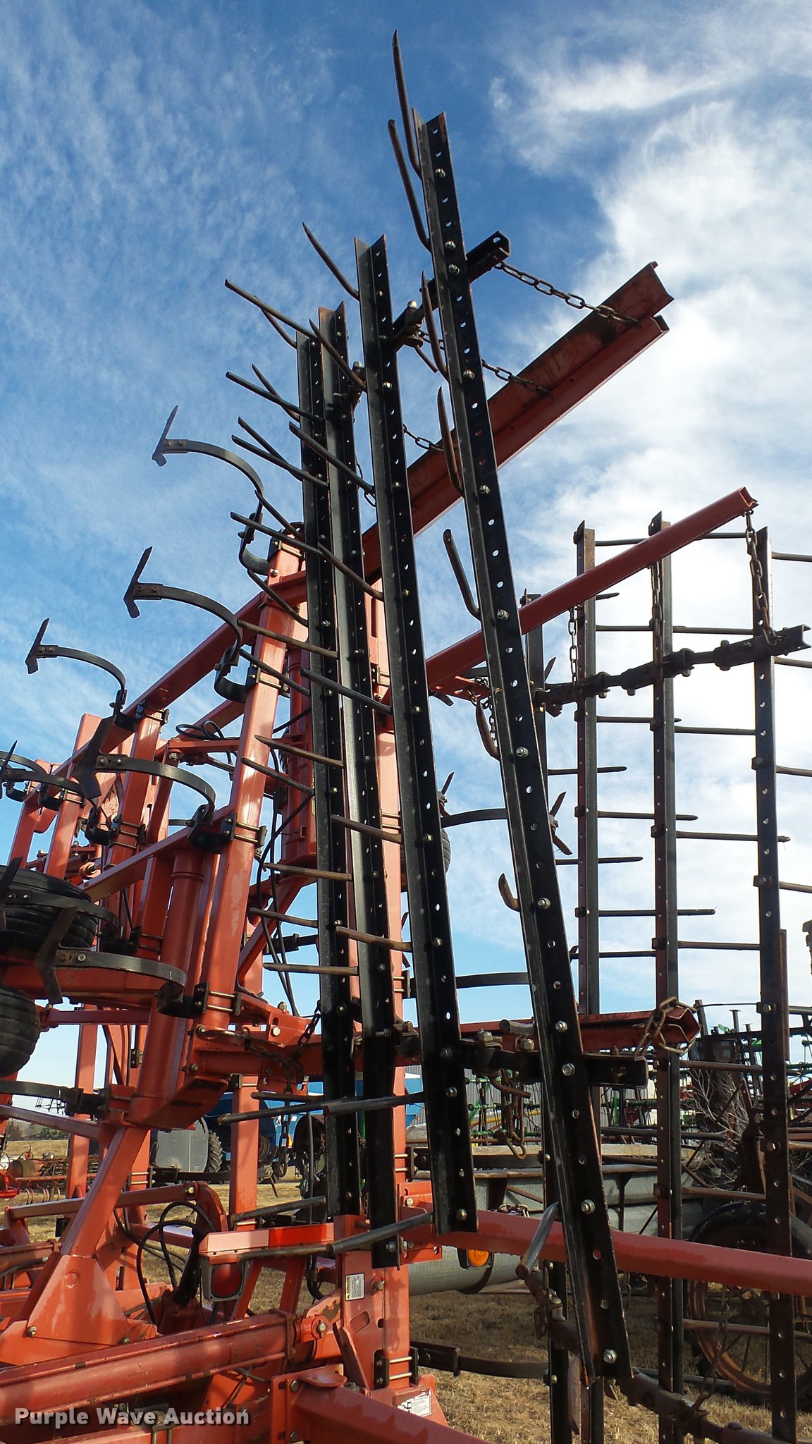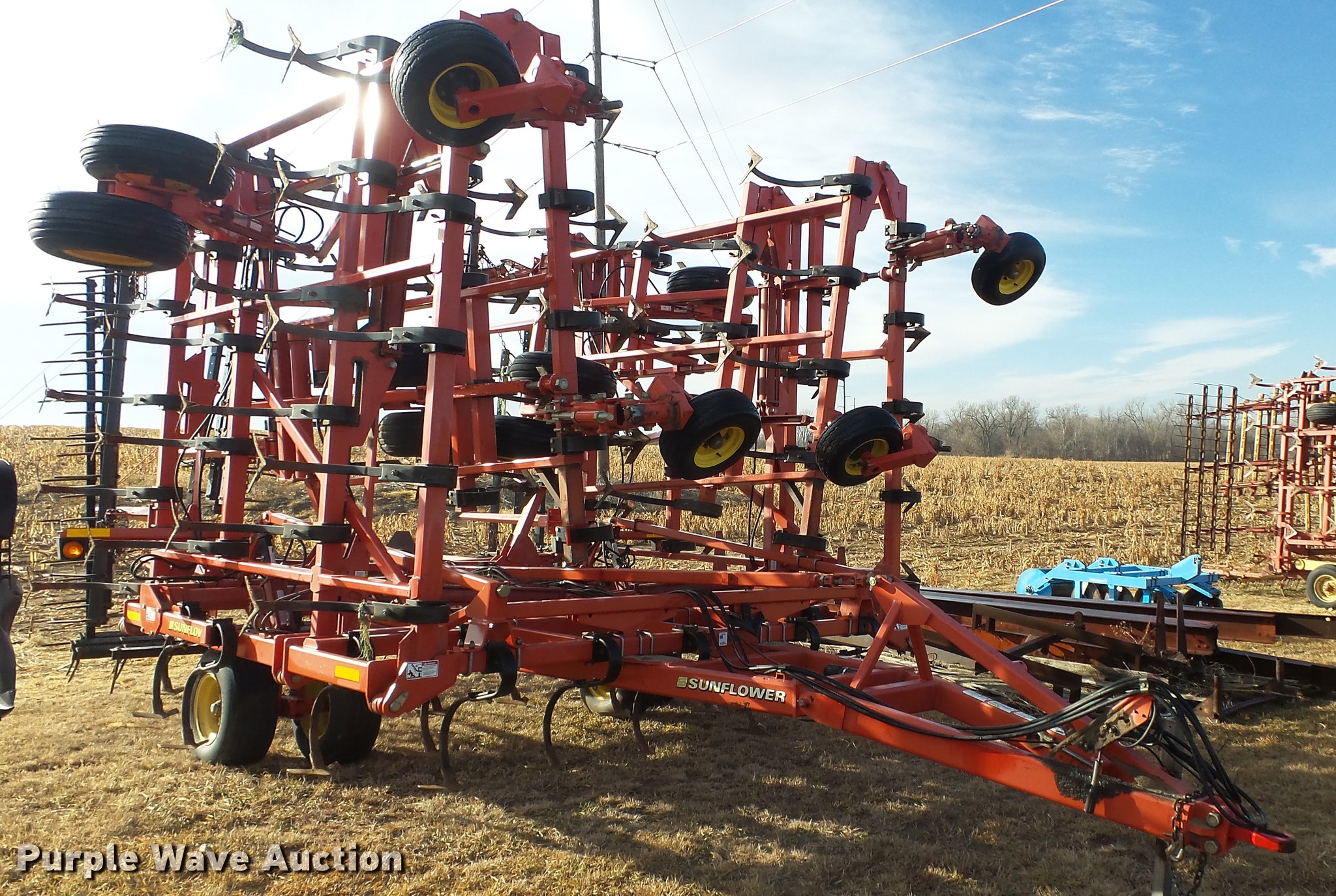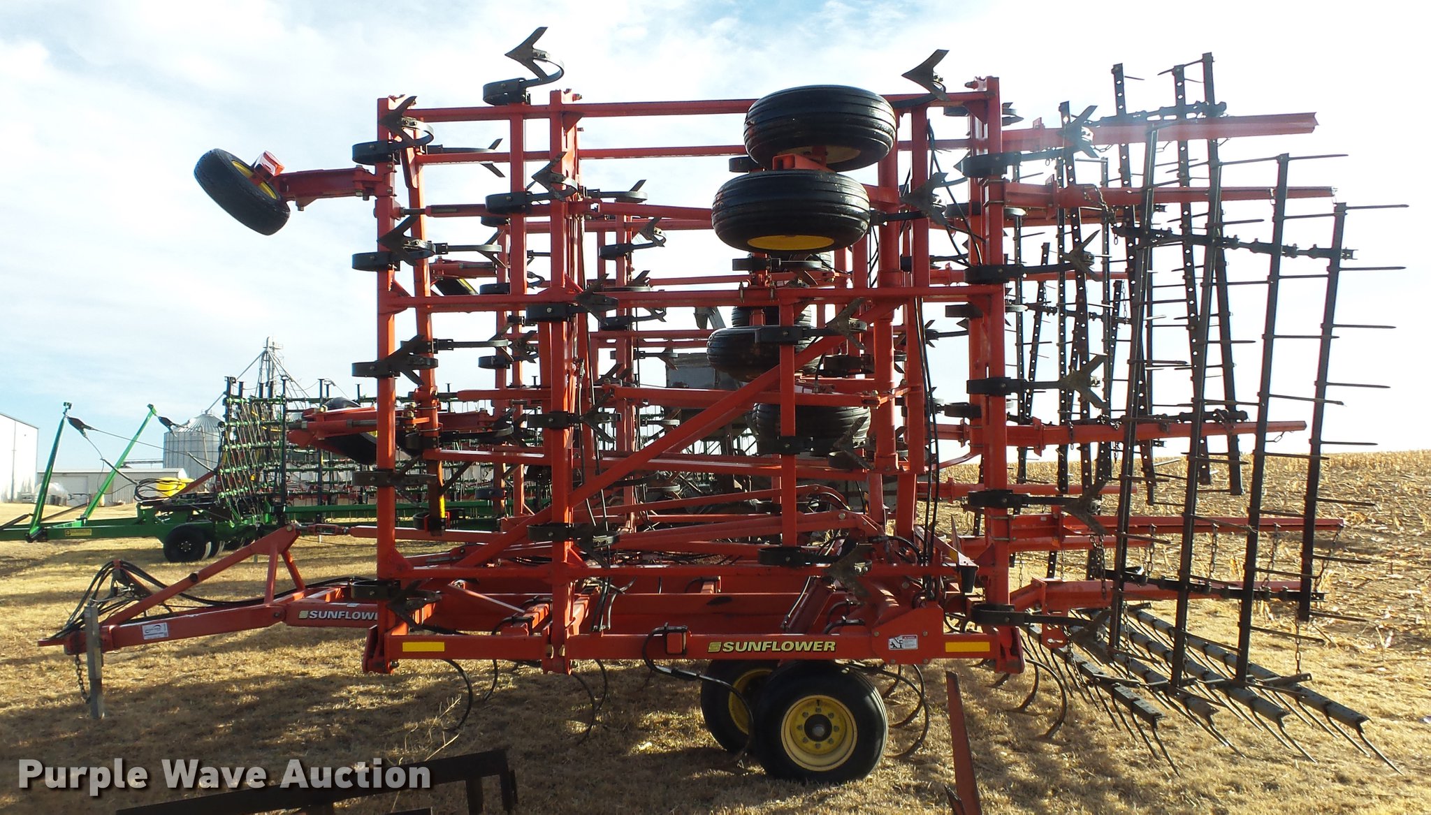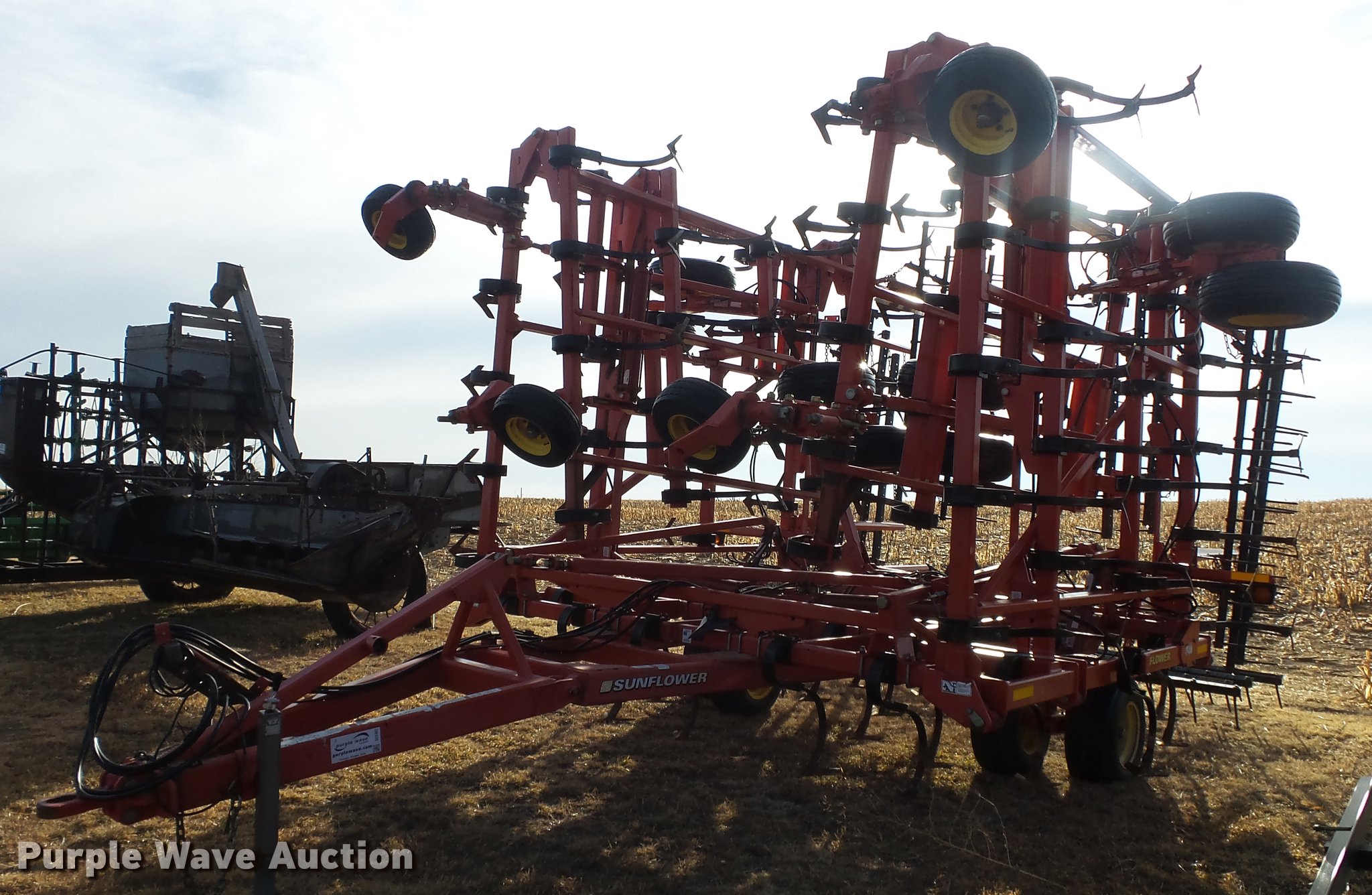Purple Wave is selling a used Field Cultivator or Sweep Plow in Kansas. This item is a 2006 Sunflower 5055-50 field cultivator with the following: Approx. 50'W, 10" sweep width, 6" spacing, Four bar spike tooth harrow, Manual leveler, Hydraulic lift and fold, Transport lights, Pin/clevis hitch, Walking tandem axle, (4) gauge wheels, (12) 11L-15 tires, Serial 5055H06025