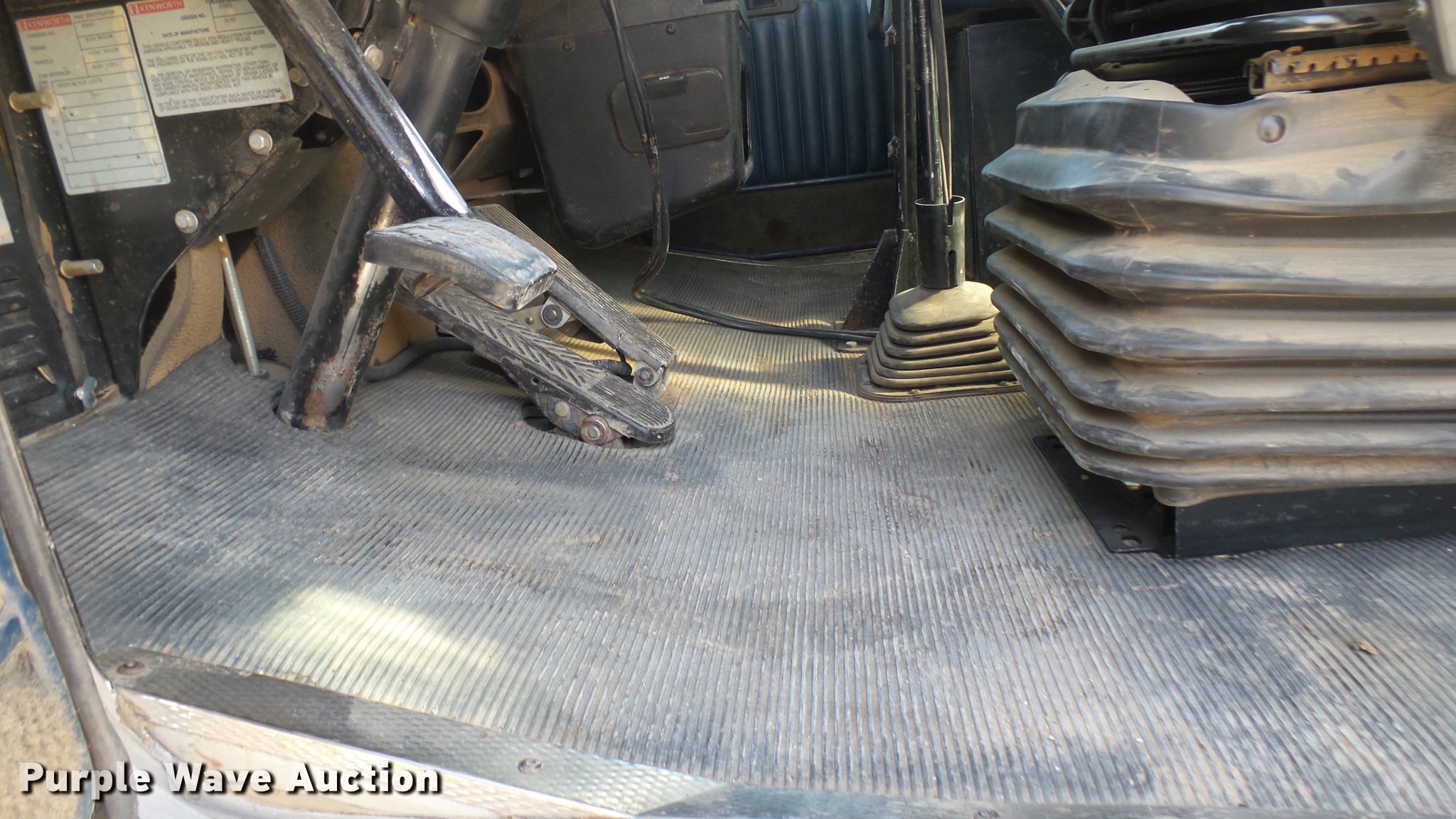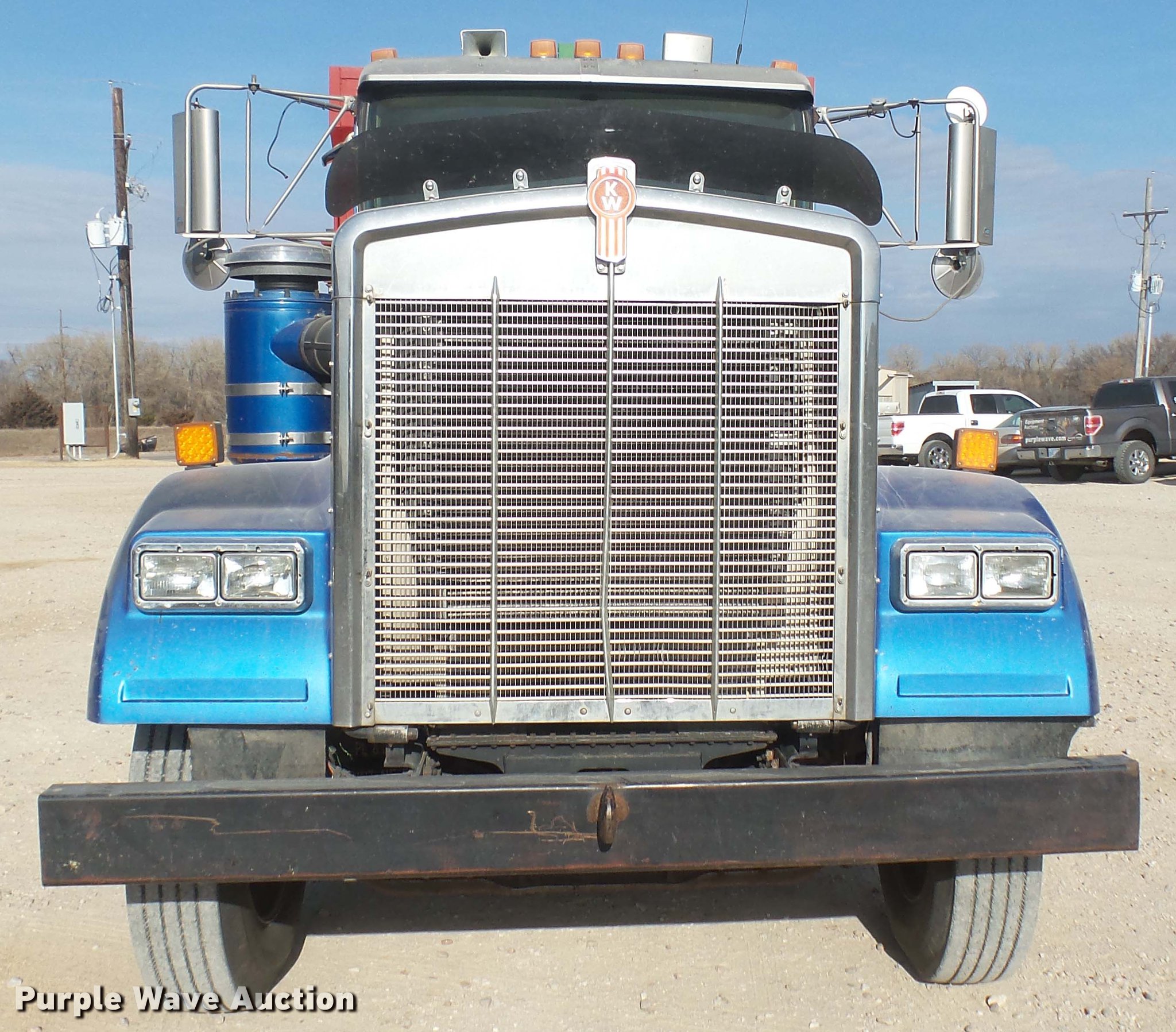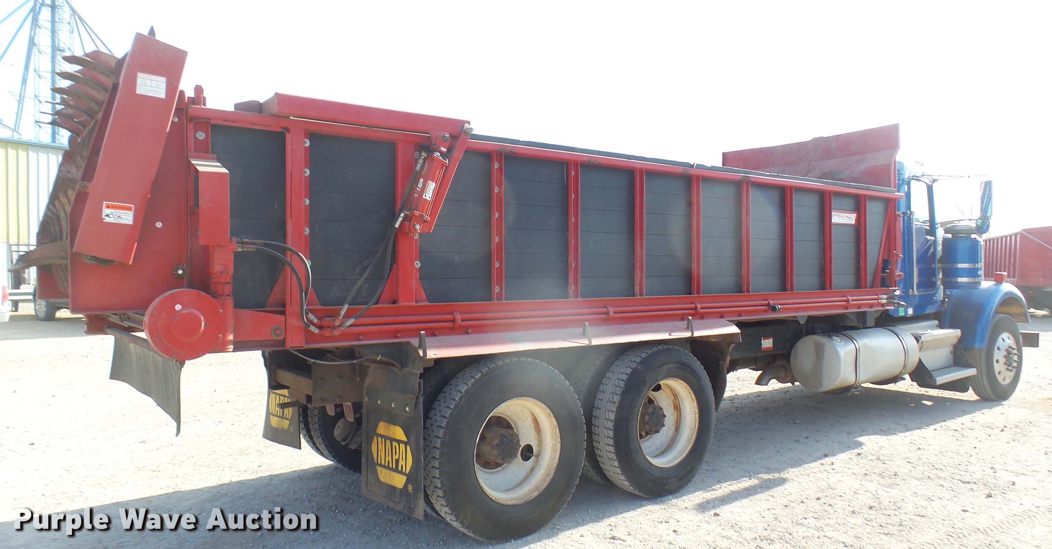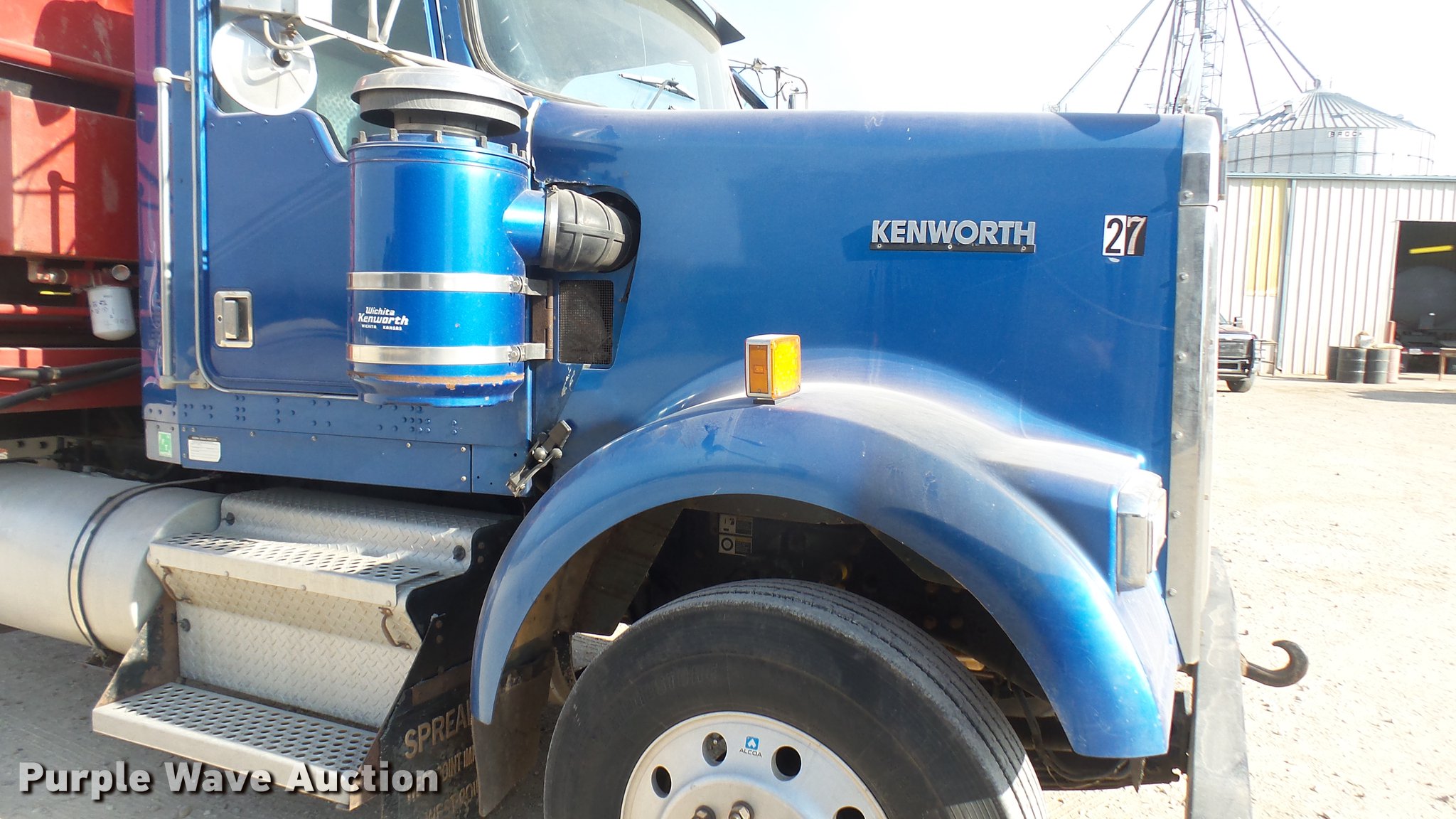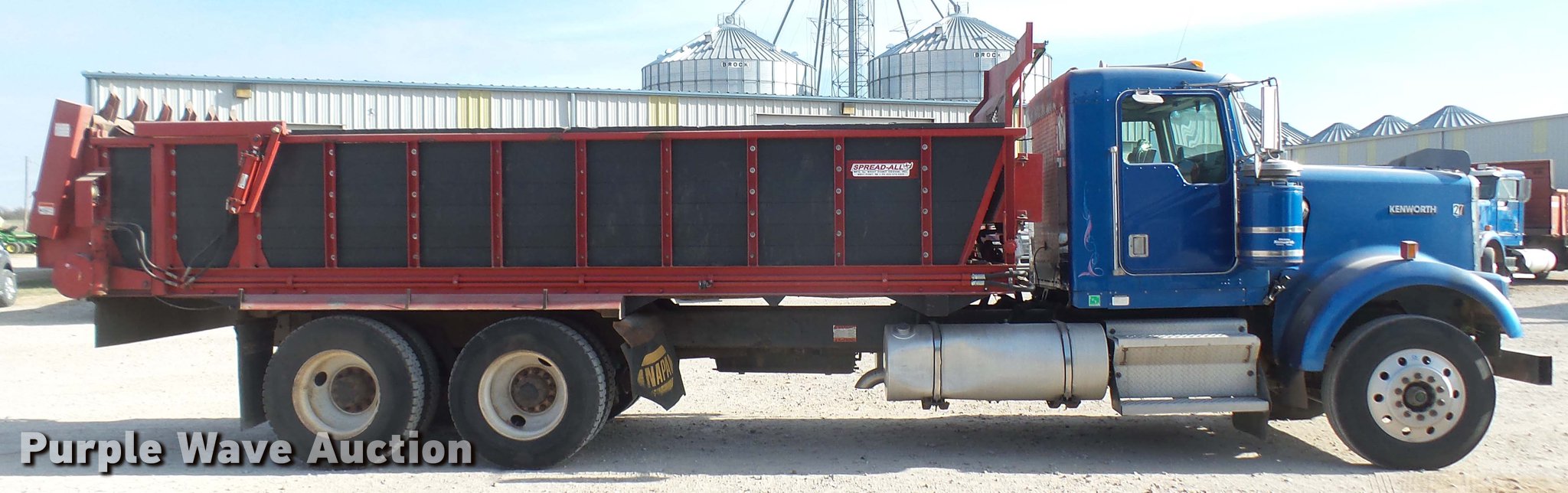 Purple Wave is selling a used Applicator Truck in Kansas. This item is a 2000 Kenworth W900 manure spreader truck with the following: 754,721 miles on odometer, 537 hours on spreader meter, 3,146 hours on replaced meter, Caterpillar C15 14.6L L6 turbo diesel engine, 475 HP, Serial 6NZ06495, 13 speed manual transmission, Model RTL018913A, Inter-axle differential lock, Tandem axle, AC and heat, Tilt, Cruise, AM/FM/CD, Power heated mirrors, Air suspension seat, In-cab Spread-All controls, Air ride cab, PTO, Exterior visor, Spread-All TK22T spreader bed, 22'L, Horizontal beater, Hydraulic drive, Composite floor and walls, Serial 08071084, Front tow hook, Mud flaps, Dual fuel tanks, Rear exhaust stack, 3:70 gear ratio, 272" wheelbase, Double frame, Air suspension, Air brakes, Engine brake, 11R24.5 tires, GVWR 52,860 lbs, FAWR 12,860 lbs, IAWR 20,000 lbs, RAWR 20,000 lbs, Windshield cracked, Unit# 27