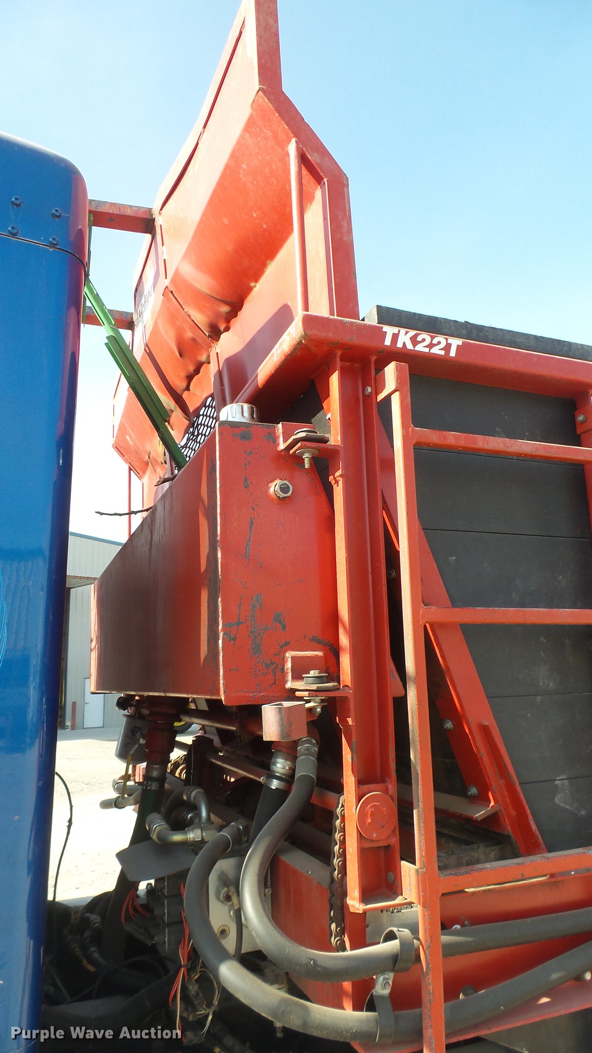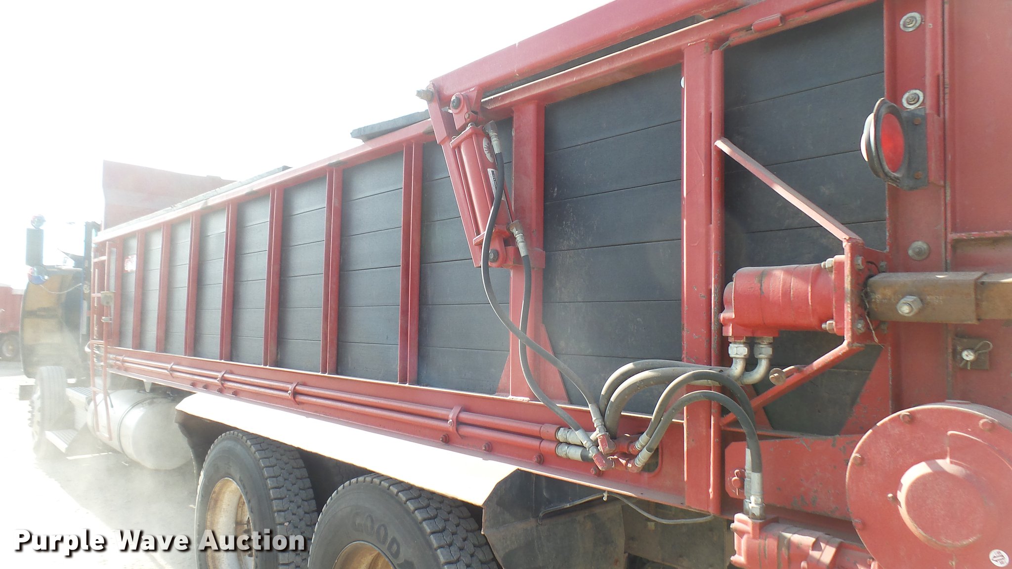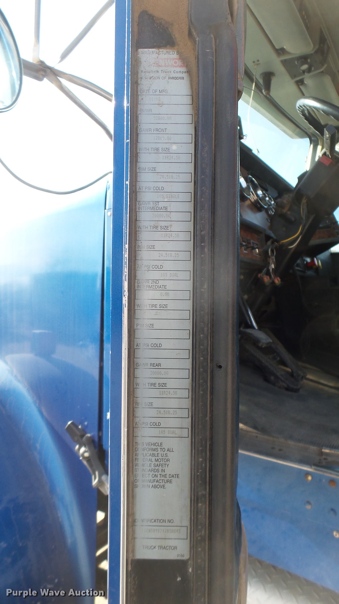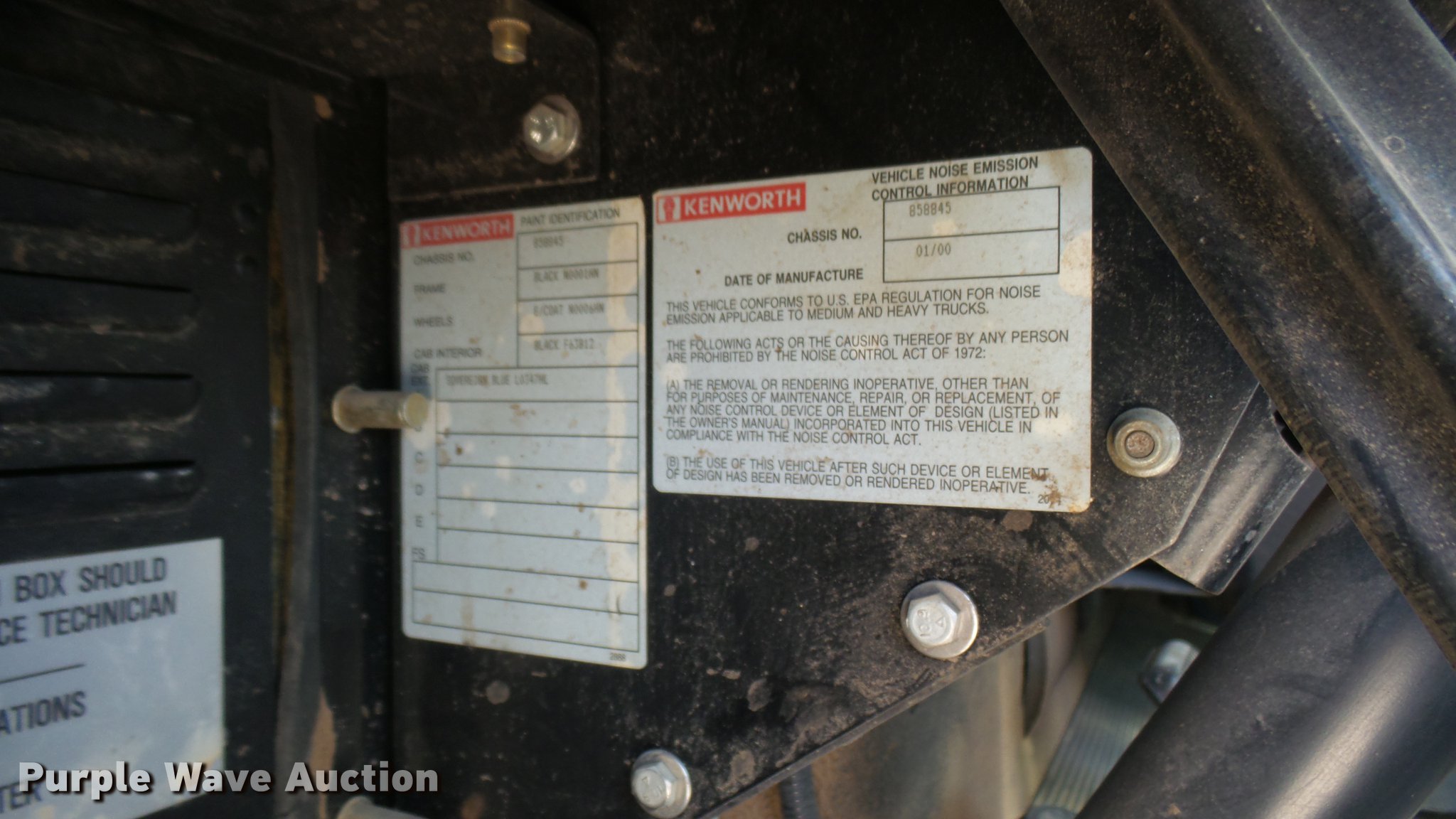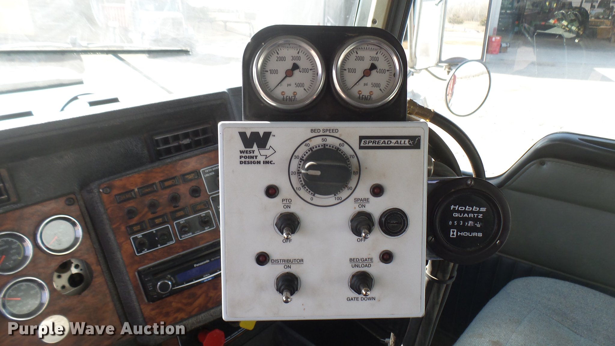 Purple Wave is selling a used Applicator Truck in Kansas. This item is a 2000 Kenworth W900 manure spreader truck with the following: 754,721 miles on odometer, 537 hours on spreader meter, 3,146 hours on replaced meter, Caterpillar C15 14.6L L6 turbo diesel engine, 475 HP, Serial 6NZ06495, 13 speed manual transmission, Model RTL018913A, Inter-axle differential lock, Tandem axle, AC and heat, Tilt, Cruise, AM/FM/CD, Power heated mirrors, Air suspension seat, In-cab Spread-All controls, Air ride cab, PTO, Exterior visor, Spread-All TK22T spreader bed, 22'L, Horizontal beater, Hydraulic drive, Composite floor and walls, Serial 08071084, Front tow hook, Mud flaps, Dual fuel tanks, Rear exhaust stack, 3:70 gear ratio, 272" wheelbase, Double frame, Air suspension, Air brakes, Engine brake, 11R24.5 tires, GVWR 52,860 lbs, FAWR 12,860 lbs, IAWR 20,000 lbs, RAWR 20,000 lbs, Windshield cracked, Unit# 27