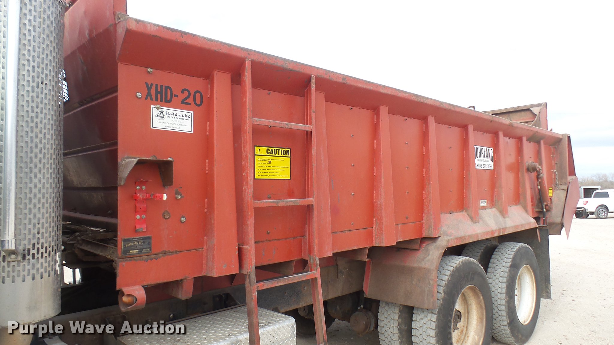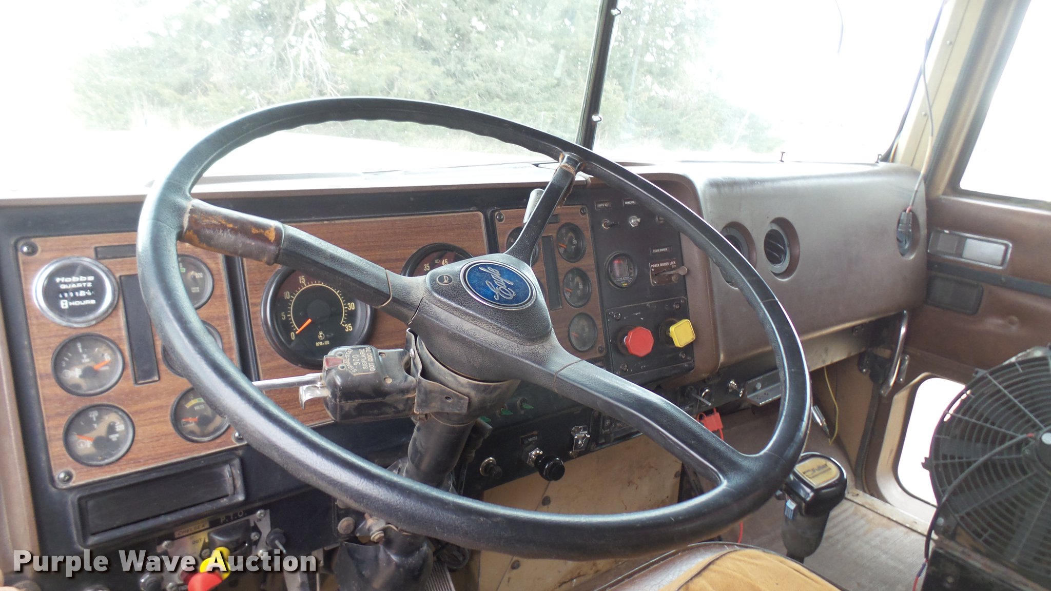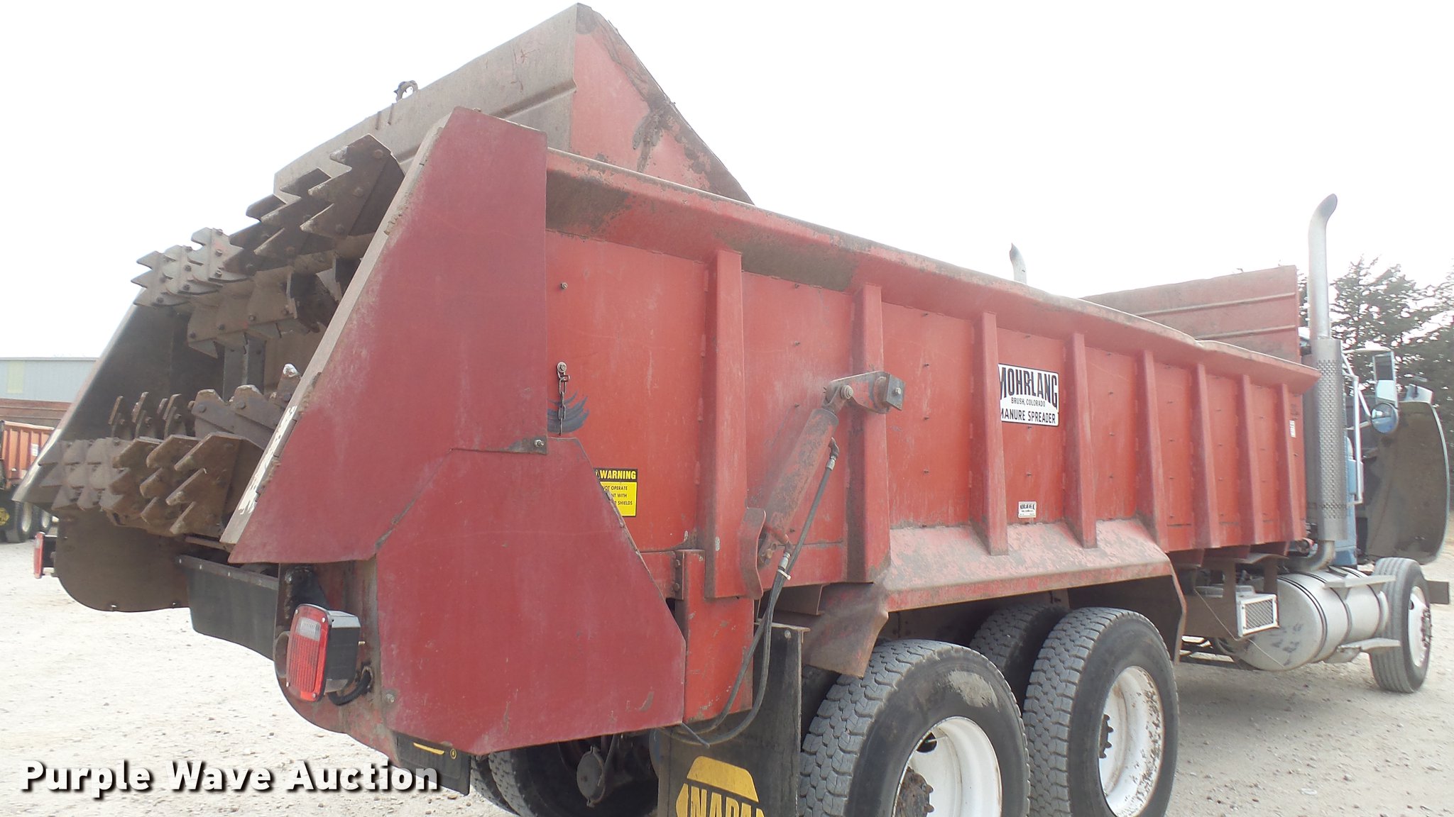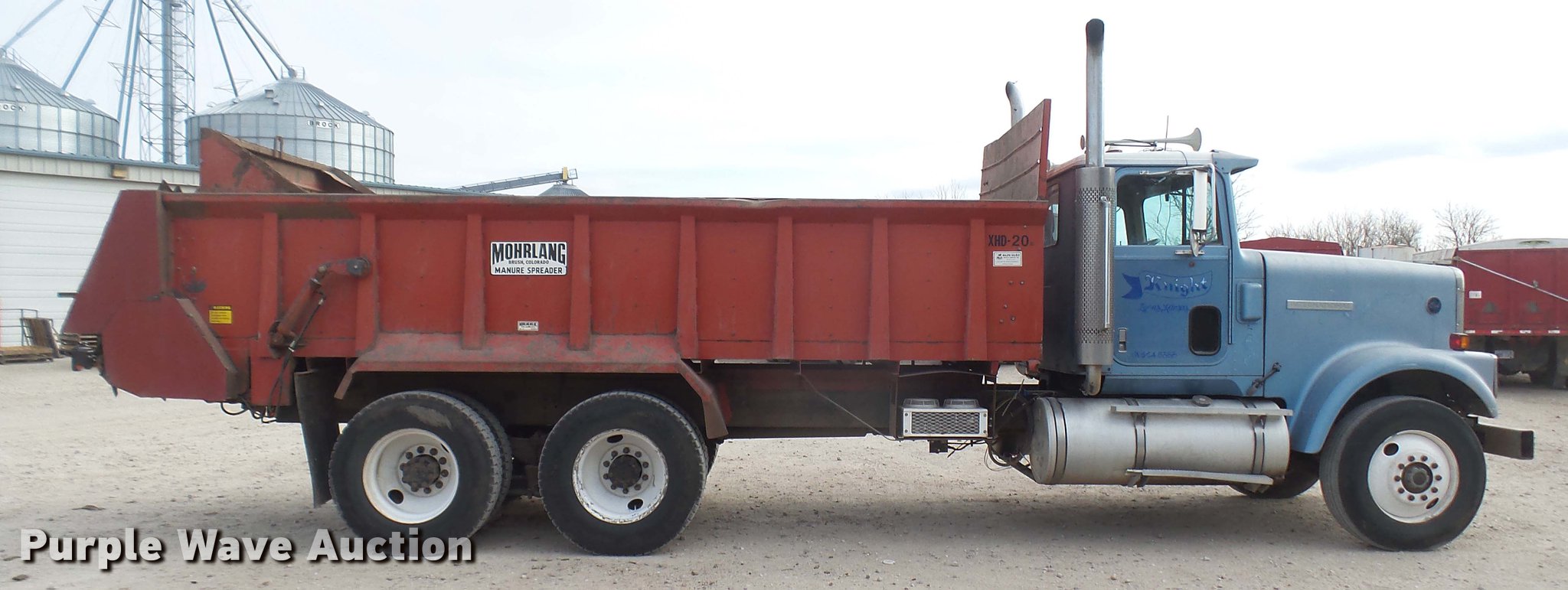 1986 International F9370 manure spreader truck. 854,204 miles on odometer, 4,995 hours on meter Hour meter has been replaced, Cummins NTC400 turbo diesel engine 400 HP, Serial 11327459, Eaton Fuller Road Ranger 15 speed with deep reduction manual transmission, Tandem axle, Inter-axle differential lock, AC and heat Red Dot AC power condensor, AM/FM/CD, Power passenger window, Air suspension seat, Outback steering guide controller, Block heater, PTO, Exterior visor, Front tow hook, Dual exhaust stack, Mohrlang XHD20 manure spreader box 20'L, Horizontal beaters, Chain drive, Steel wall and floor, Serial 1614, Dual fuel tanks, Mud flaps, Double frame, Spring suspension, Air brakes, Engine brake, 11R24.5 tires, Passenger side fuel tank and step damage. Kansas title. 2HSFBGVR3GCA13388. Knight Farms Retirement - Open inspection Feb. 7 and 12. 1750 US-56. Lyons, KS 67554
