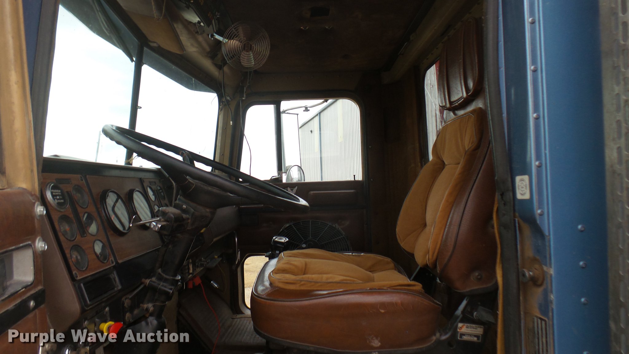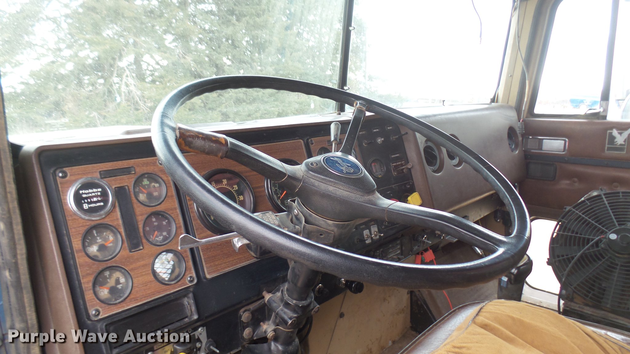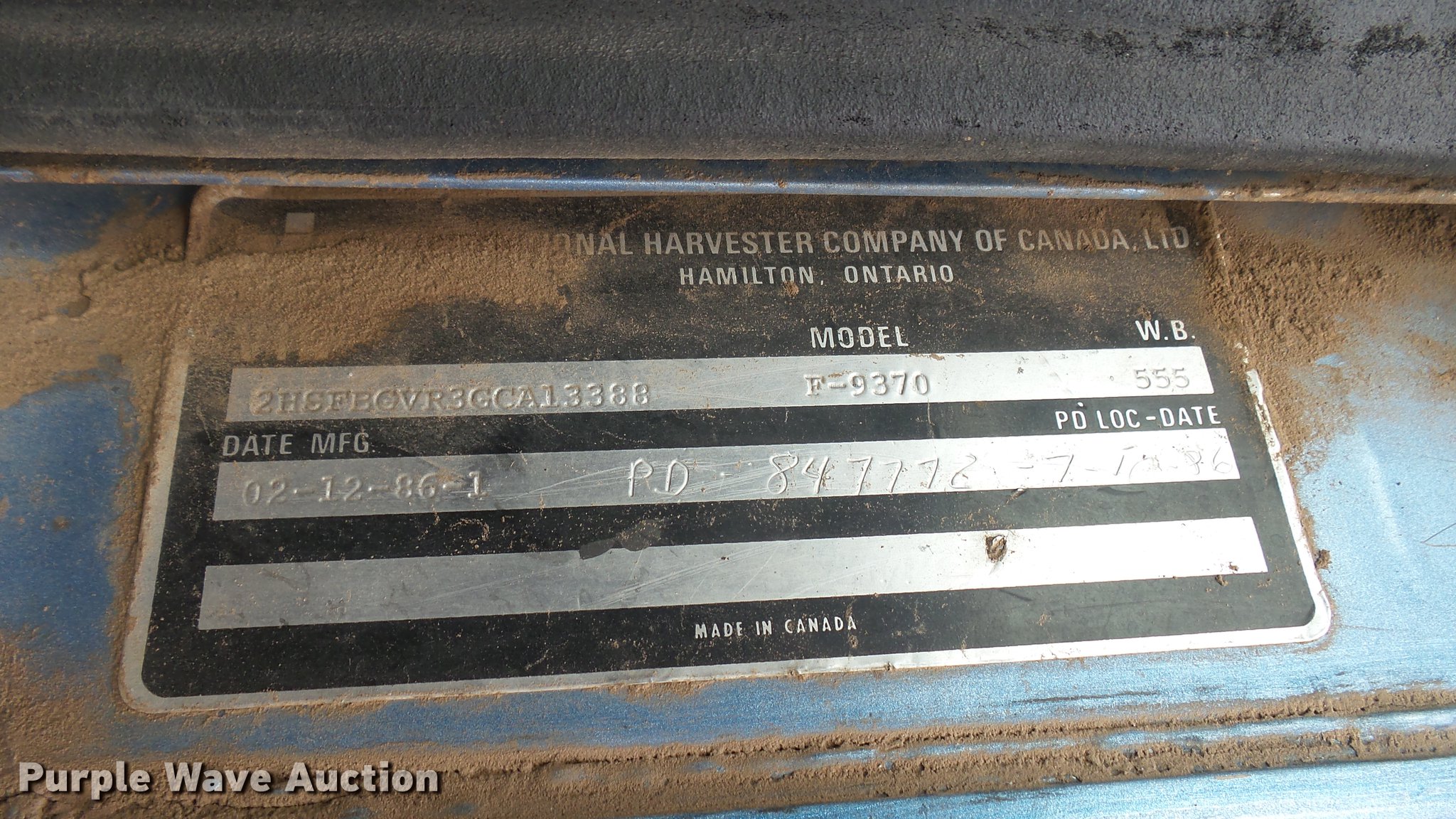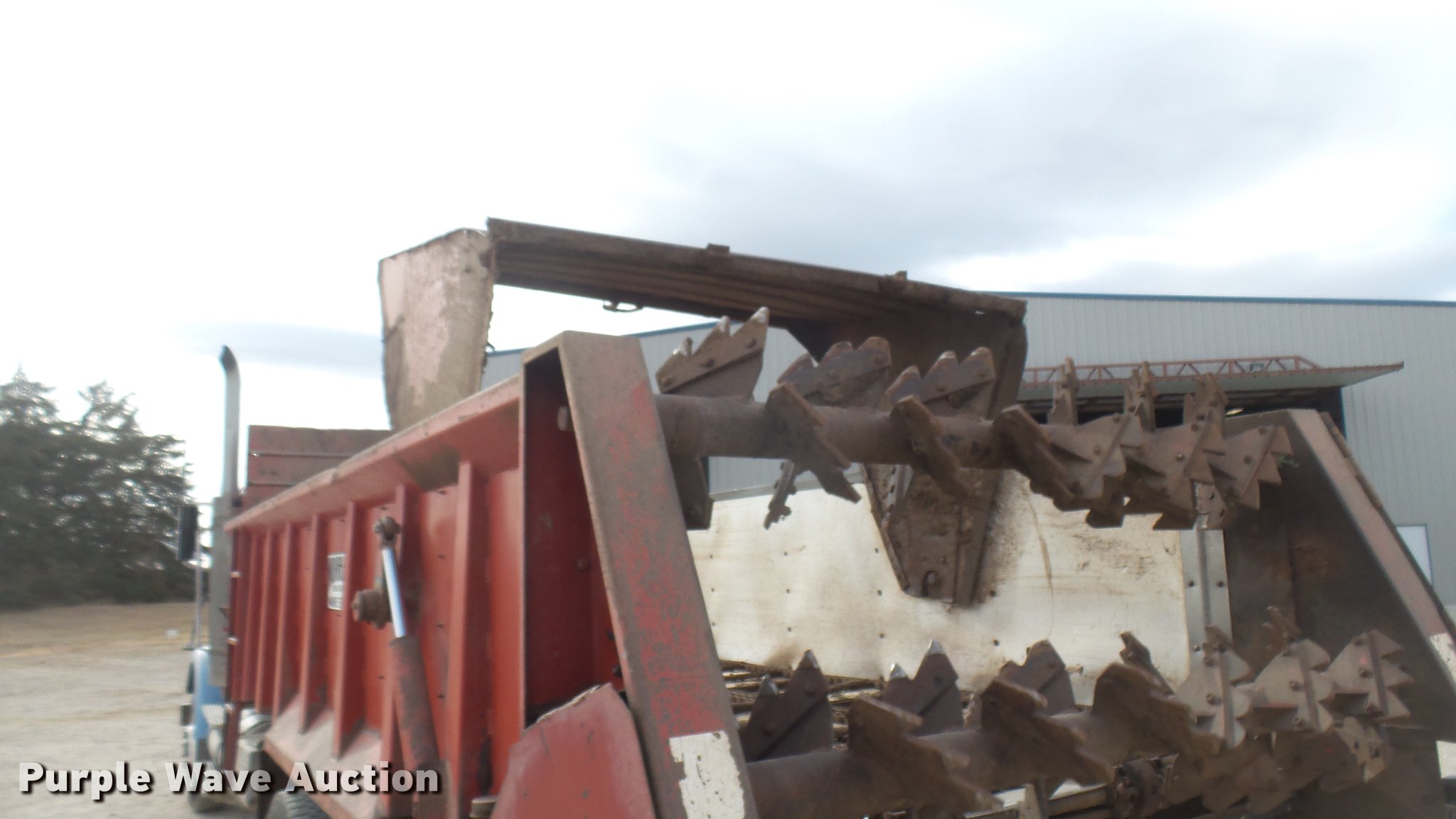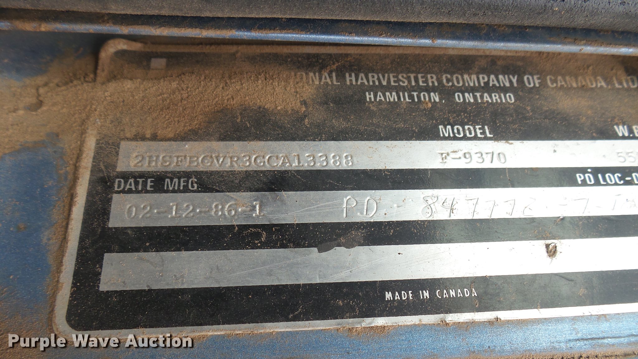 Purple Wave is selling a used Manure Spreader Truck in Kansas. This item is a 1986 International F9370 manure spreader truck with the following: 854,204 miles on odometer, 4,995 hours on meter, Hour meter has been replaced, Cummins NTC400 turbo diesel engine, 400 HP, Serial 11327459, Eaton Fuller Road Ranger 15 speed with deep reduction manual transmission, Tandem axle, Inter-axle differential lock, AC and heat, Red Dot AC power condensor, AM/FM/CD, Power passenger window, Air suspension seat, Outback steering guide controller, Block heater, PTO, Exterior visor, Front tow hook, Dual exhaust stack, Mohrlang XHD20 manure spreader box, 20'L, Horizontal beaters, Chain drive, Steel wall and floor, Serial 1614, Dual fuel tanks, Mud flaps, Double frame, Spring suspension, Air brakes, Engine brake, 11R24.5 tires, Passenger side fuel tank and step damage