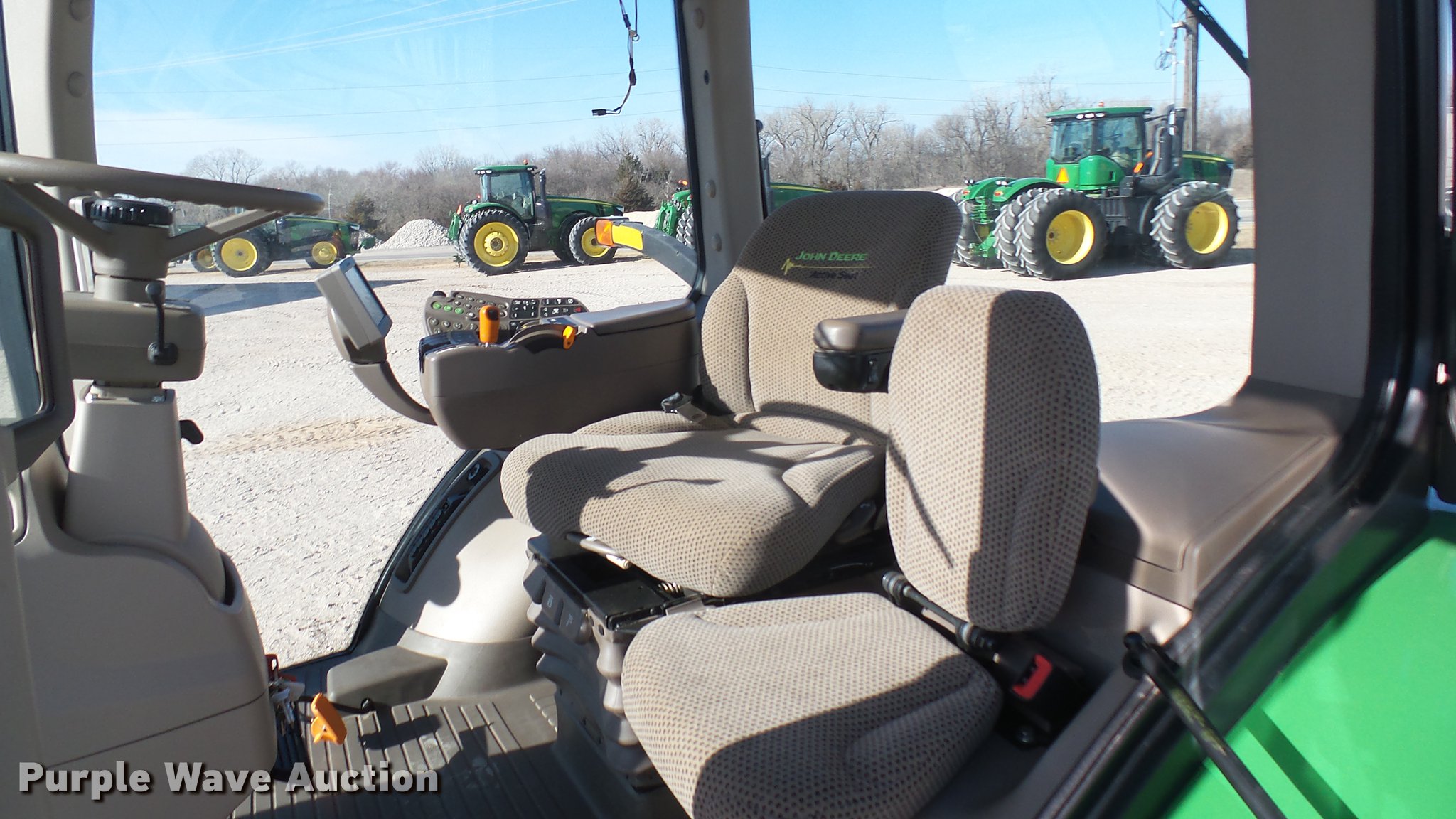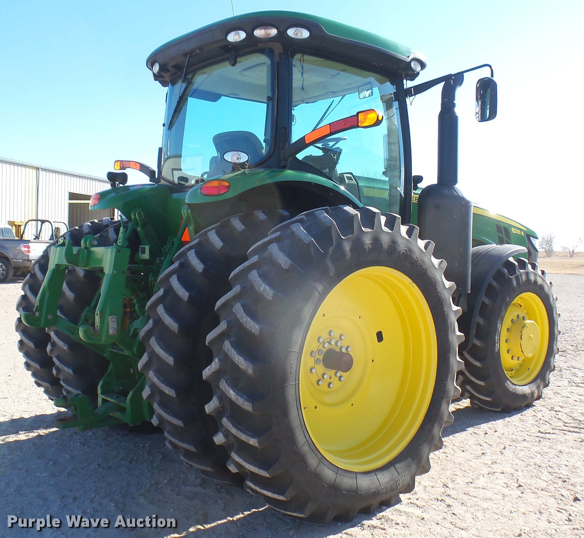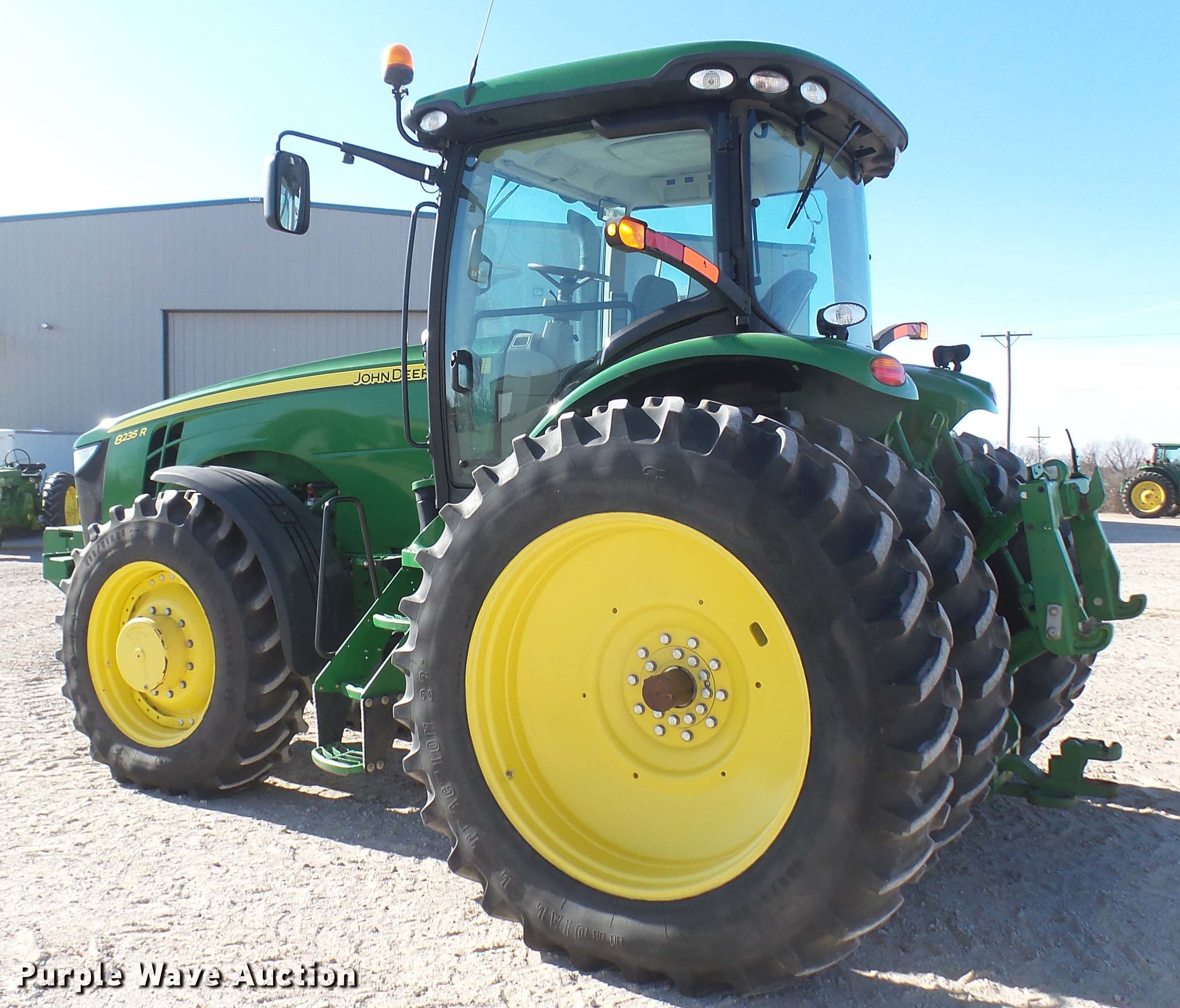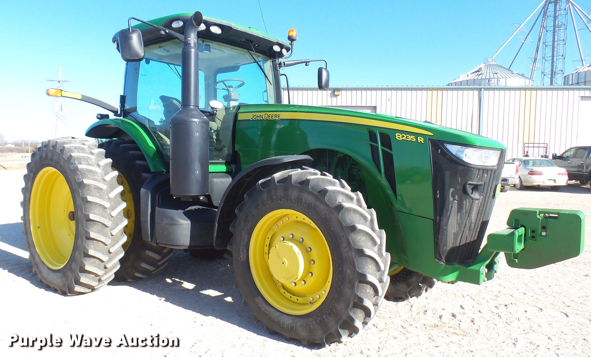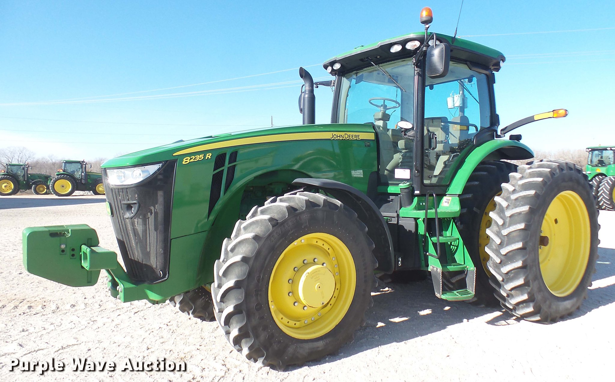 Purple Wave is selling a used Tractor in Kansas. This item is a 2013 John Deere 8235R MFWD tractor with the following: 2,197 hours on meter, John Deere 6090RW415 9.0L six cylinder turbo diesel engine, Serial RG6090R051798, John Deere Auto Power IVT transmission, Differential lock, AC and heat, Tilt steering wheel, AM/FM/CD, Power mirrors, Air suspension seat, Instructor's seat, Shades, GS3 Command Center 7" touchscreen color display, Three point, Top link, Quick attach, Large 1000 PTO, Seven pin outlet, ISO electrical outlet, (4) rear hydraulic remote sets, Power beyond hydraulics, (8) suitcase weights, (2) wheel weights, 420/85R34 front tires, 480/80R46 dual rear tires, Manuals, Serial 1RW8235RJDD073784