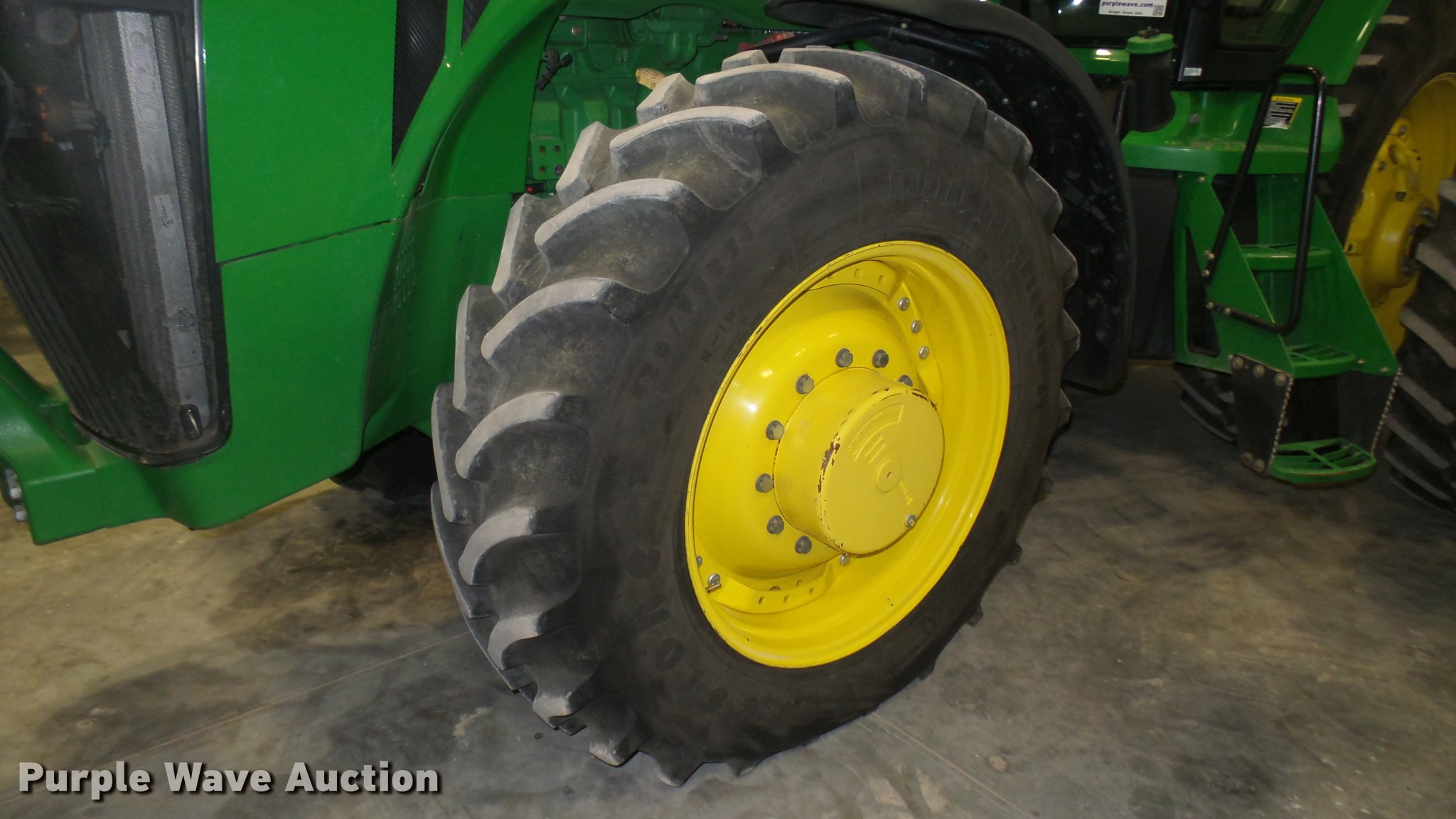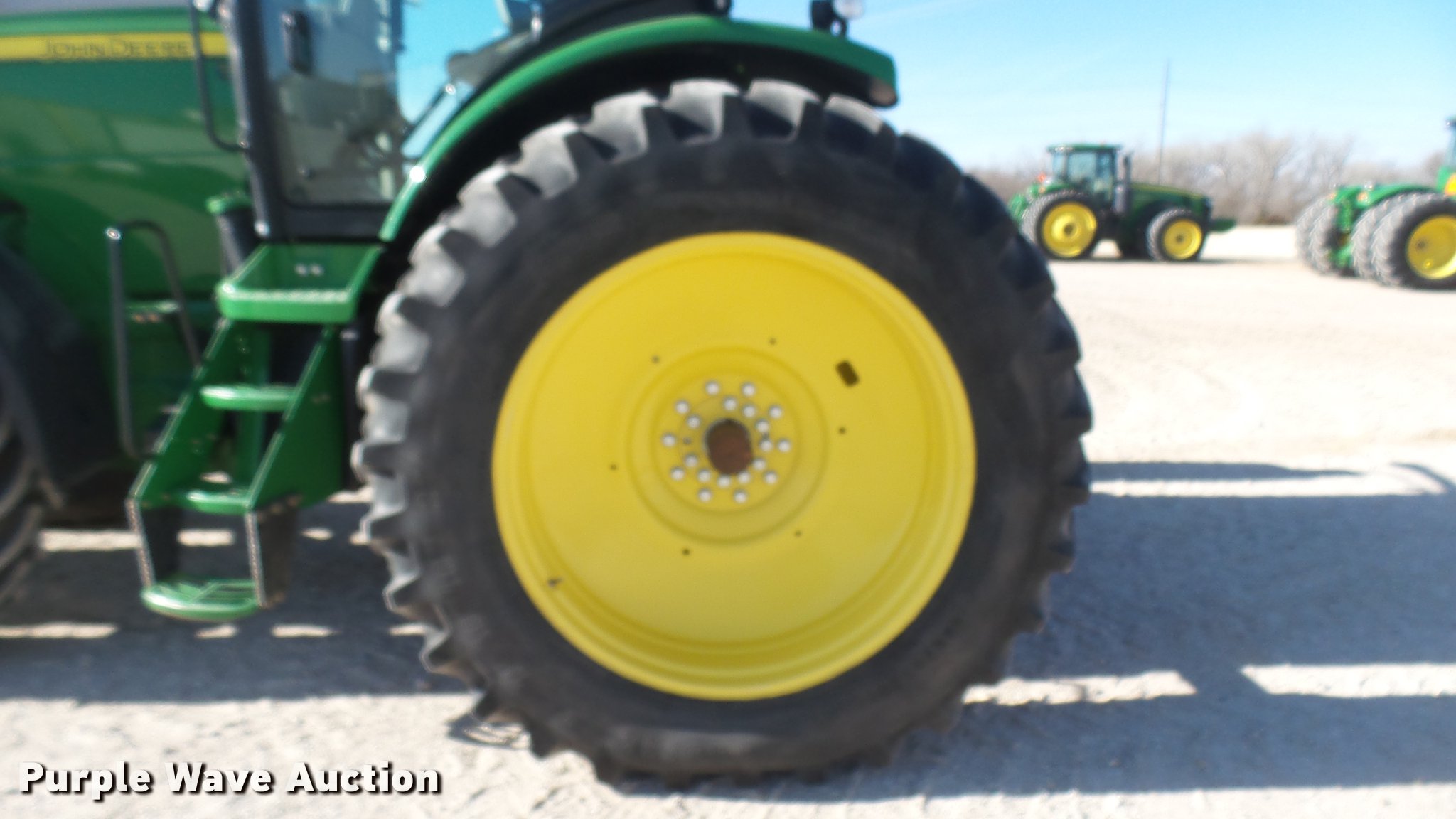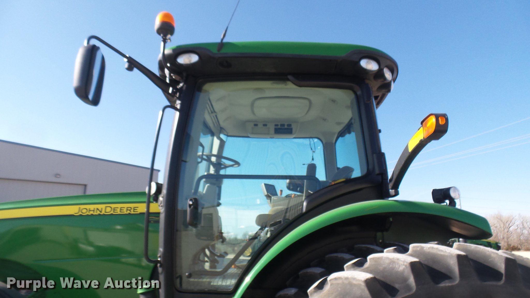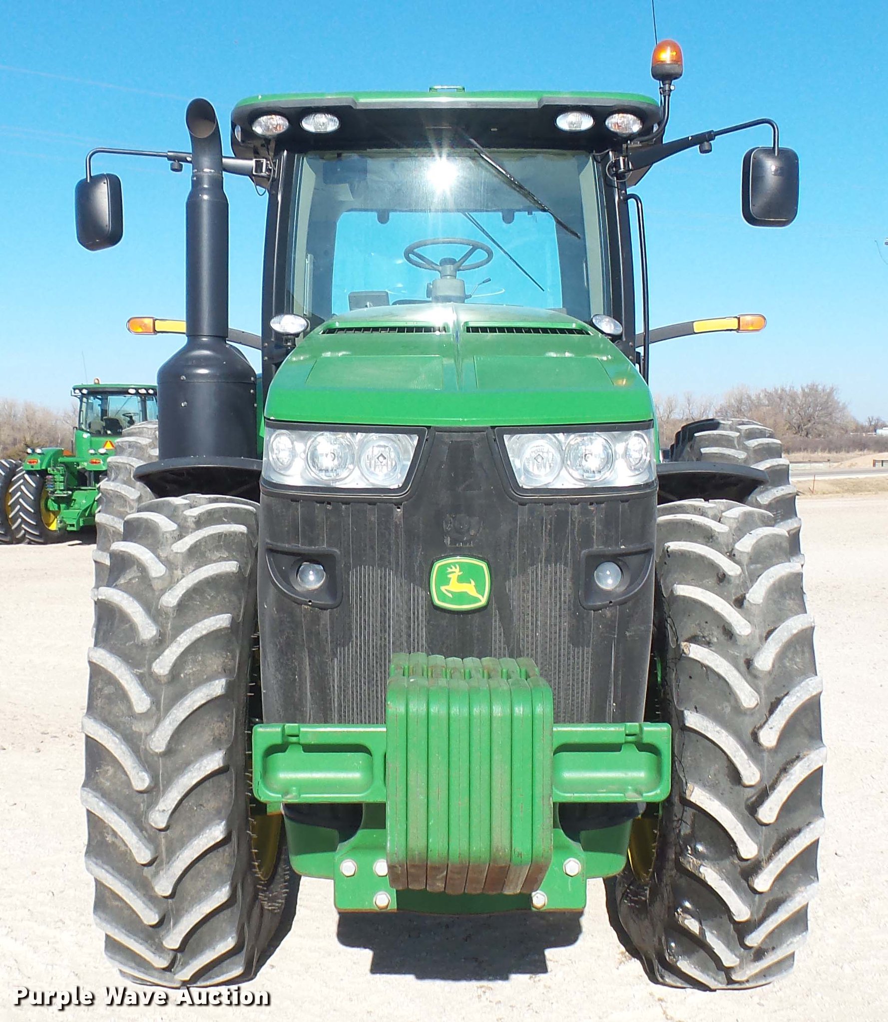 Purple Wave is selling a used Tractor in Kansas. This item is a 2013 John Deere 8235R MFWD tractor with the following: 2,197 hours on meter, John Deere 6090RW415 9.0L six cylinder turbo diesel engine, Serial RG6090R051798, John Deere Auto Power IVT transmission, Differential lock, AC and heat, Tilt steering wheel, AM/FM/CD, Power mirrors, Air suspension seat, Instructor's seat, Shades, GS3 Command Center 7" touchscreen color display, Three point, Top link, Quick attach, Large 1000 PTO, Seven pin outlet, ISO electrical outlet, (4) rear hydraulic remote sets, Power beyond hydraulics, (8) suitcase weights, (2) wheel weights, 420/85R34 front tires, 480/80R46 dual rear tires, Manuals, Serial 1RW8235RJDD073784