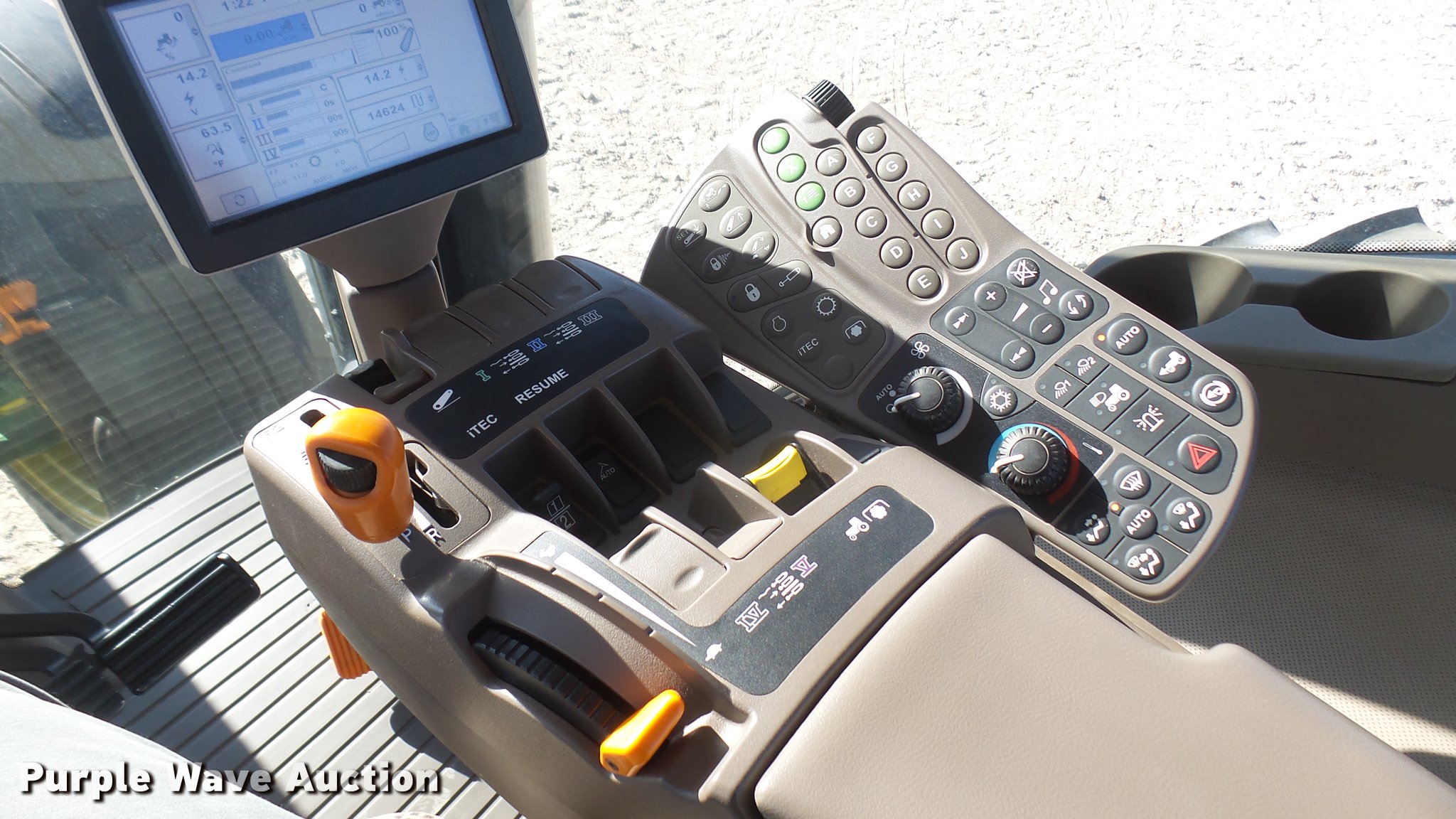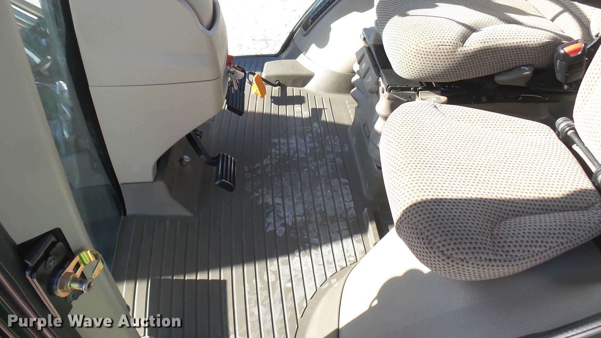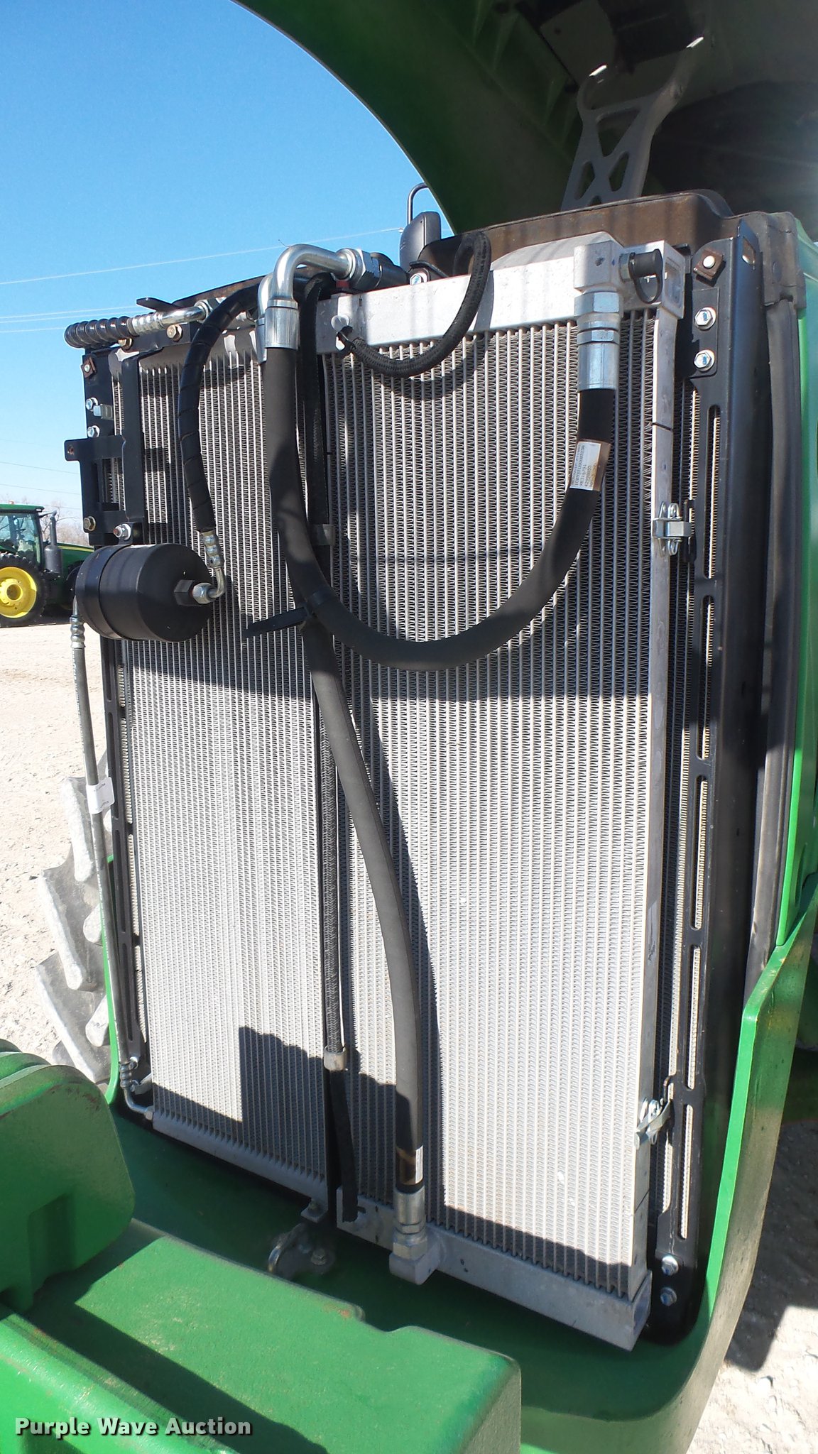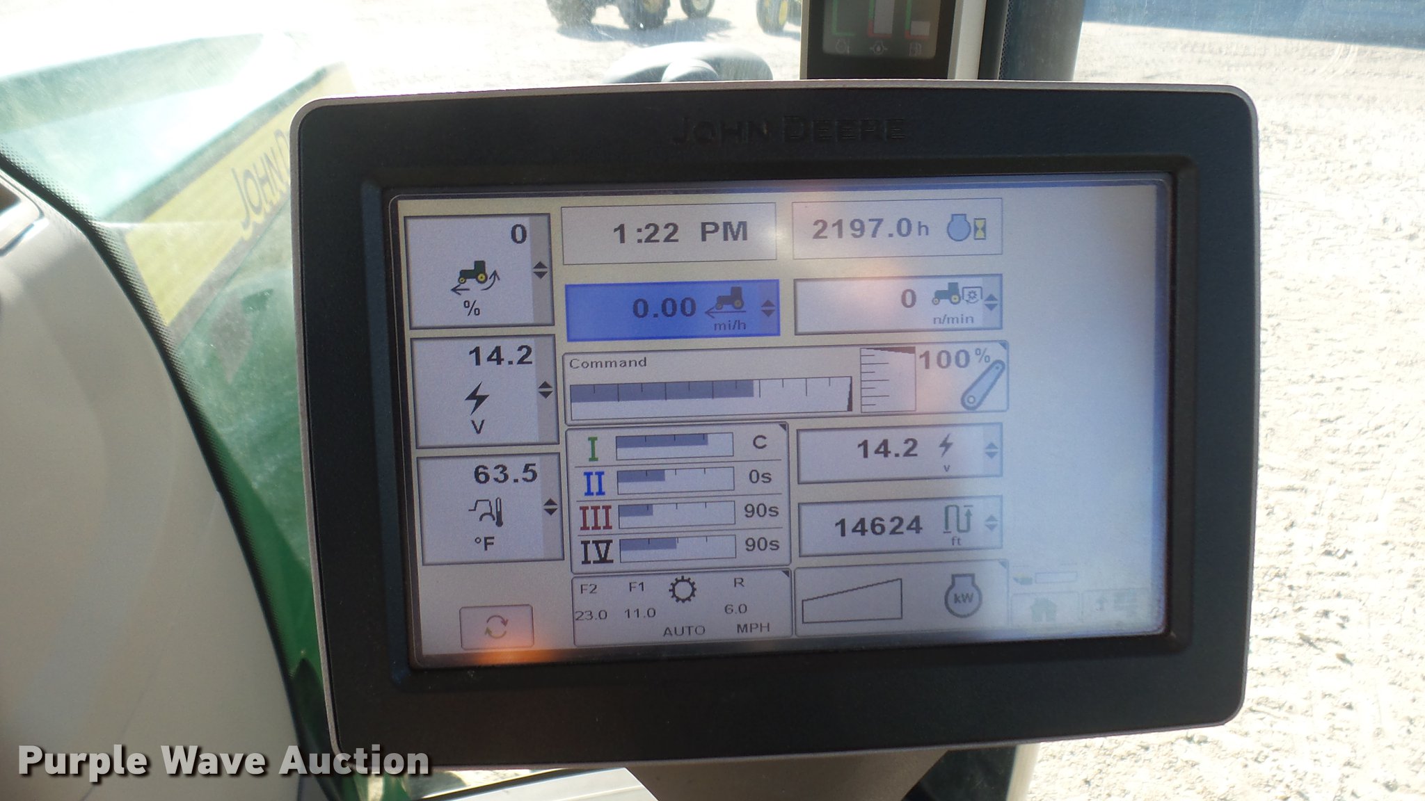 Purple Wave is selling a used Tractor in Kansas. This item is a 2013 John Deere 8235R MFWD tractor with the following: 2,197 hours on meter, John Deere 6090RW415 9.0L six cylinder turbo diesel engine, Serial RG6090R051798, John Deere Auto Power IVT transmission, Differential lock, AC and heat, Tilt steering wheel, AM/FM/CD, Power mirrors, Air suspension seat, Instructor's seat, Shades, GS3 Command Center 7" touchscreen color display, Three point, Top link, Quick attach, Large 1000 PTO, Seven pin outlet, ISO electrical outlet, (4) rear hydraulic remote sets, Power beyond hydraulics, (8) suitcase weights, (2) wheel weights, 420/85R34 front tires, 480/80R46 dual rear tires, Manuals, Serial 1RW8235RJDD073784