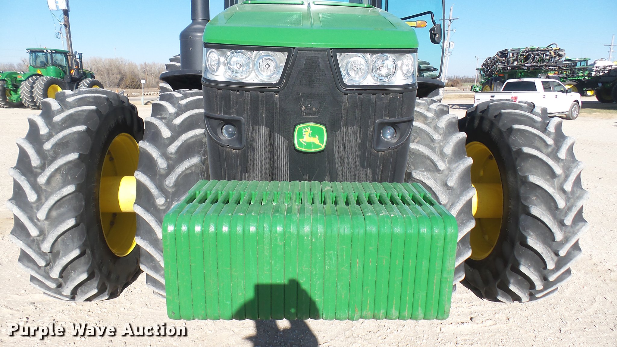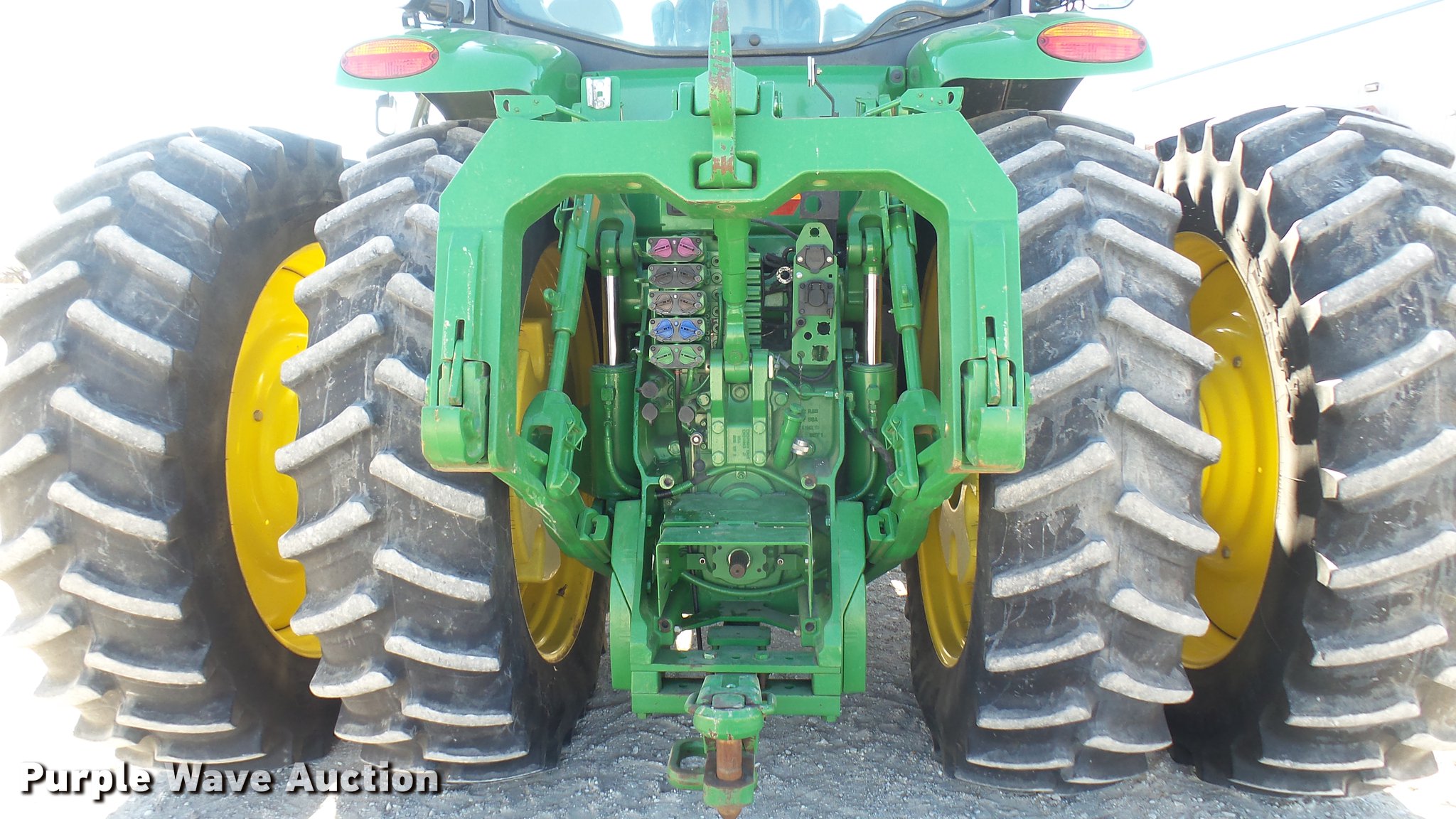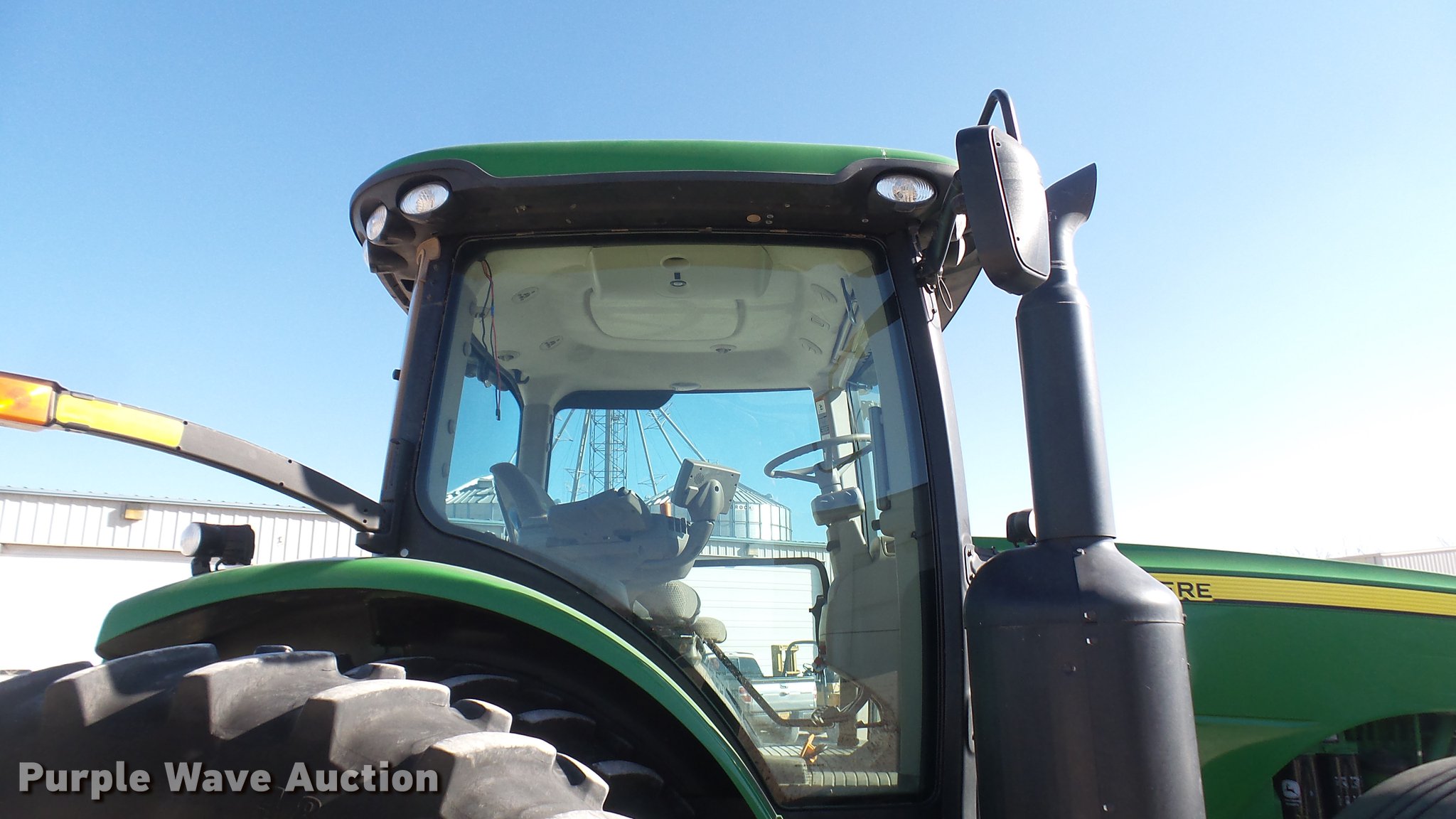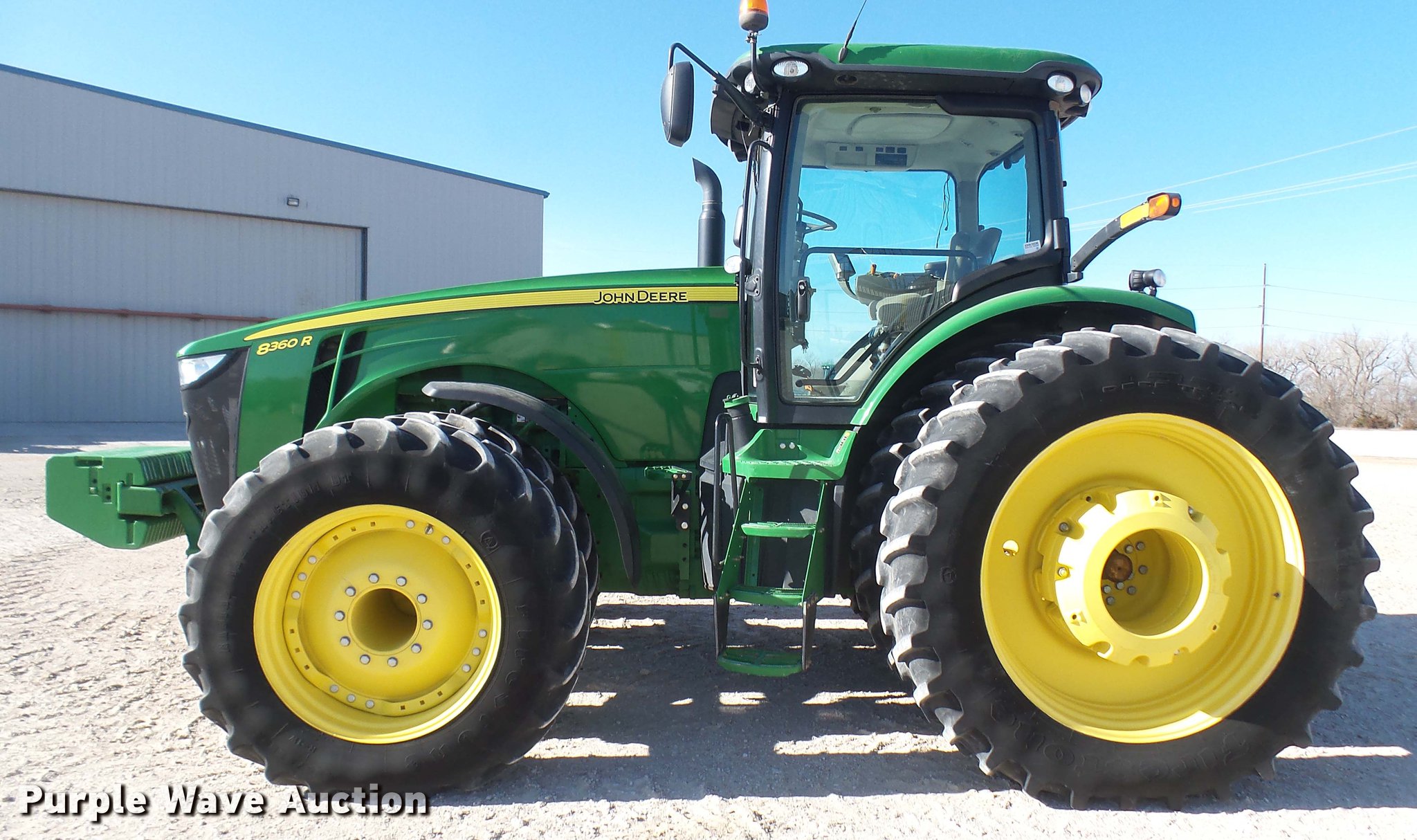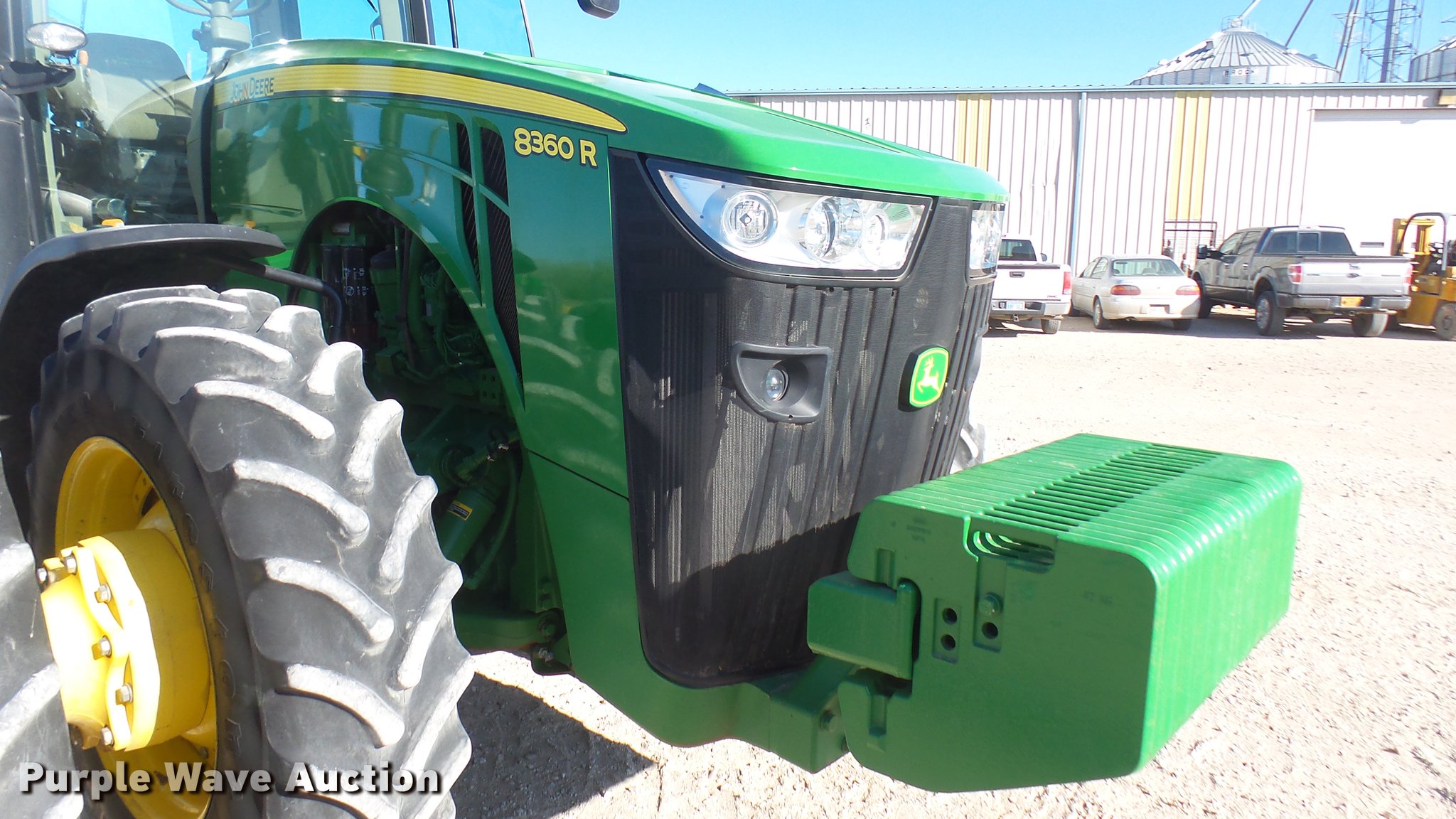Purple Wave is selling a used Tractor in Kansas. This item is a 2013 John Deere 8360R MFWD tractor with the following: 3,036 hours on meter, John Deere 6090RW414 9.0L six cylinder turbo diesel engine, Serial RG6090R051325, John Deere Auto Power IVT transmission, Strike differential lock, AC and heat, AM/FM/CD, Power mirrors, Air suspension seat, Instructor's seat, Tilt steering wheel, Shades, Block heater, Three point, Top link, Quick attach, Large 1000 PTO, Seven pin outlet, ISO electrical outlet, (5) rear hydraulic remote sets, Power beyond hydraulics, (22) suitcase weights, (5) wheel weights, Firestone 420/85R34 dual front tires, Firestone 480/80R50 dual rear tires, Manuals, Serial 1RW8360RTDD073589