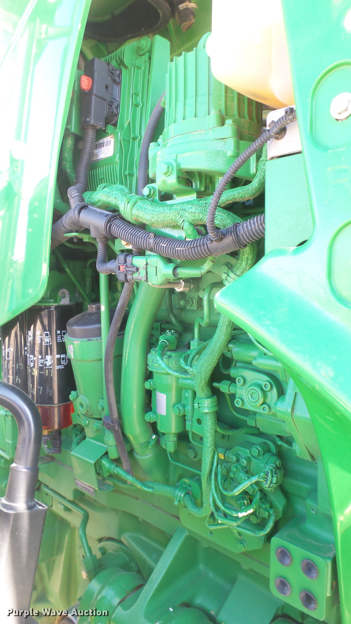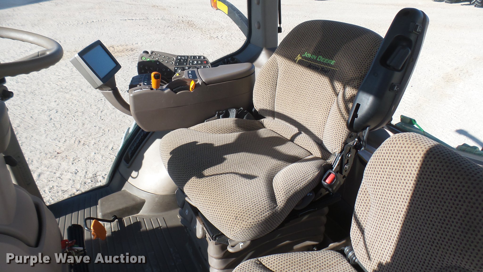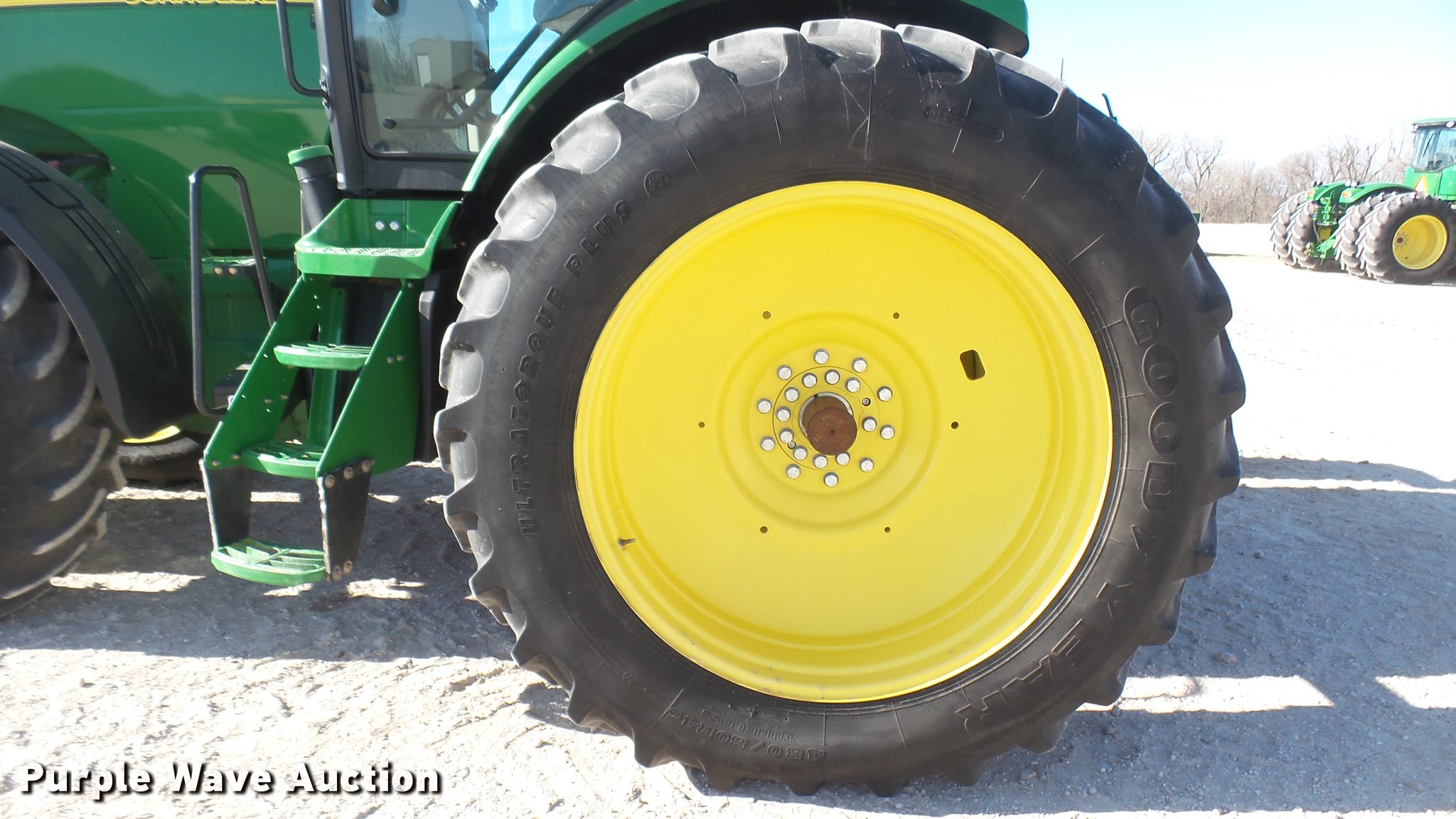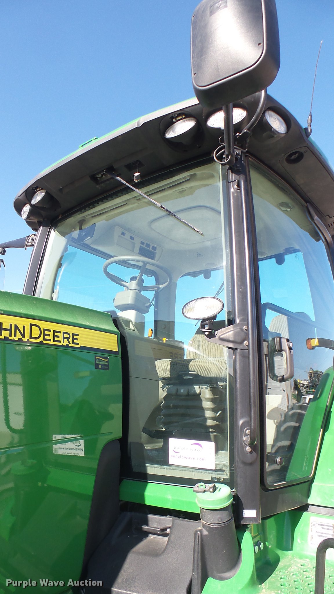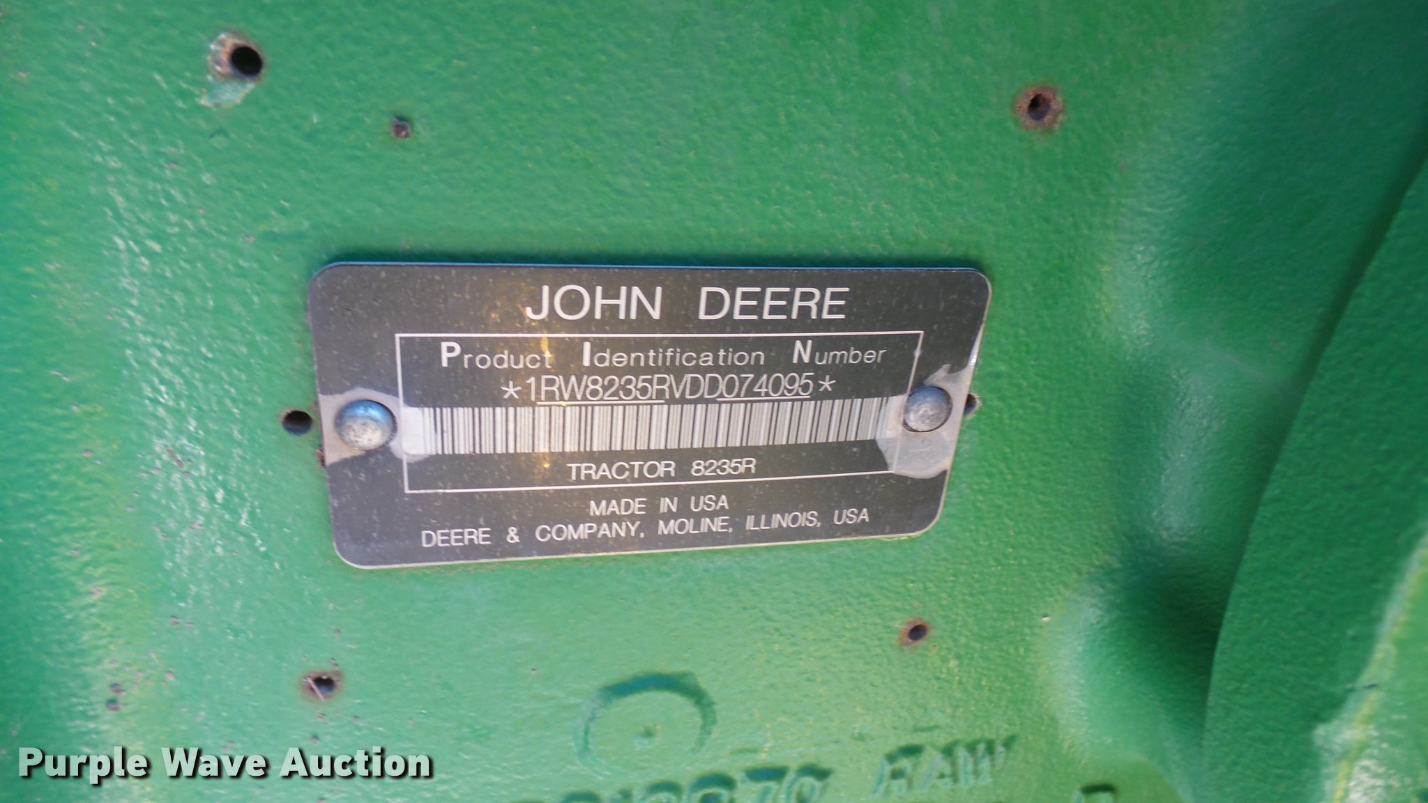 Purple Wave is selling a used Tractor in Kansas. This item is a 2013 John Deere 8235R MFWD tractor with the following: 2,267 hours on meter, John Deere 6090RW415 9.0L six cylinder turbo diesel engine, Serial RG6090R052548, John Deere Auto Power IVT transmission, Differential lock, AC and heat, Tilt steering wheel, AM/FM/CD, Power mirrors, Air suspension seat, Instructor's seat, Shades, GS3 Command Center 7" touchscreen color display, Three point, Top link, Quick attach, Large 1000 PTO, Seven pin outlet, ISO electrical outlet, (4) rear hydraulic remote sets, Power beyond hydraulics, (8) suitcase weights, (2) wheel weights, 420/85R34 front tires, 480/80R46 rear tires, Manuals, Serial 1RW8235RVDD074095