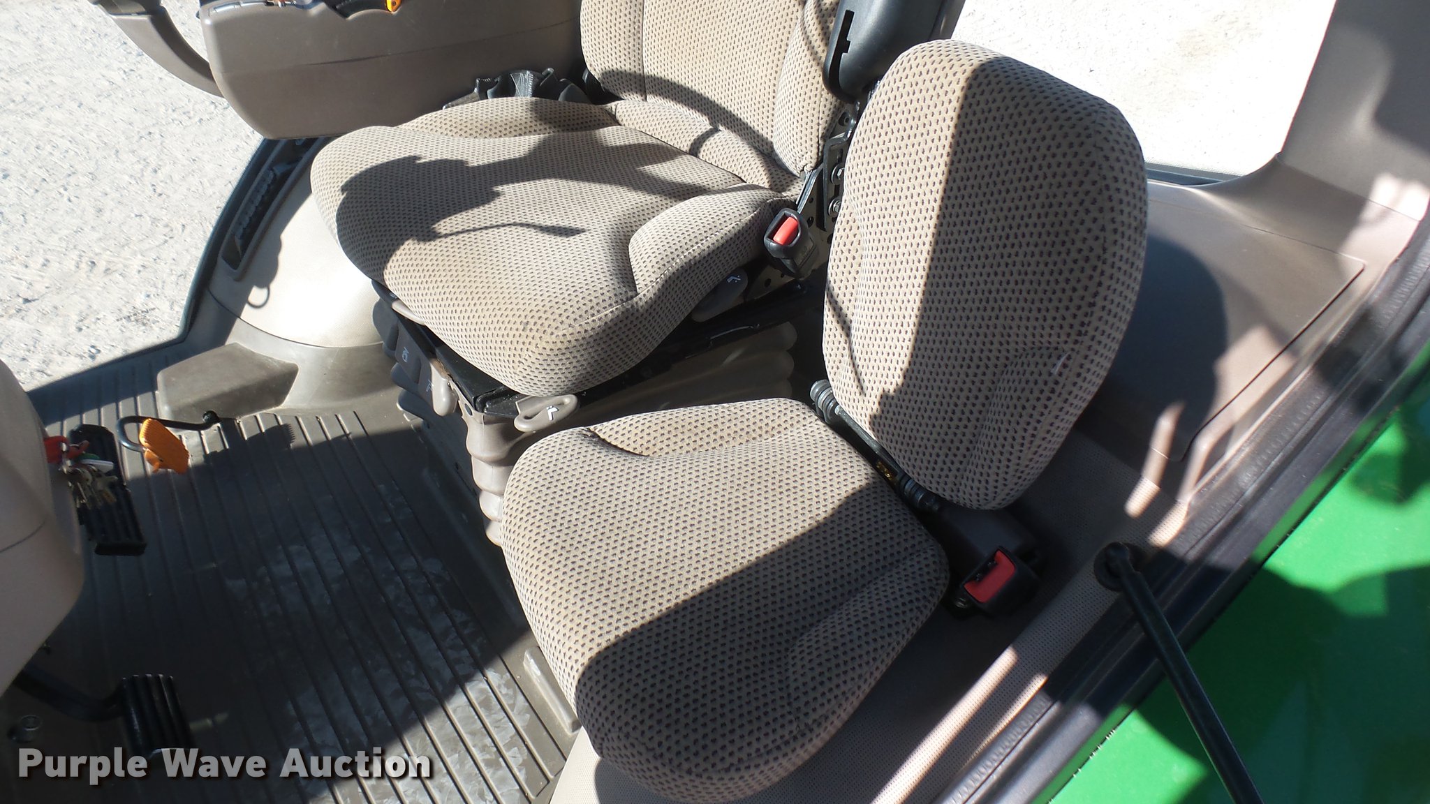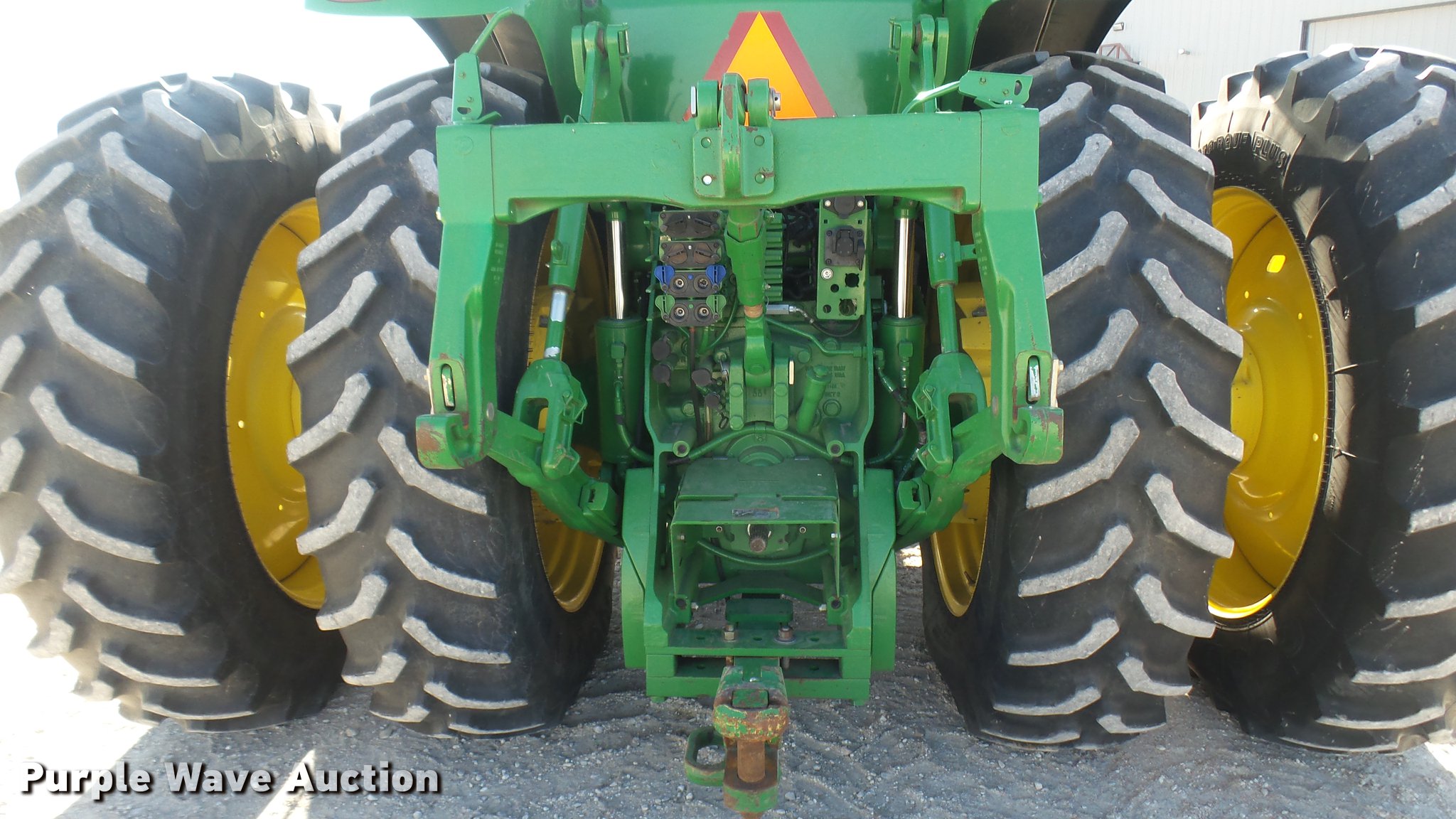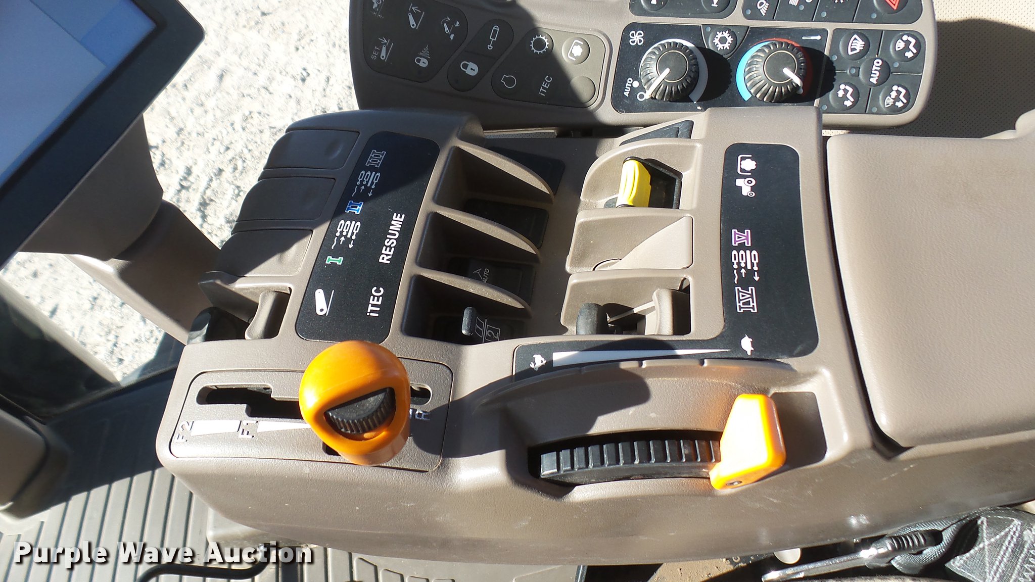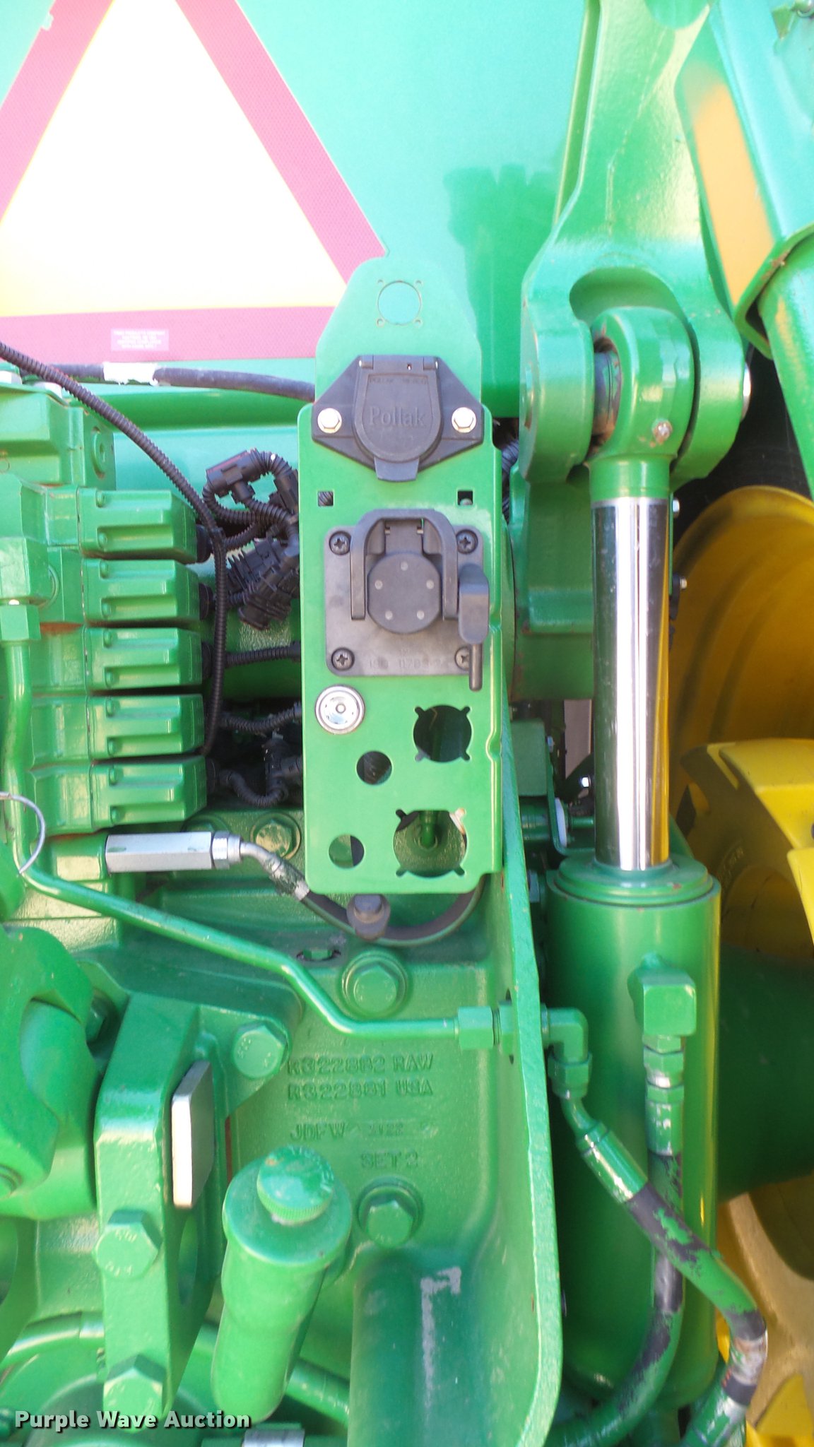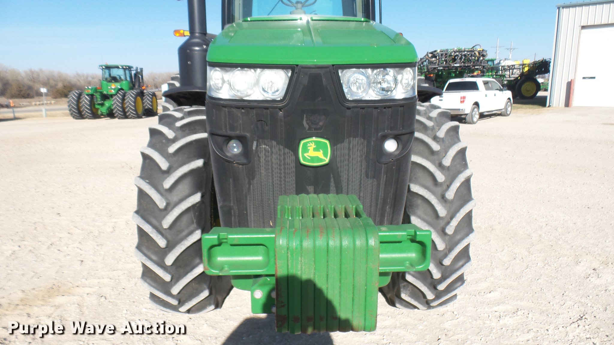 Purple Wave is selling a used Tractor in Kansas. This item is a 2013 John Deere 8235R MFWD tractor with the following: 2,267 hours on meter, John Deere 6090RW415 9.0L six cylinder turbo diesel engine, Serial RG6090R052548, John Deere Auto Power IVT transmission, Differential lock, AC and heat, Tilt steering wheel, AM/FM/CD, Power mirrors, Air suspension seat, Instructor's seat, Shades, GS3 Command Center 7" touchscreen color display, Three point, Top link, Quick attach, Large 1000 PTO, Seven pin outlet, ISO electrical outlet, (4) rear hydraulic remote sets, Power beyond hydraulics, (8) suitcase weights, (2) wheel weights, 420/85R34 front tires, 480/80R46 rear tires, Manuals, Serial 1RW8235RVDD074095