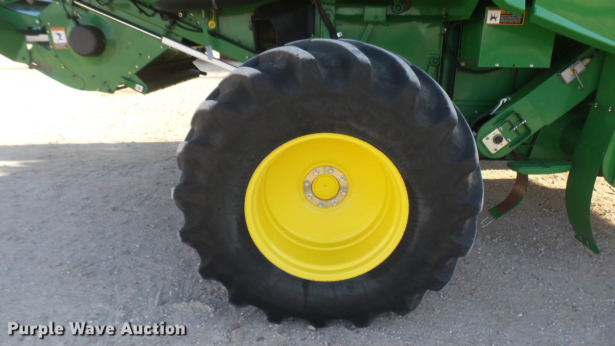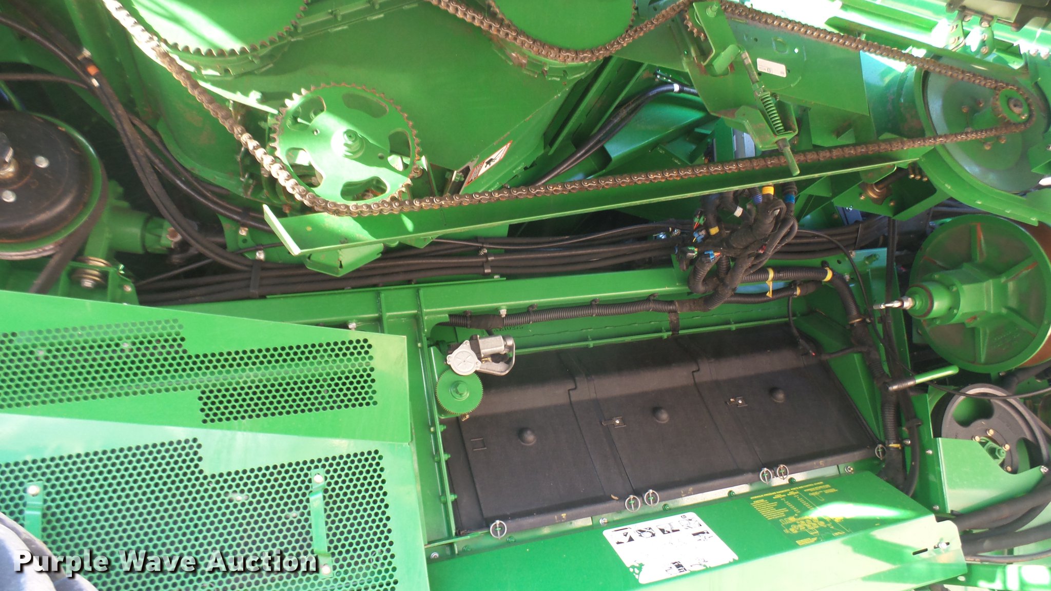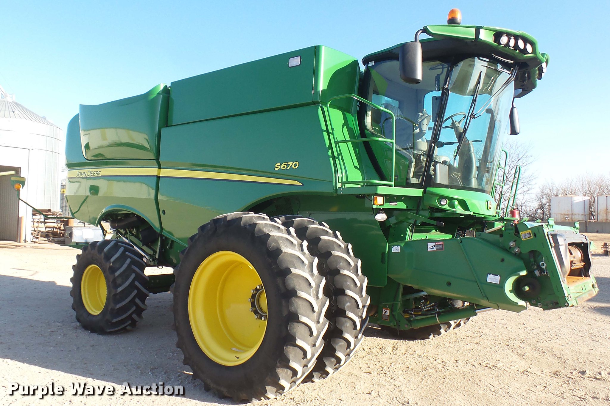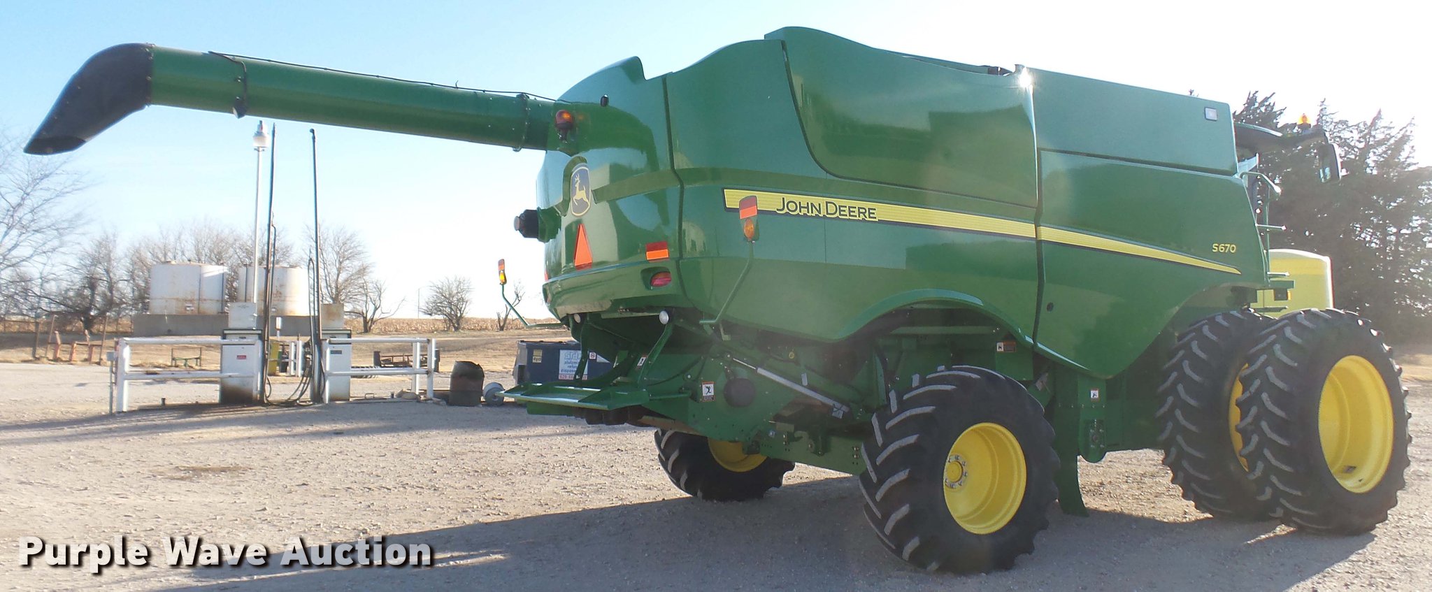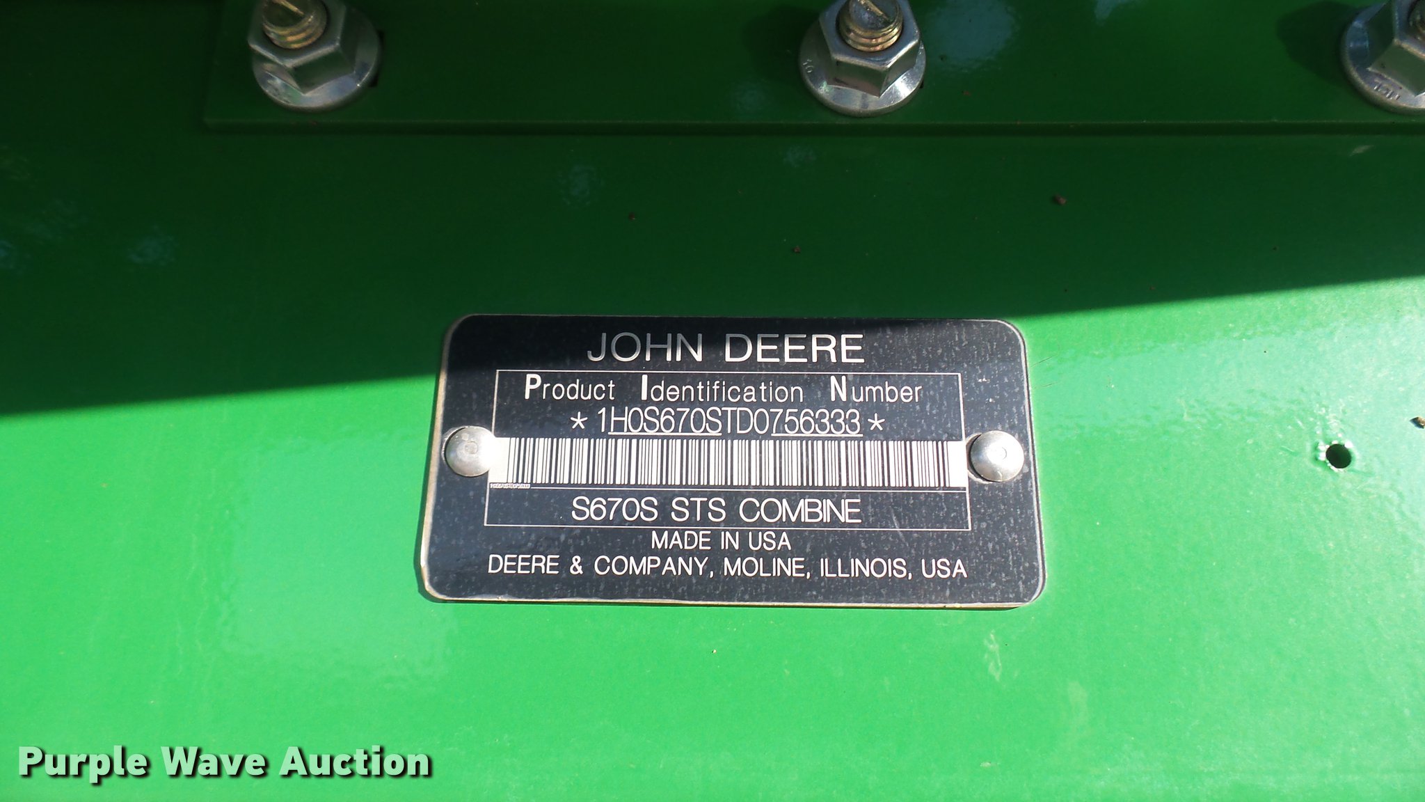 Purple Wave is selling a used Combine in Kansas. This item is a 2013 John Deere S670 STS combine with the following: 1,611 engine hours on meter, 1,217 separator hours on meter, John Deere 6090HH015 9.0L six cylinder turbo diesel engine, Serial RG6090R046510, Push-button shift transmission, 3F-1R gears, Feederhouse, Lateral tilt, Variable speed, Reverser, Single point header coupler, Custom cutter extended wear package, AC and heat, Tilt steering wheel, AM/FM/CD, Power and heated mirrors, Air suspension seat, AutoTrac ready with harvest monitor, Contour Master auto header height, GS3 Command Center 7" touchscreen color display, Shades, Work lights, Small wire concaves with every other wire removed, Straw chopper, Manual folding bin extensions, 26'L unloading auger, GreenStar ready, Goodyear 520/85R42 dual front tires, Goodyear 600/65R28 rear tires, Serial 1H0S670STD0756333, Unit# 1
