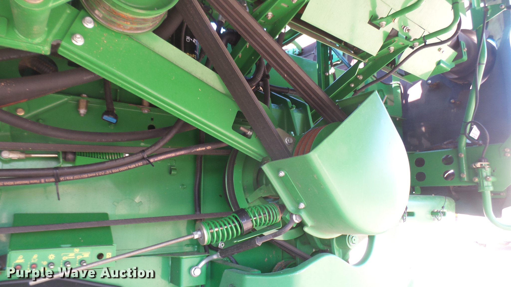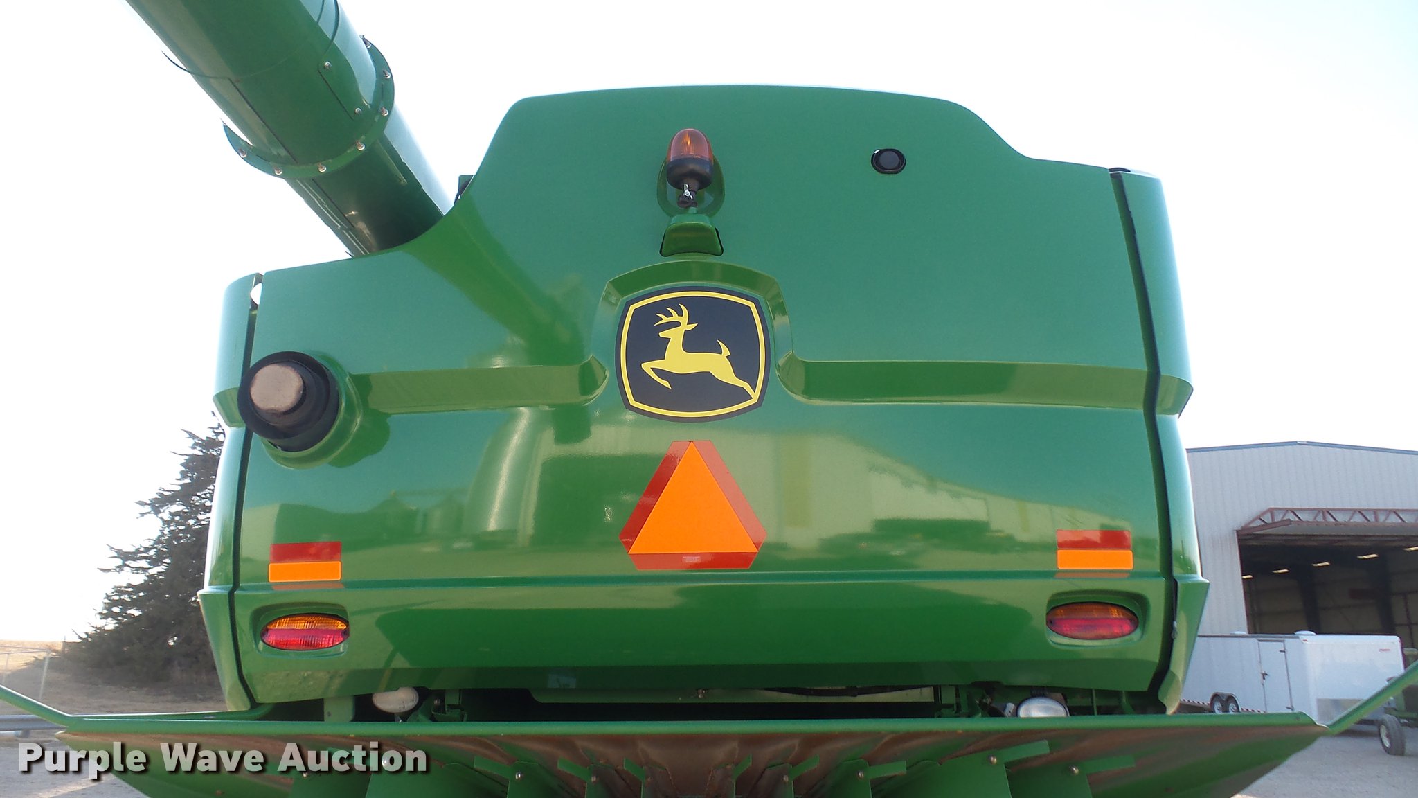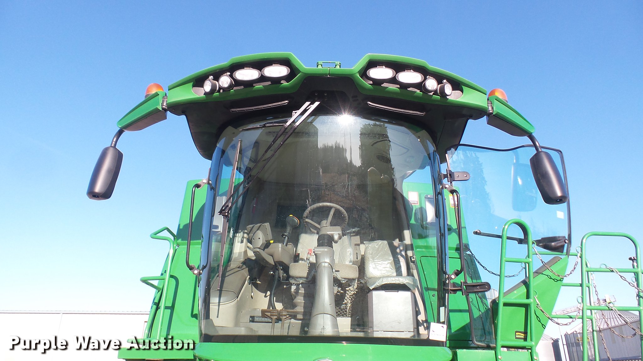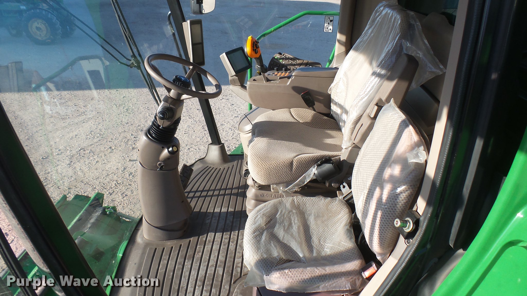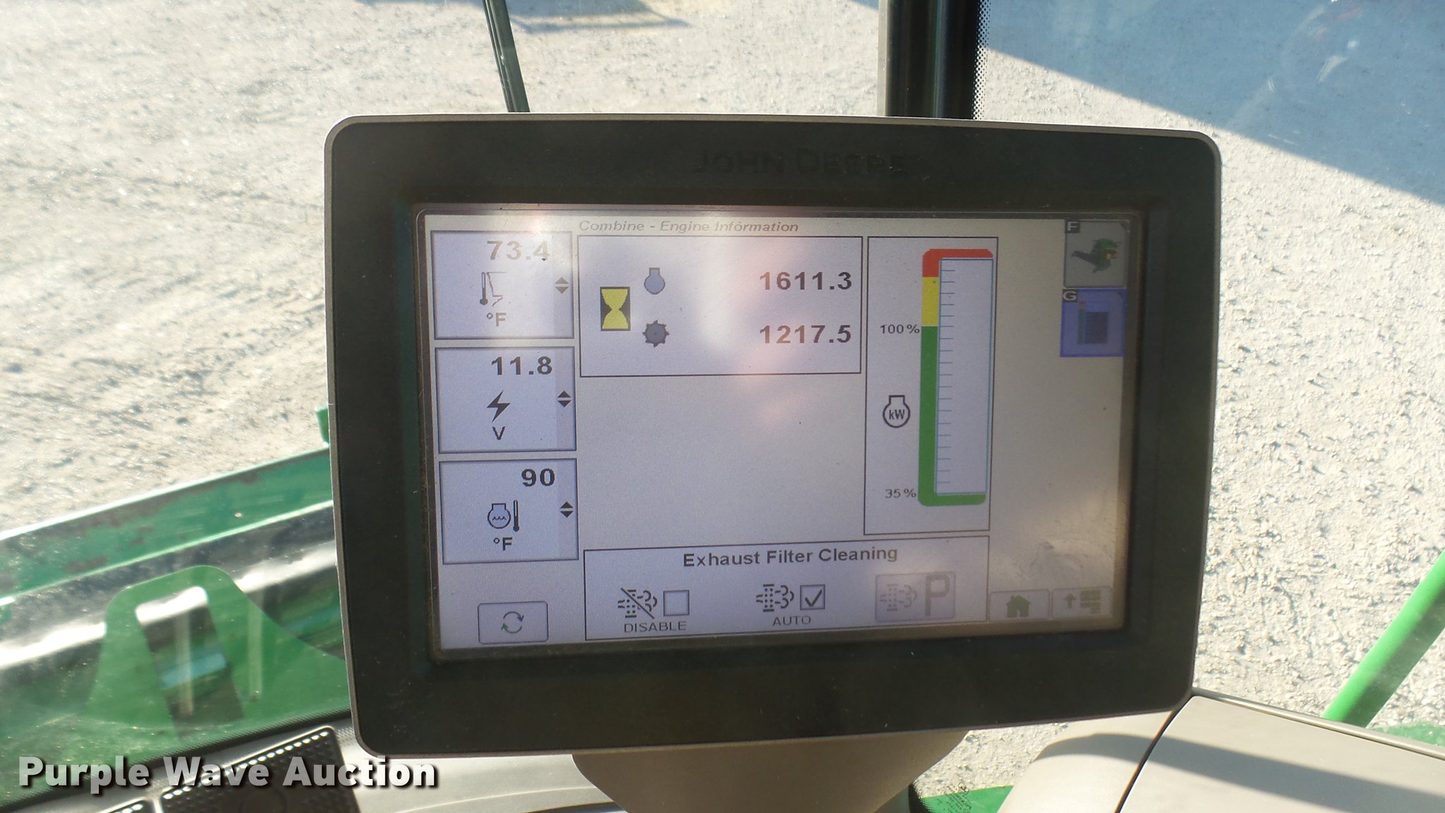 Purple Wave is selling a used Combine in Kansas. This item is a 2013 John Deere S670 STS combine with the following: 1,611 engine hours on meter, 1,217 separator hours on meter, John Deere 6090HH015 9.0L six cylinder turbo diesel engine, Serial RG6090R046510, Push-button shift transmission, 3F-1R gears, Feederhouse, Lateral tilt, Variable speed, Reverser, Single point header coupler, Custom cutter extended wear package, AC and heat, Tilt steering wheel, AM/FM/CD, Power and heated mirrors, Air suspension seat, AutoTrac ready with harvest monitor, Contour Master auto header height, GS3 Command Center 7" touchscreen color display, Shades, Work lights, Small wire concaves with every other wire removed, Straw chopper, Manual folding bin extensions, 26'L unloading auger, GreenStar ready, Goodyear 520/85R42 dual front tires, Goodyear 600/65R28 rear tires, Serial 1H0S670STD0756333, Unit# 1