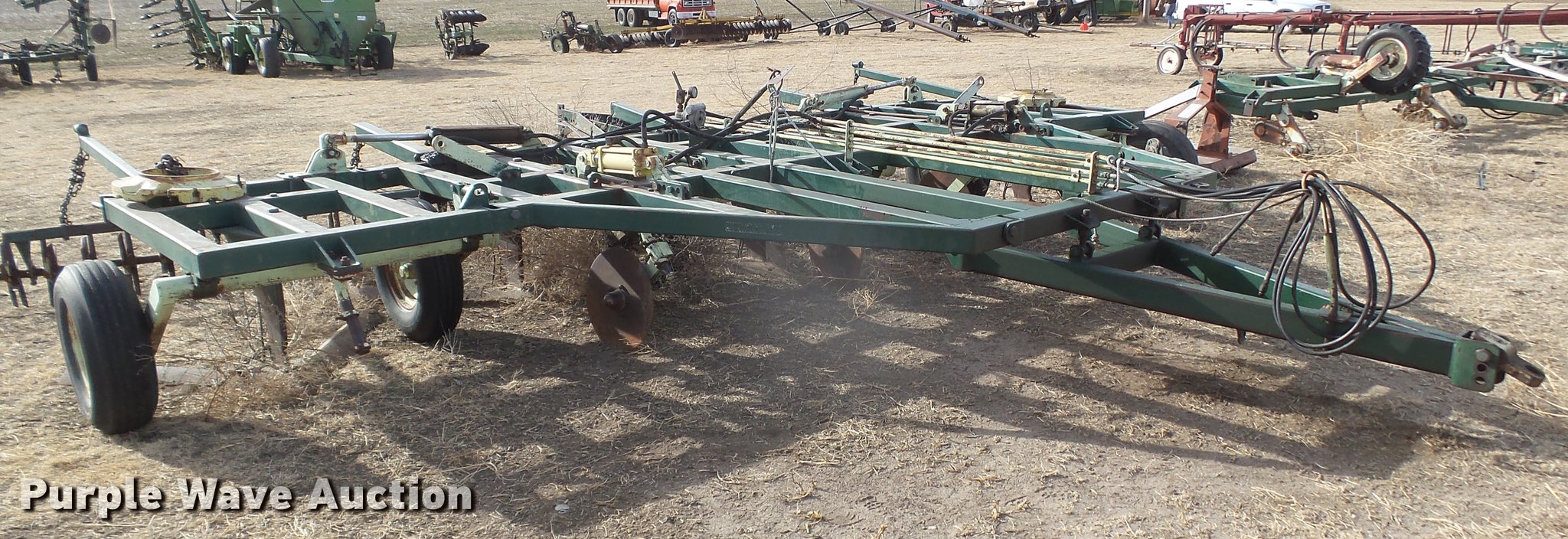 Purple Wave is selling a used Field Cultivator or Sweep Plow in Kansas. This item is a Flex King 5X5 sweep plow with the following: 25'W, (5) 60"W sweeps, Rolling pickers/treader, Manual leveler, Hydraulic lift and fold, Slab hitch, 8.5L-14 tires, Hydraulic cylinder leaks