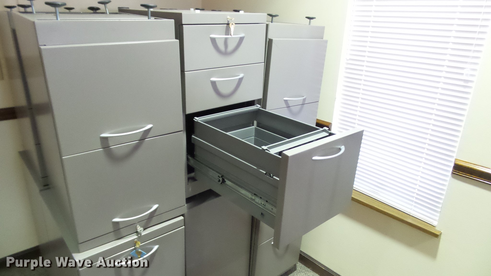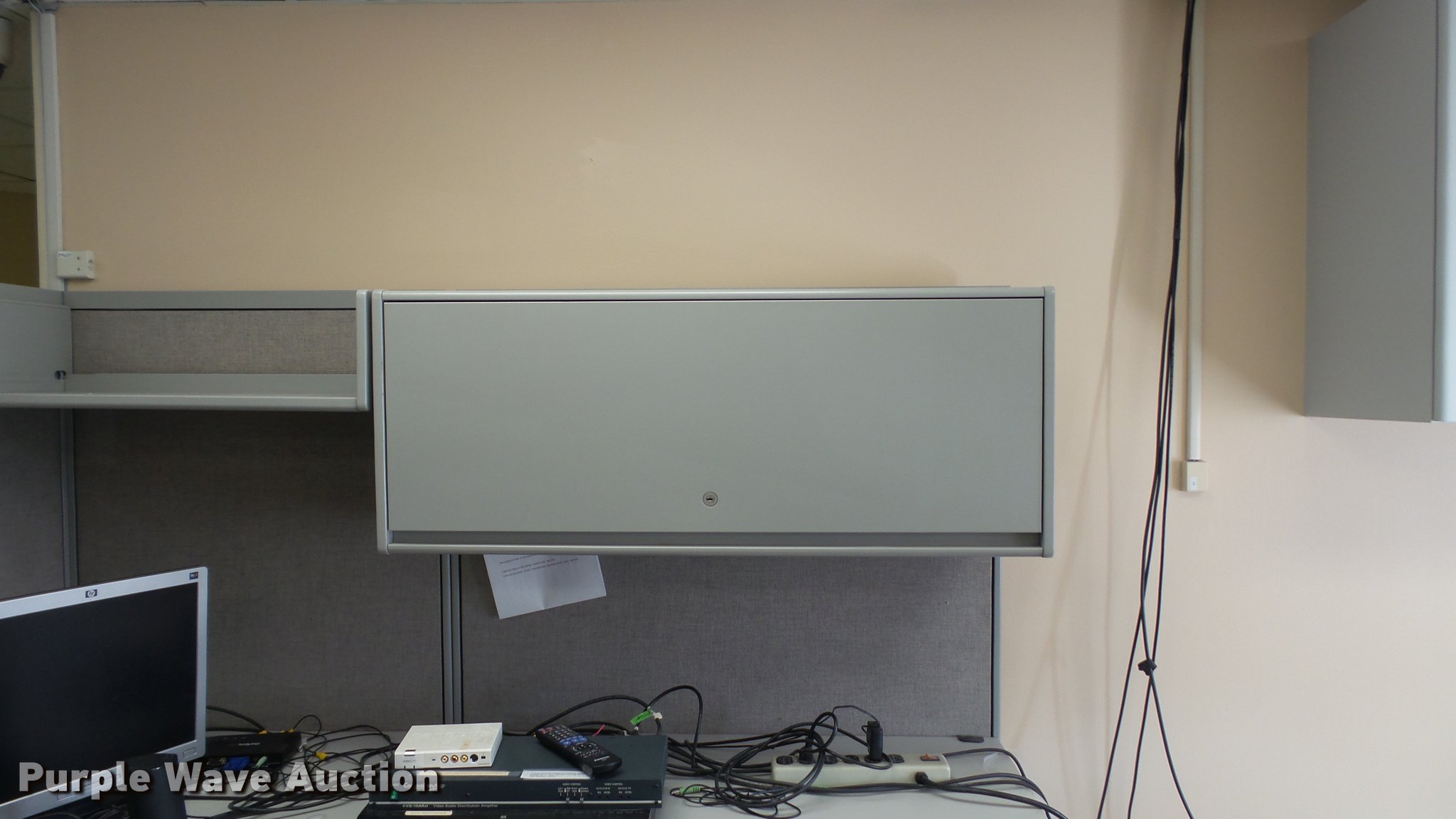 Purple Wave is selling a used Furniture in Missouri. This item is a Furniture with the following: Assorted cubicles, Walls, Work surface, Overhead storage cabinets, Lower file cabinets, Hardware, Wood council bench not included, Computer not included