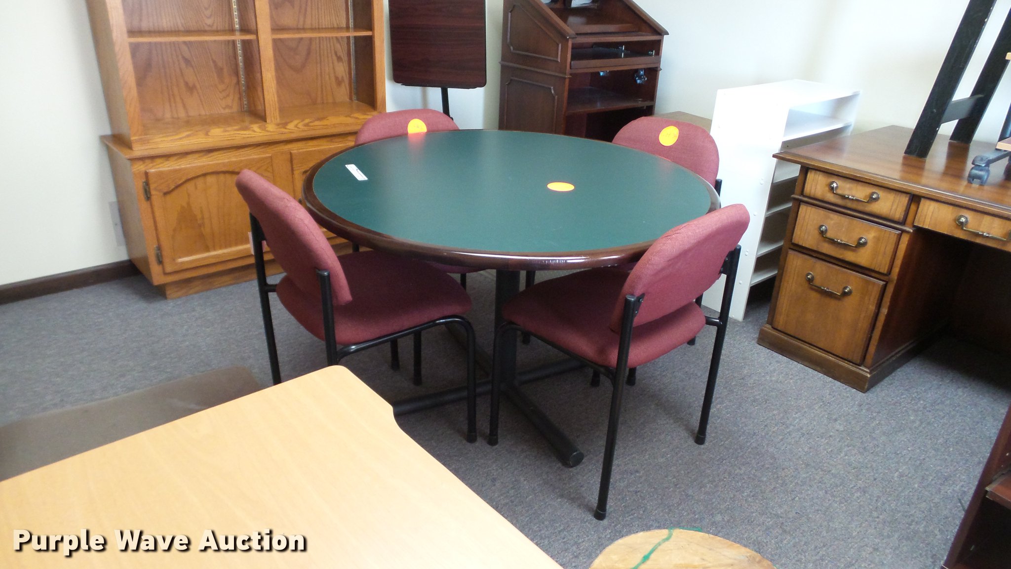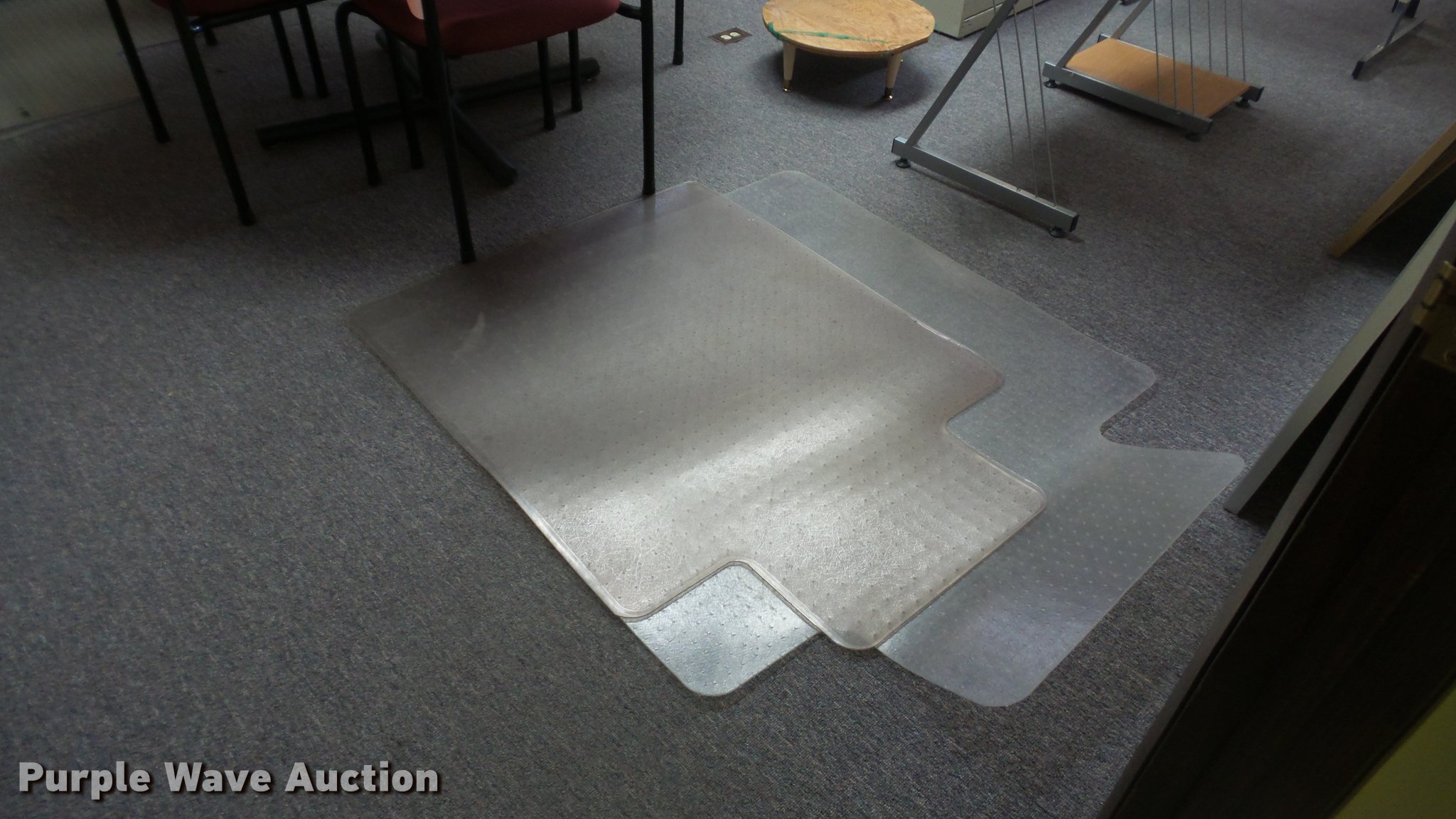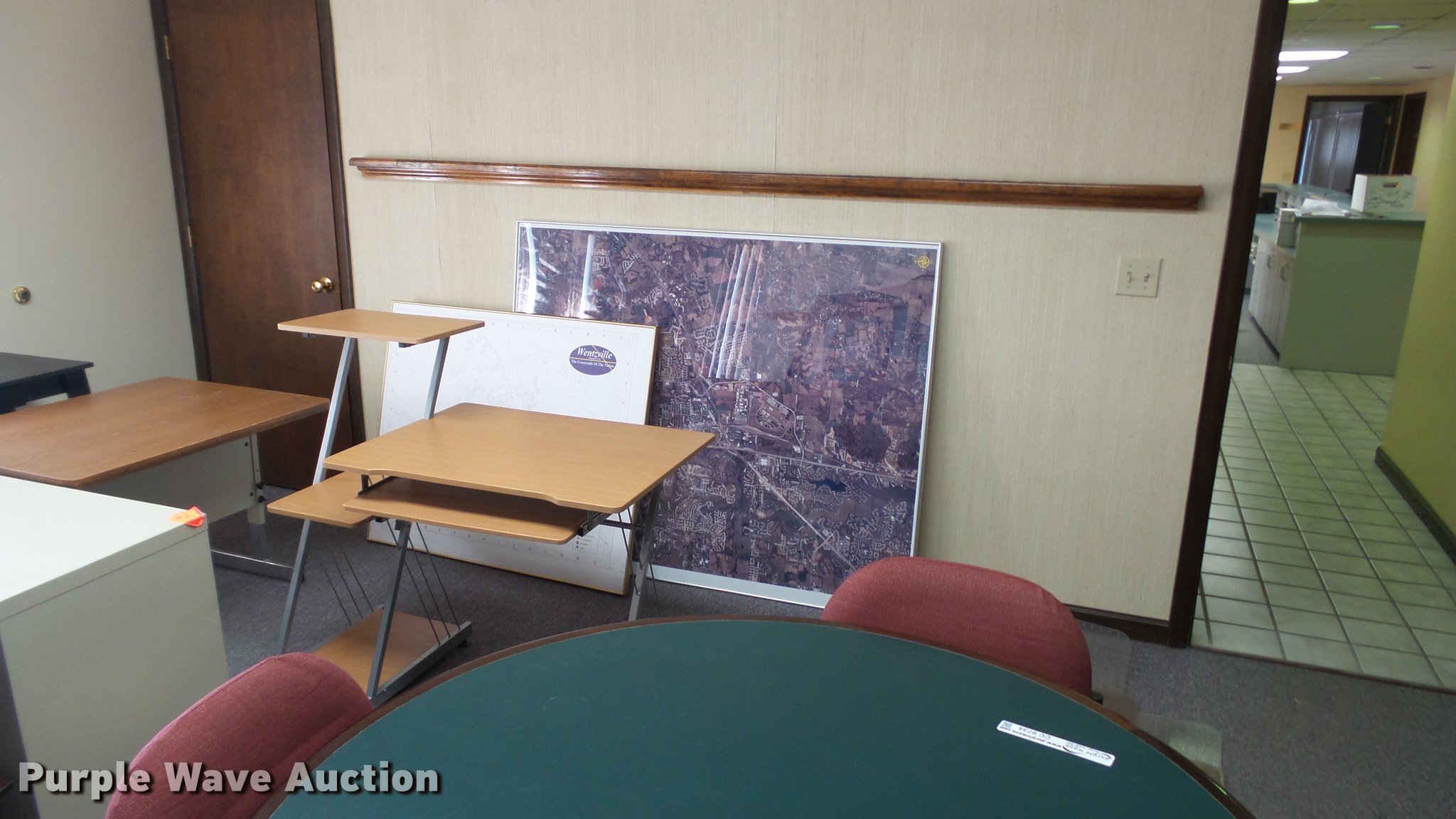 Purple Wave is selling a used Furniture in Missouri. This item is a Office furniture with the following: (4) desks, (2) hutches, (2) tables, (4) chairs, (3) end tables, (5) office chair floor mats, (2) framed photos, Two drawer file cabinet, Podium