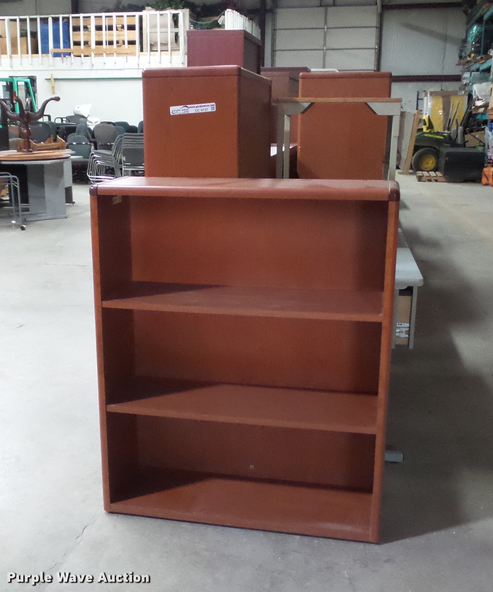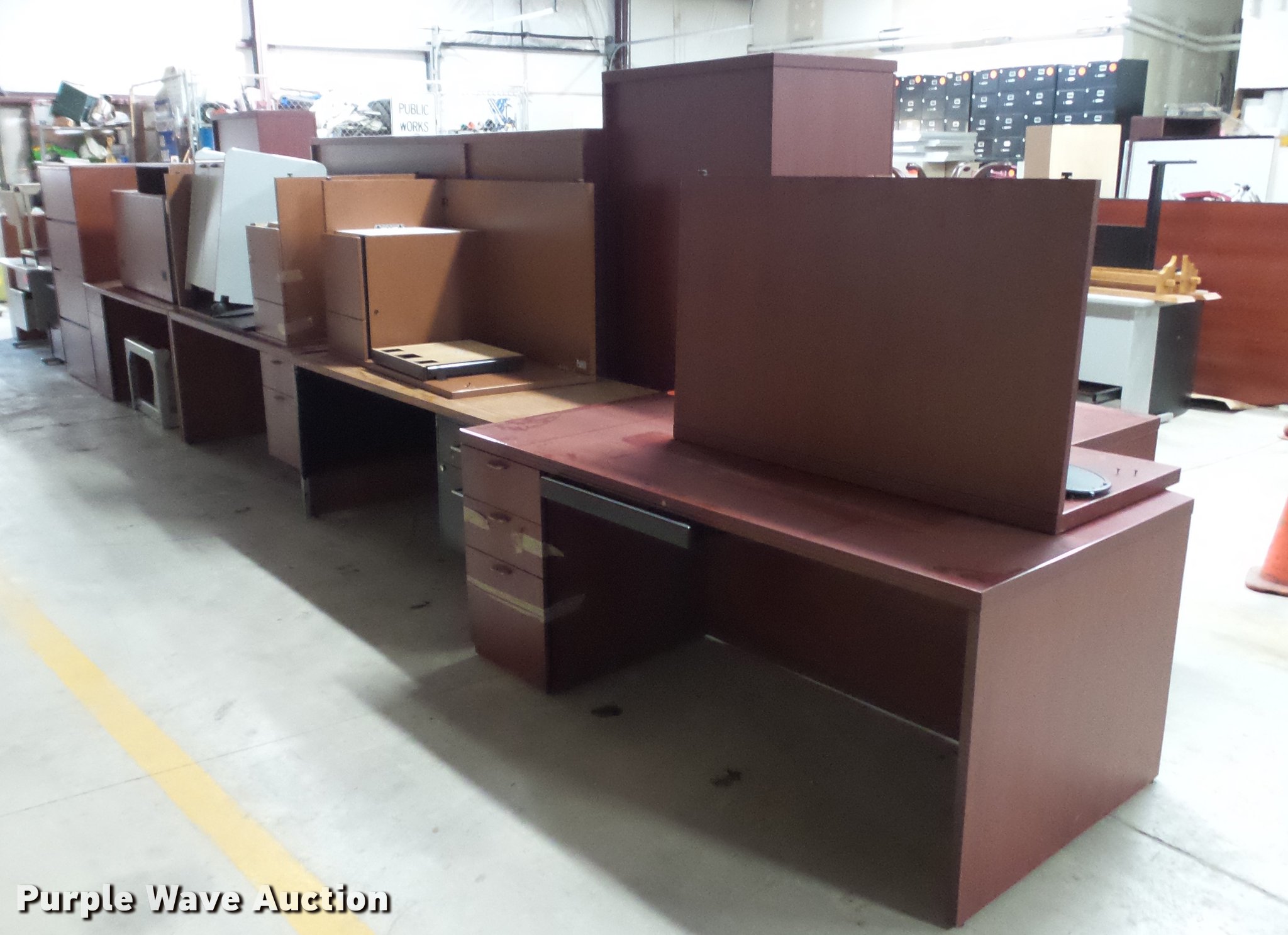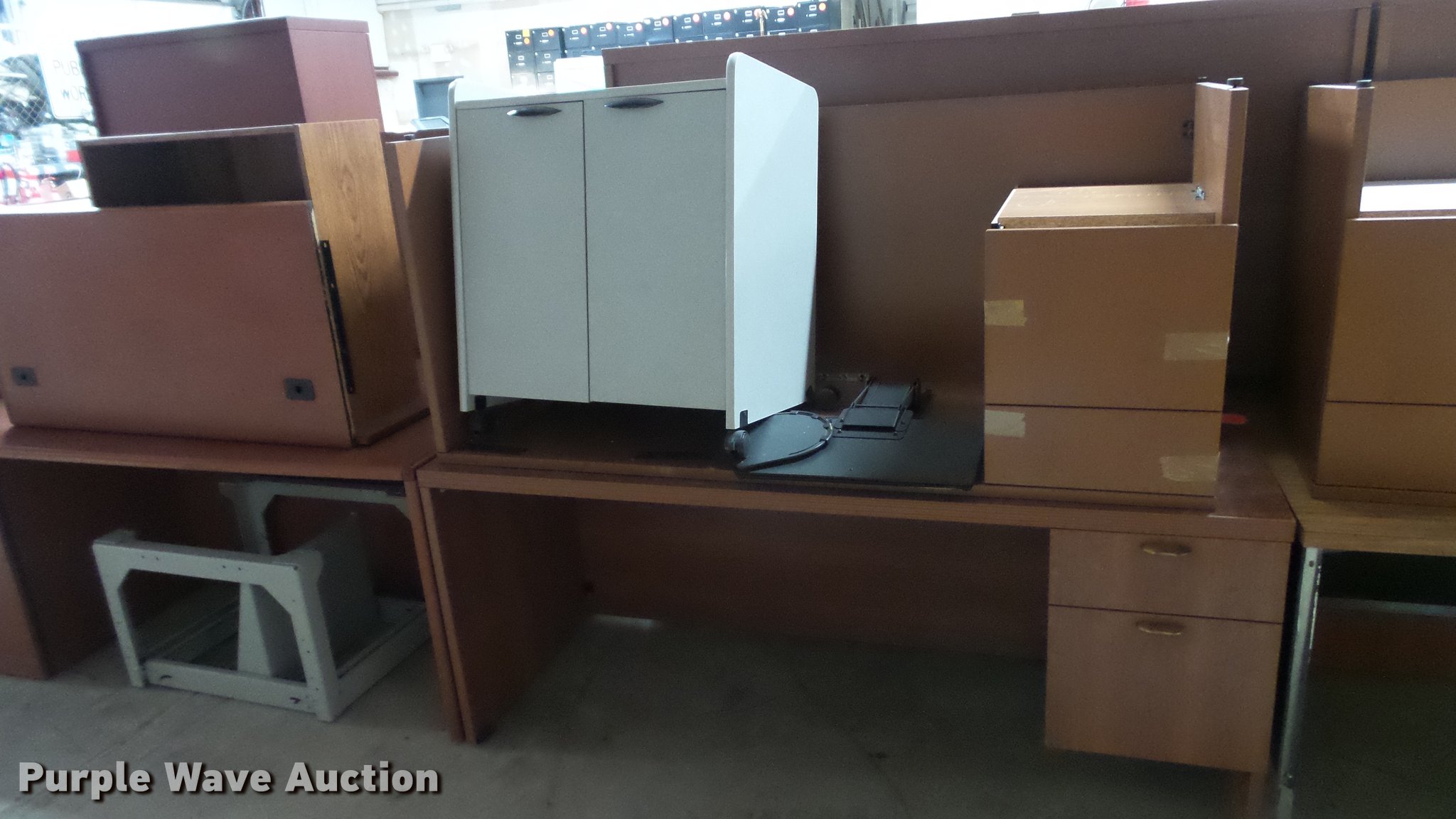 Purple Wave is selling a used Furniture in Missouri. This item is a Office furniture with the following: Desks, Rolling cart, Book shelves, File cabinet, Storage cabinet