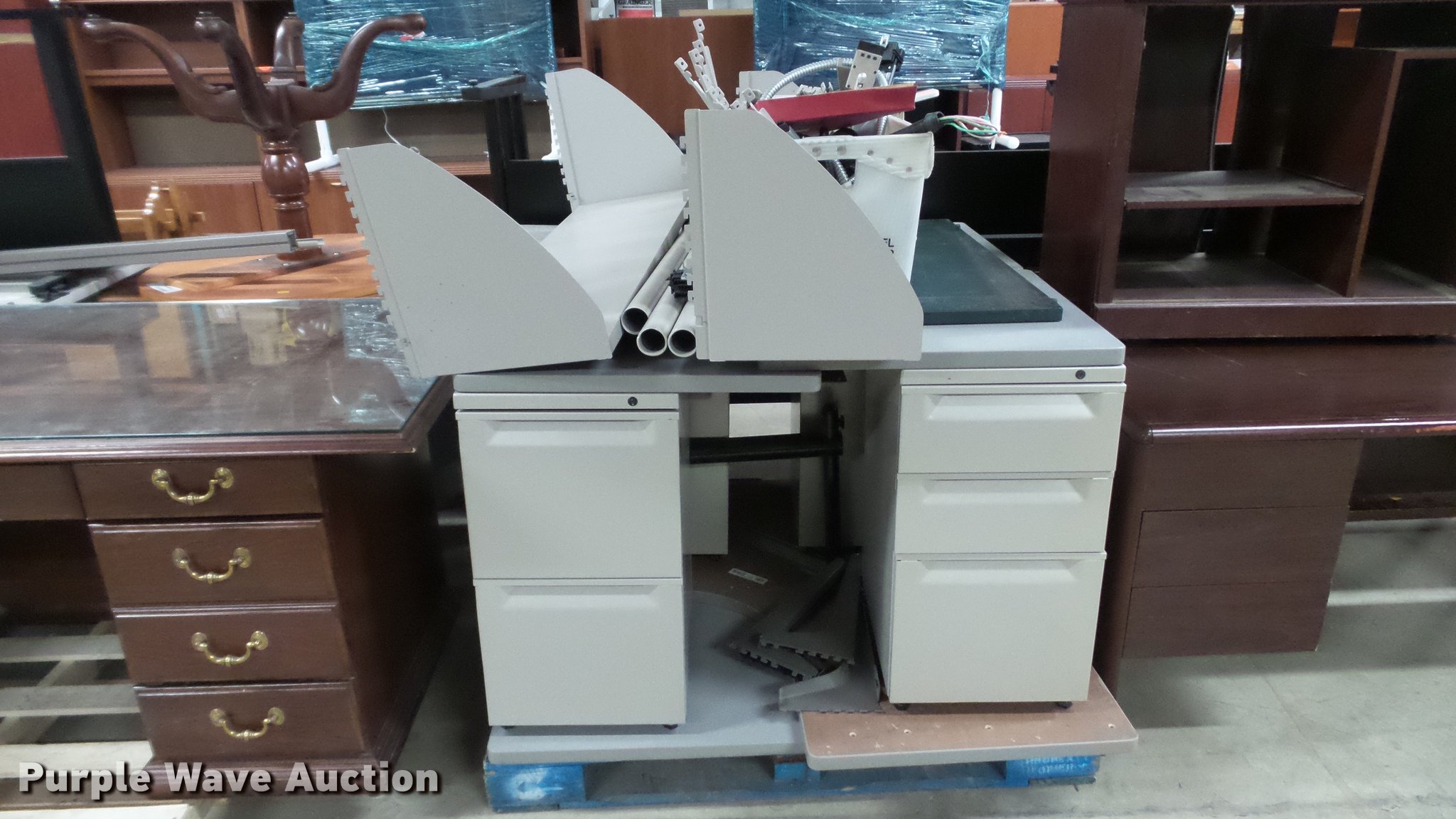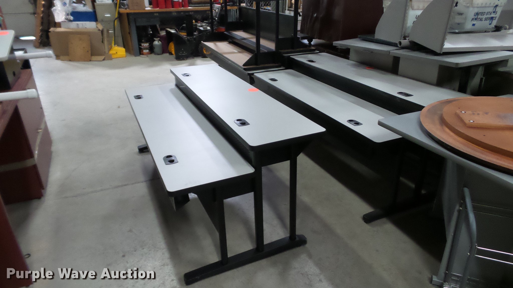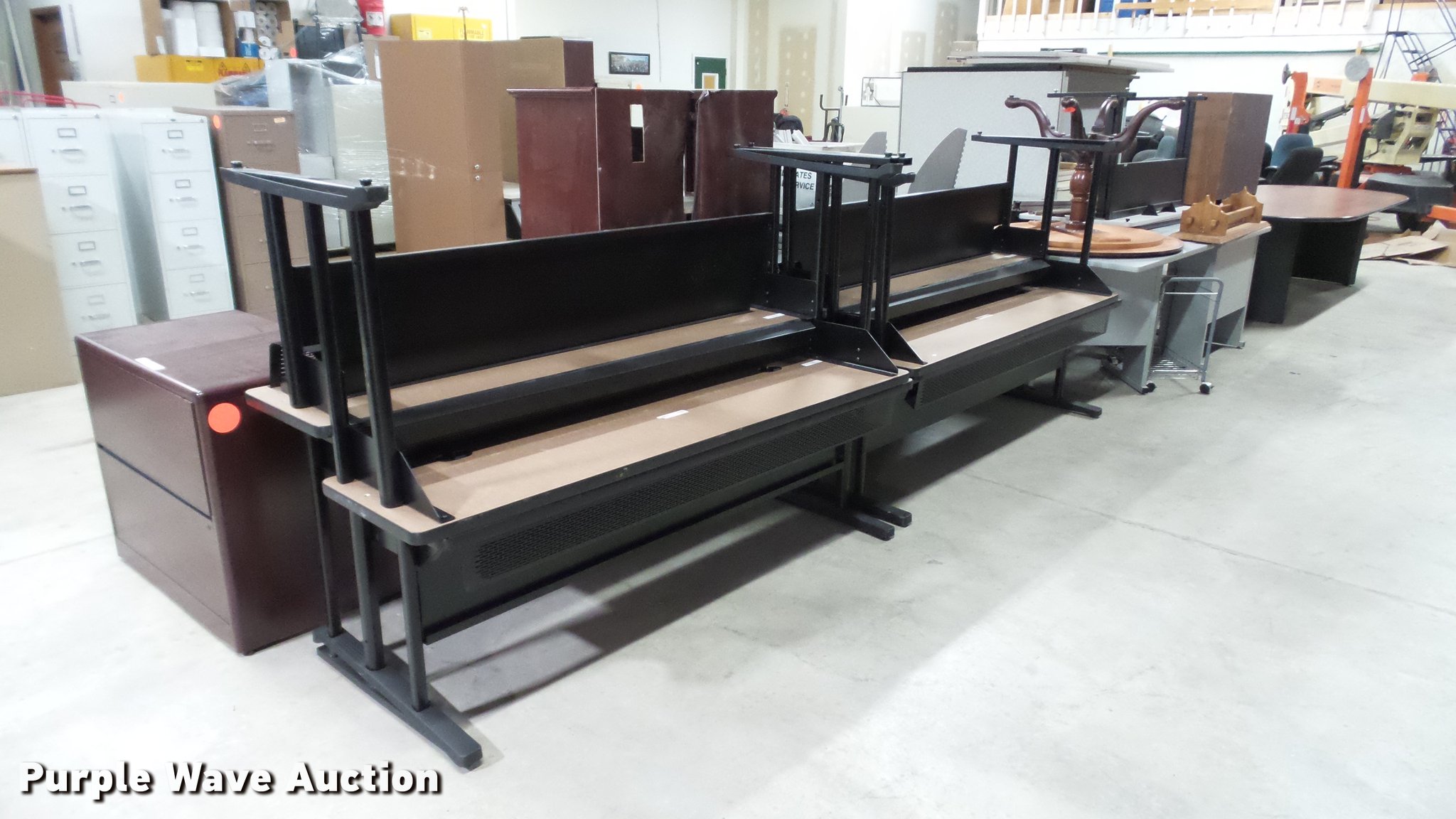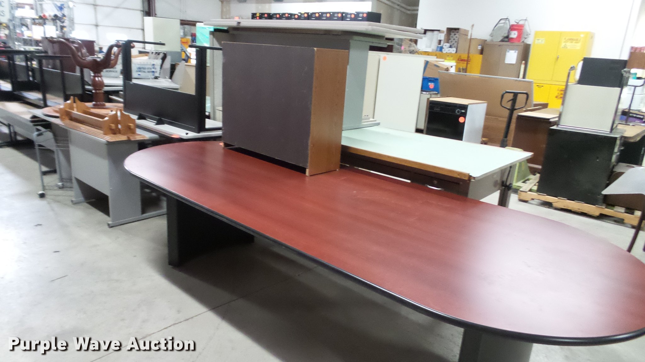 Purple Wave is selling a used Furniture in Missouri. This item is a Office furniture with the following: Desks, Electric powered tables, Round table, Rolling cart, Wood shelves, Conference table, Drafting table, Map storage cabinet, Cubicle parts