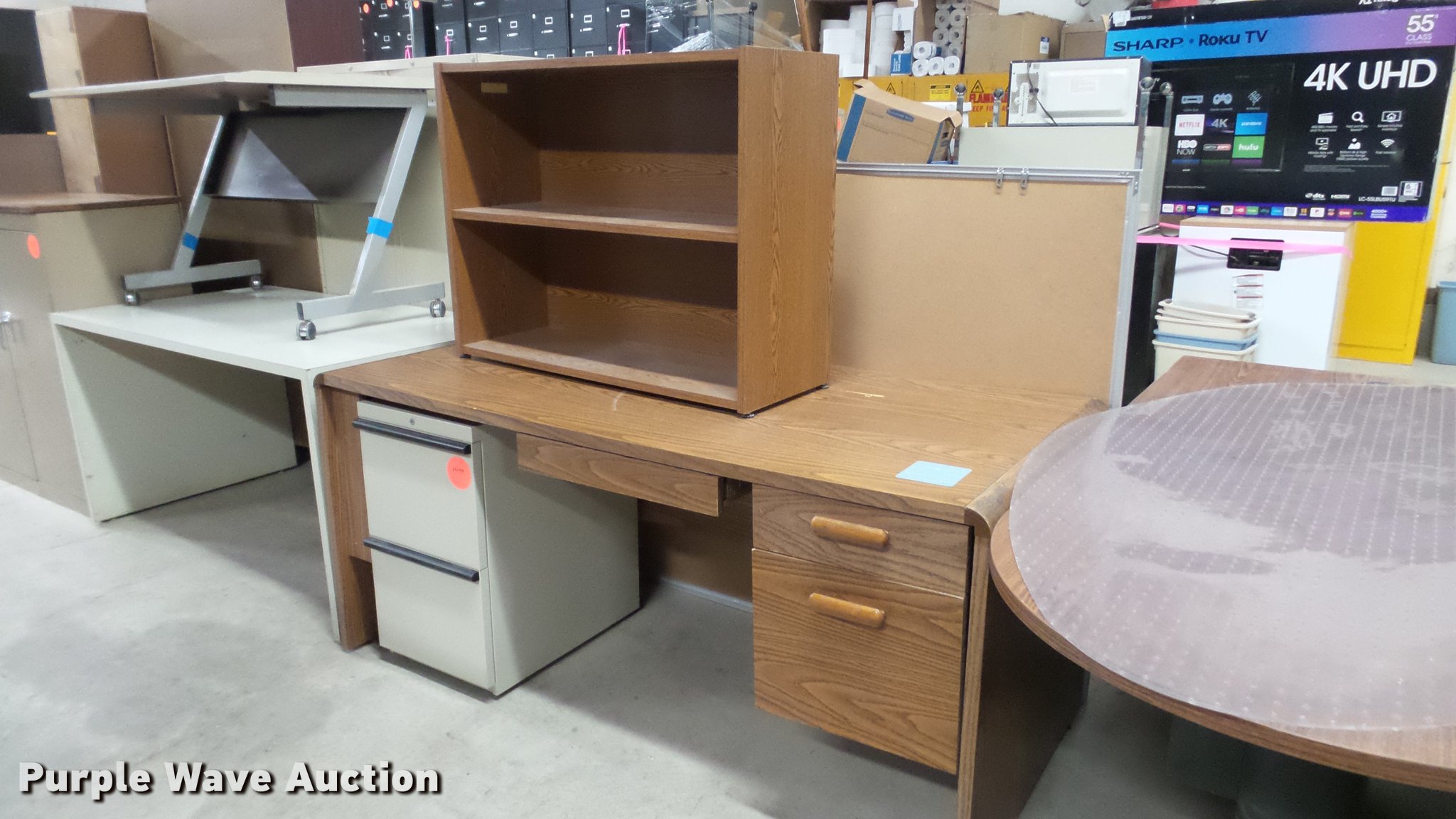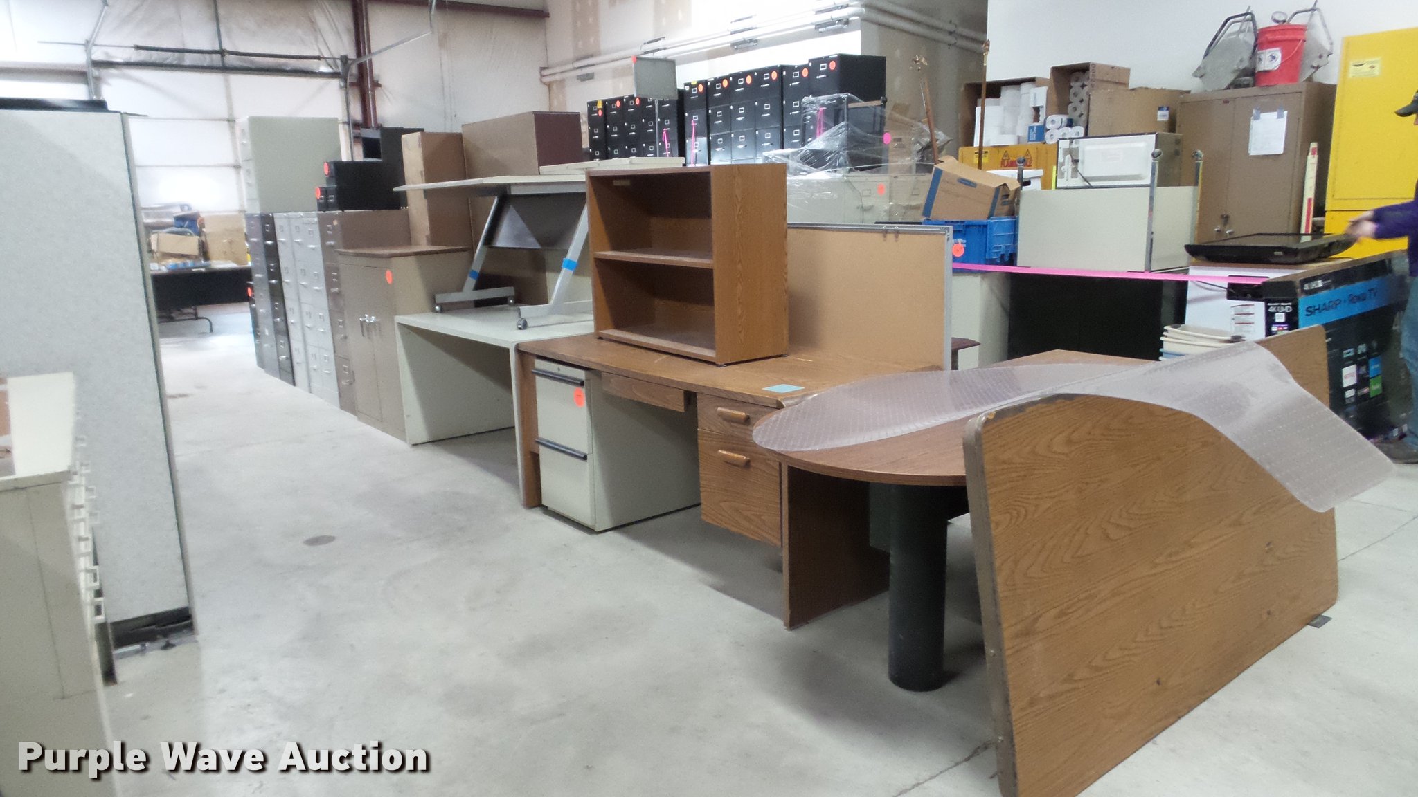 Purple Wave is selling a used Furniture in Missouri. This item is a Office furniture with the following: Desks, File cabinets, Storage cabinets, Rolling cart mat, Folding table, Book shelves