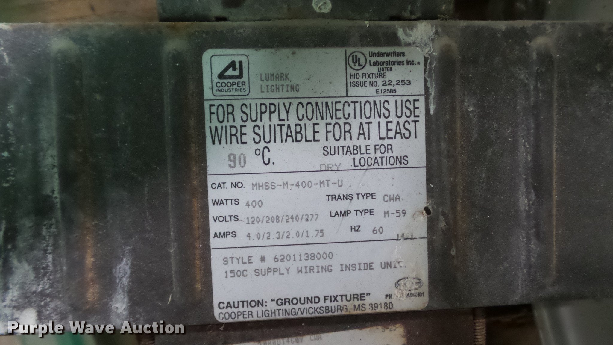 Purple Wave is selling a used Building Materials in Missouri. This item is a Lighting with the following: (8) Cooper Industries, 400 watts, H-59 lamp, Unknown operating condition, Assorted fluorescent light fixtures, Bulbs, Unknown operating condition
