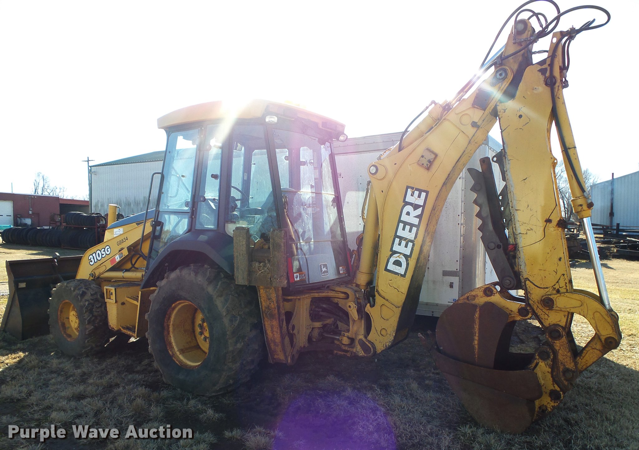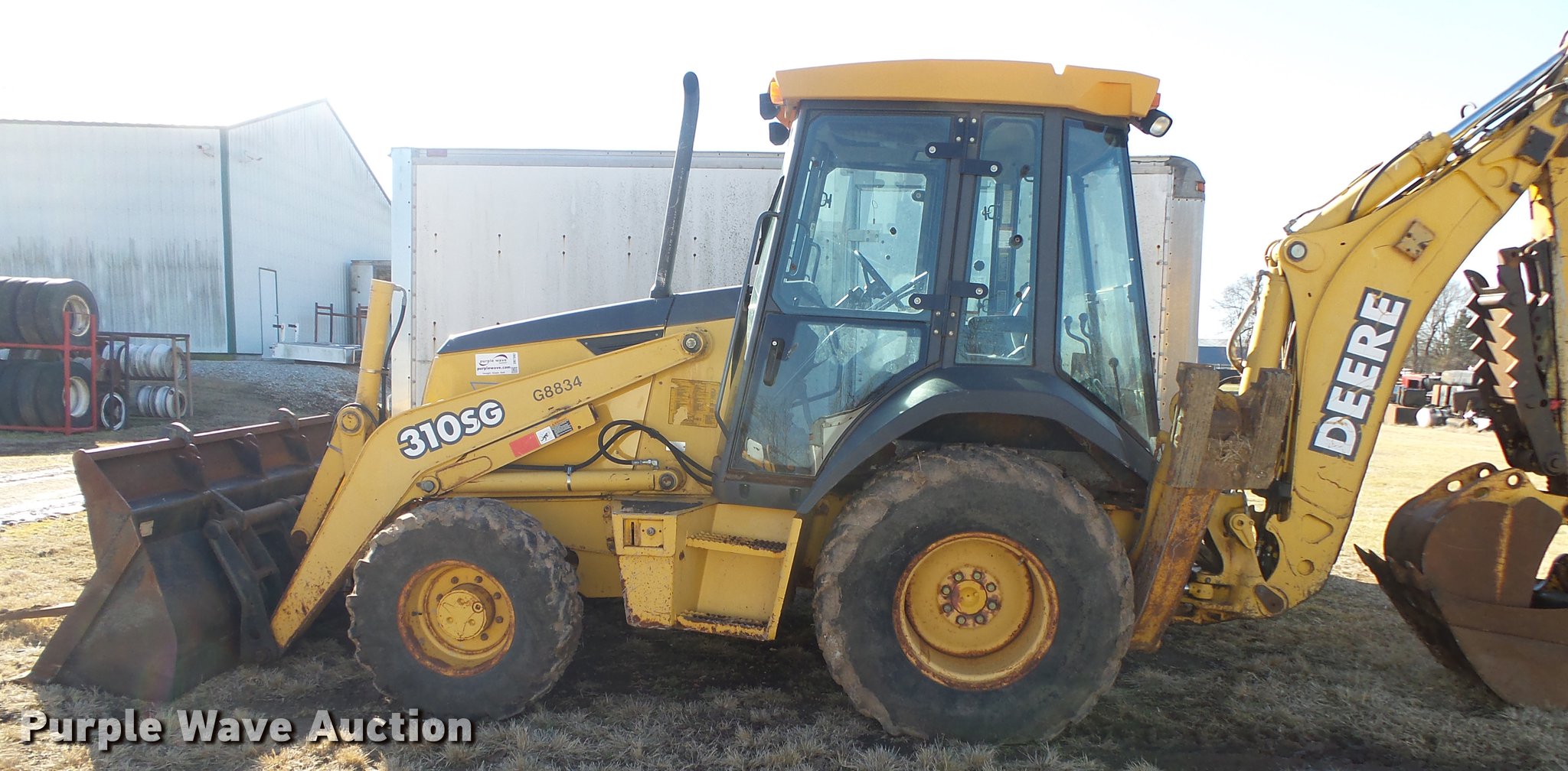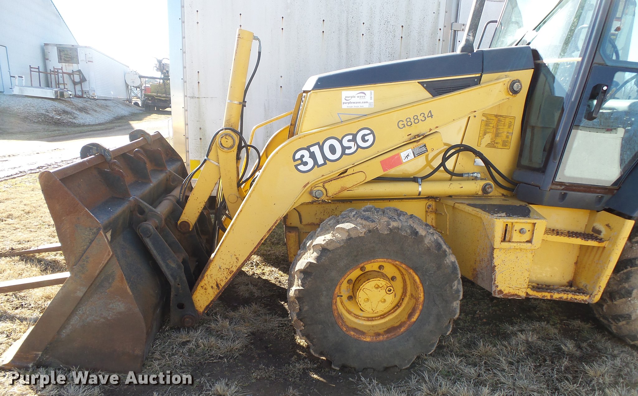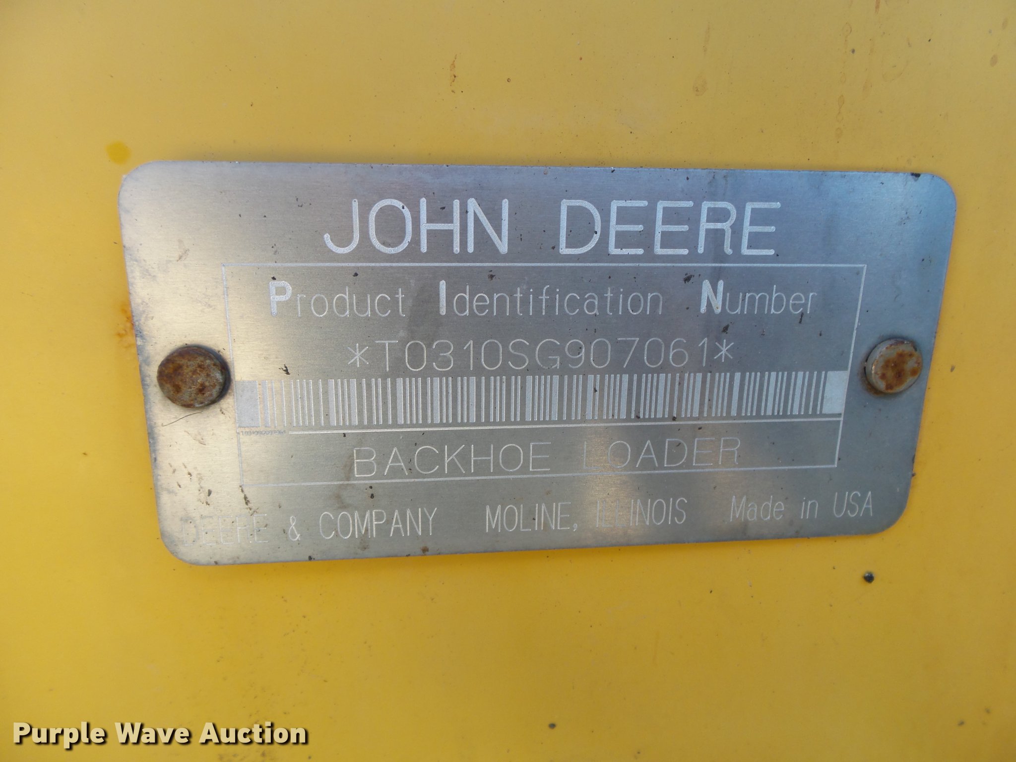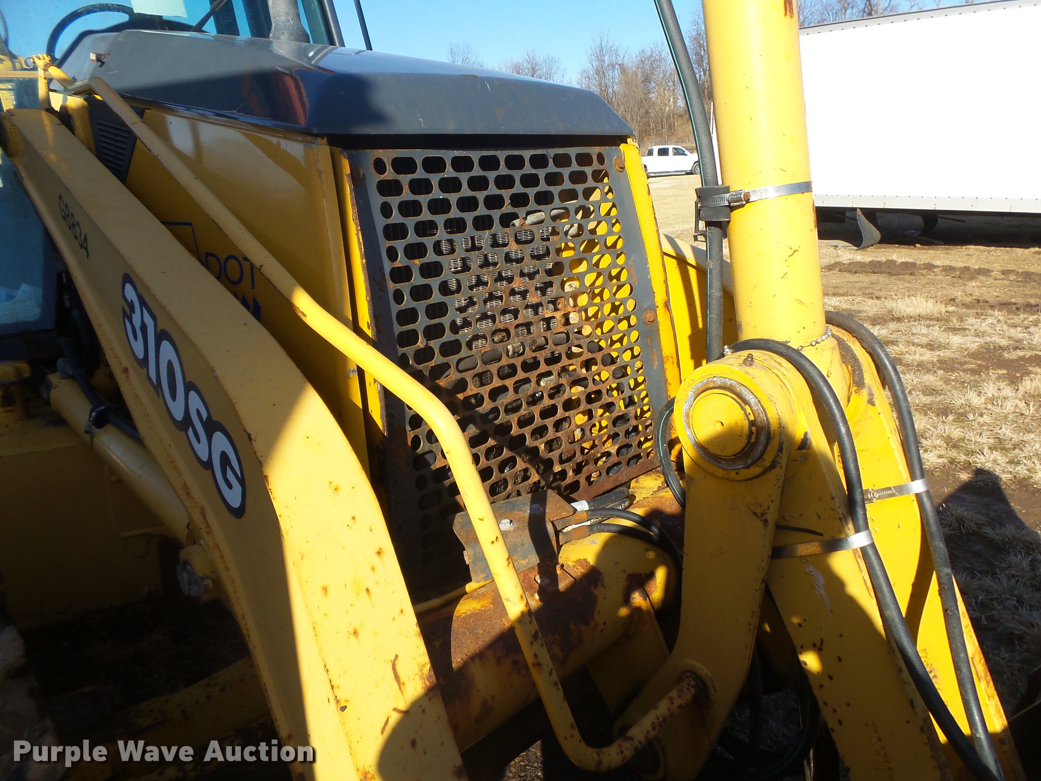 Purple Wave is selling a used Tractor Loader Backhoe in Missouri. This item is a 2002 John Deere 310 SG backhoe with the following: 5,852 hours on meter, John Deere 4045T1084 four cylinder turbo diesel engine, Shuttle shift transmission, 4F-4R gears, Four wheel drive, Locking differential, EROPS, Suspension seat, Wobble stick backhoe controls, Wipers, 86"W loader bucket, Weld-on cutting edge, Hydraulic quick coupler, Pallet forks, E-stick, John Deere 18"W backhoe bucket, Weld-on cutting edge, (4) teeth, 48" thumb, John Deere 24"W bucket, (4) teeth, Manual quick coupler, 620/80R18 front tire, 12.5/80-18 front tire, 500/70R24 rear tire, 19.5LR24 rear tire, AC removed, Transmission/hydraulic cooler removed, Wipers missing, Serial T0310SG907061, MODOT ID G8834