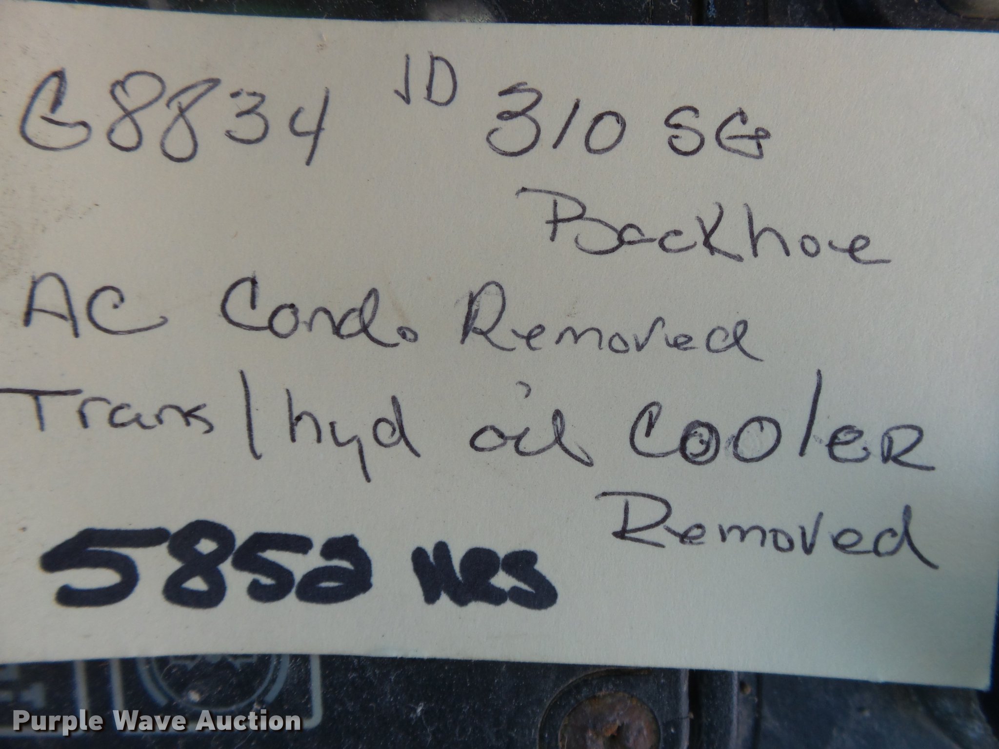 2002 John Deere 310 SG backhoe. 5,852 hours on meter, John Deere 4045T1084 four cylinder turbo diesel engine, Shuttle shift transmission 4F-4R gears, Four wheel drive, Locking differential, EROPS, Suspension seat, Wobble stick backhoe controls, Wipers, 86"W loader bucket Weld-on cutting edge, Hydraulic quick coupler, Pallet forks, E-stick, John Deere 18"W backhoe bucket Weld-on cutting edge, (4) teeth, 48" thumb, John Deere 24"W bucket (4) teeth, Manual quick coupler, 620/80R18 front tire, 12.5/80-18 front tire, 500/70R24 rear tire, 19.5LR24 rear tire, AC removed, Transmission/hydraulic cooler removed, Wipers missing, Serial T0310SG907061, MODOT ID G8834. Missouri Department of Transportation (MODOT). 615 W Bypass. Springfield, MO 65802