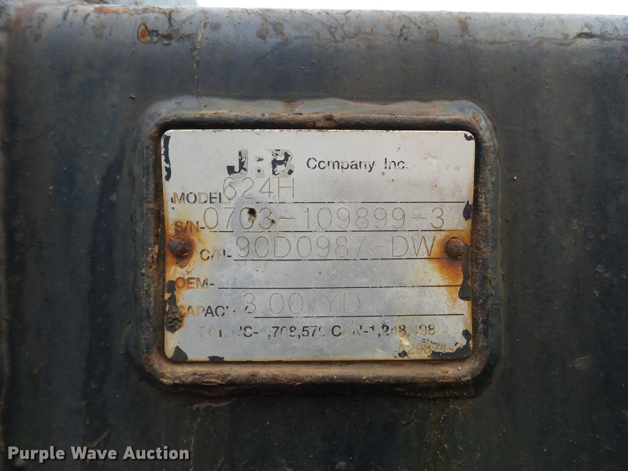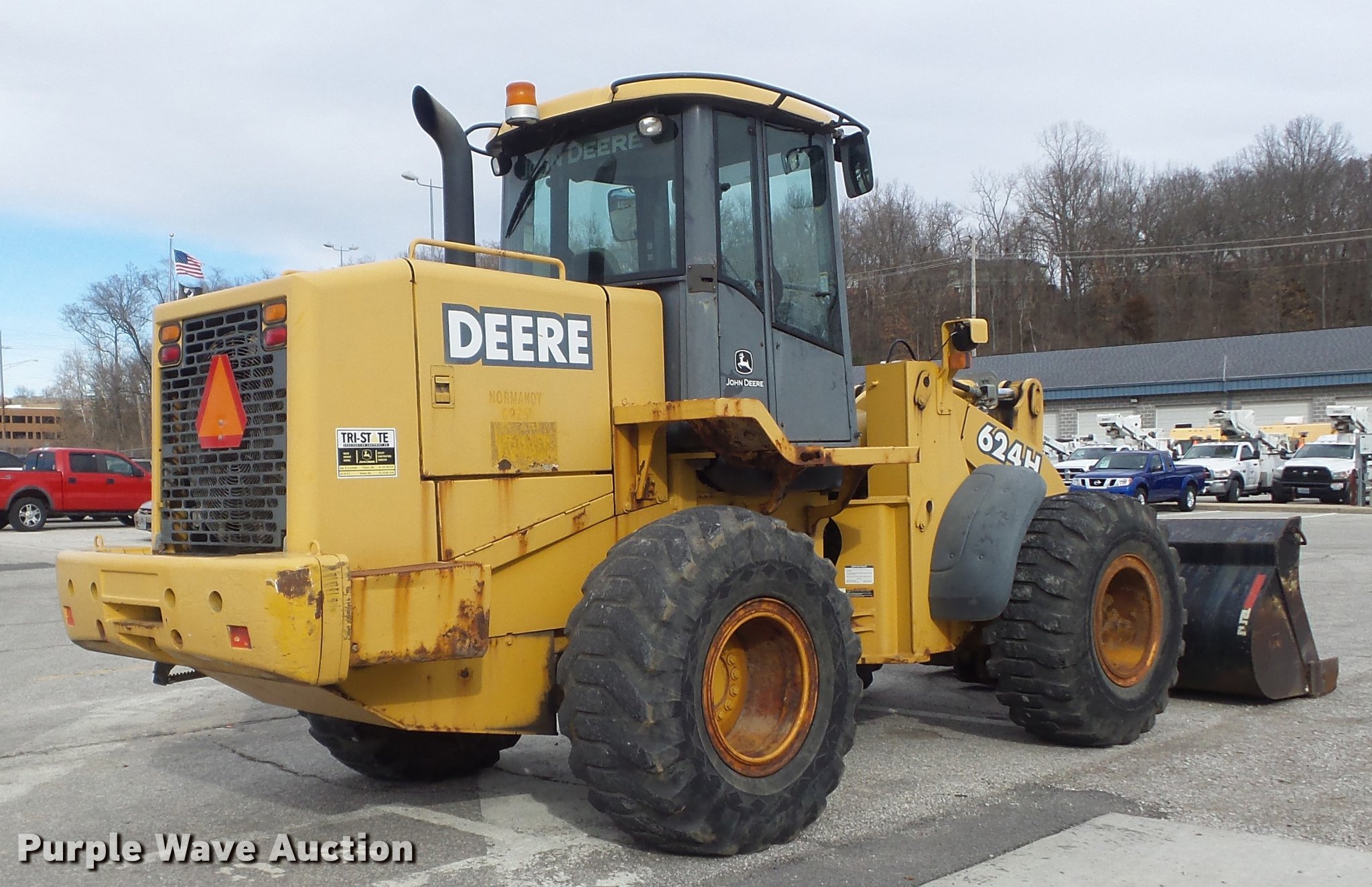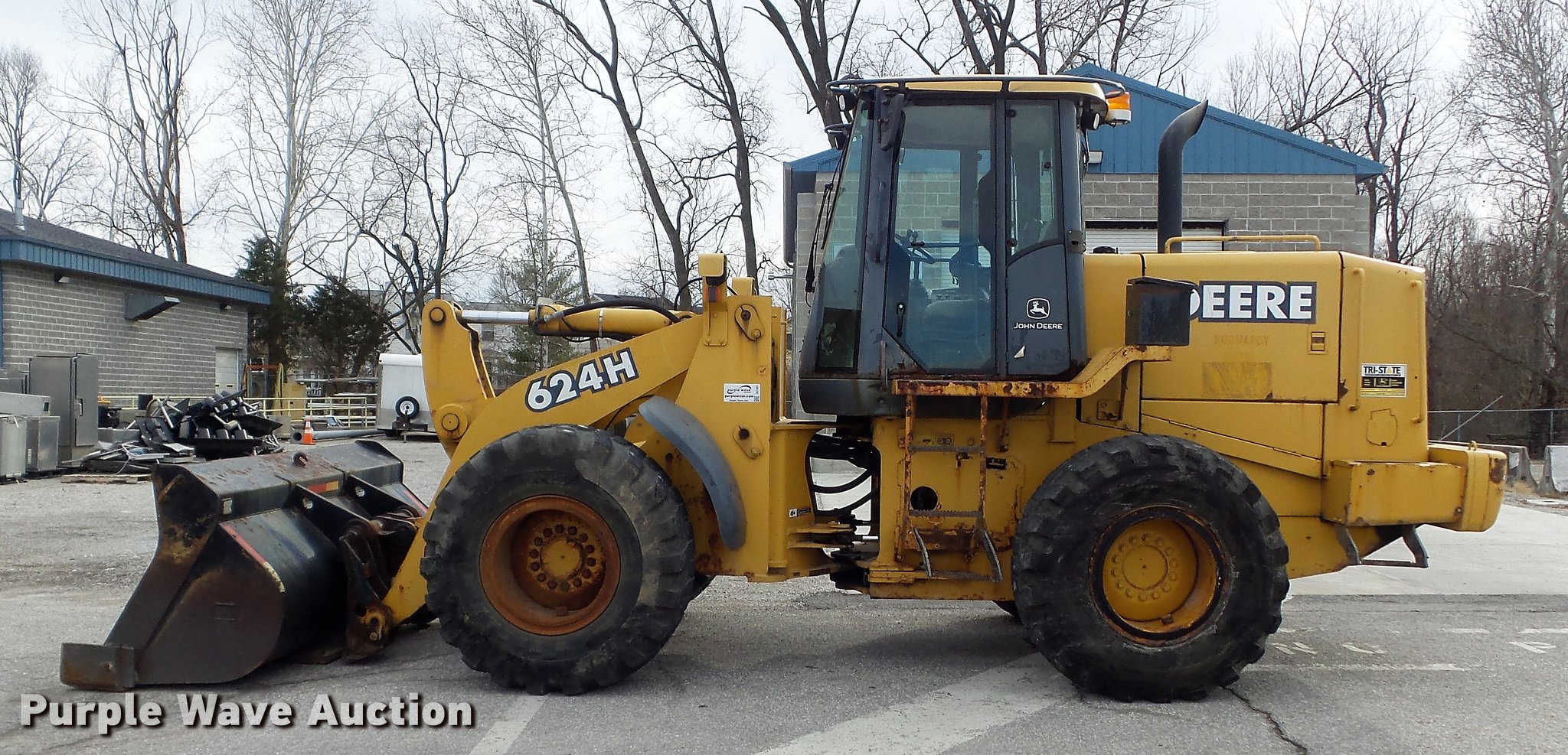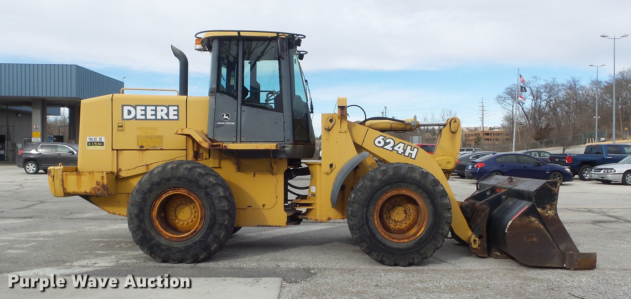 Purple Wave is selling a used Wheel Loader in Missouri. This item is a 2003 John Deere 624H wheel loader with the following: 6,792 hours on meter, John Deere 6068H 6.8L six cylinder turbo diesel engine, 160 HP, Serial PE6068H295309, Powershift transmission, 4F-3R gears, Differential lock, Enclosed cab, Heat, Tilt steering wheel, Suspension seat, Joystick bucket controls, Front and rear work lights, Wipers, Block heater, Ether start, JRB 624H 108"W general purpose bucket, Bolt-on cutting edge, Three cu. yd. capacity, JRB 624H pallet forks, 48"L, Hydraulic quick coupler, Counterweights, 20.5-25 tires, Non-operational parking brake, Possible bearing and seal issues, Front drive shafts removed due to brake issue, Non-operational return to dig function, Serial DW624HX589025