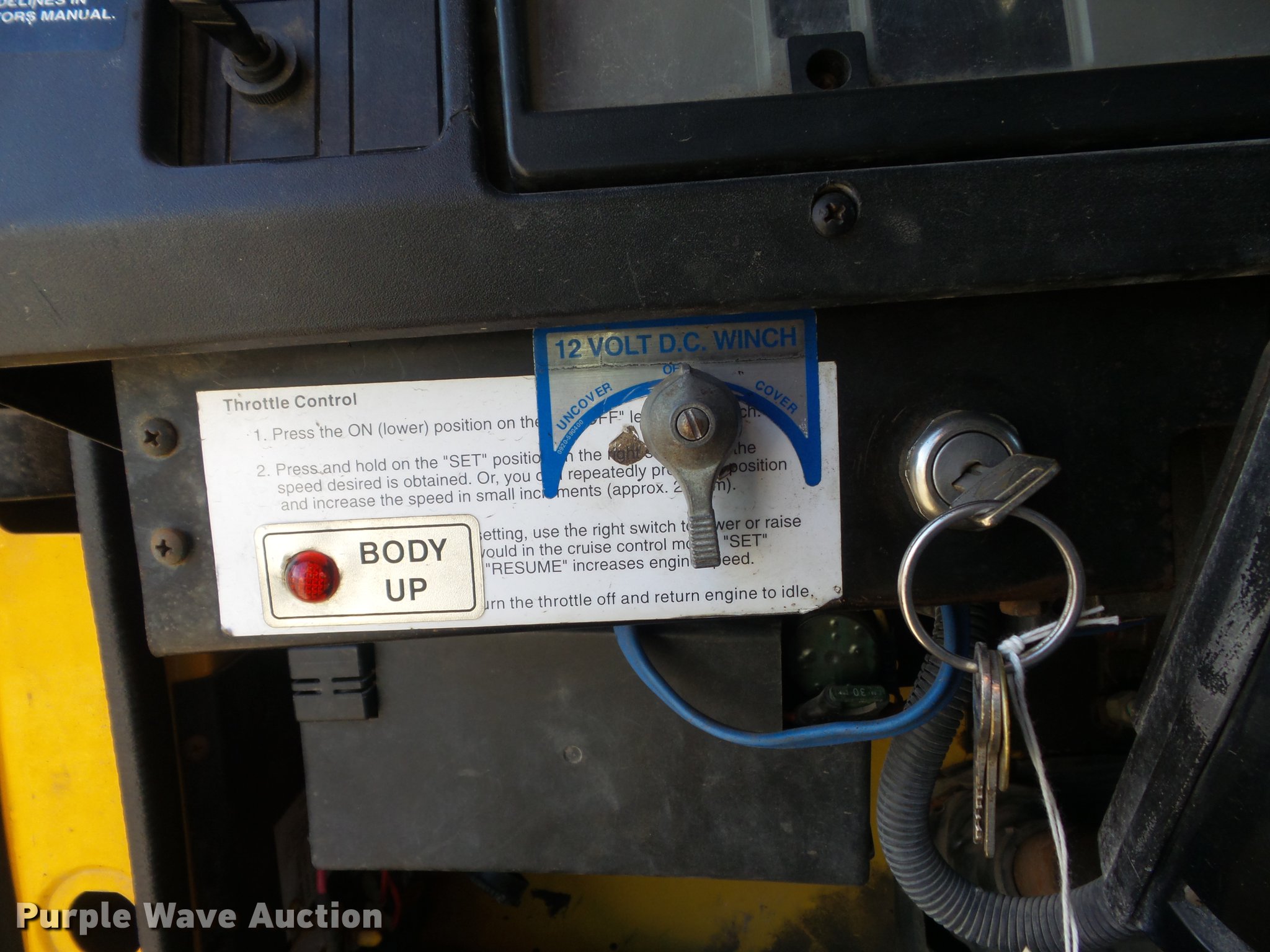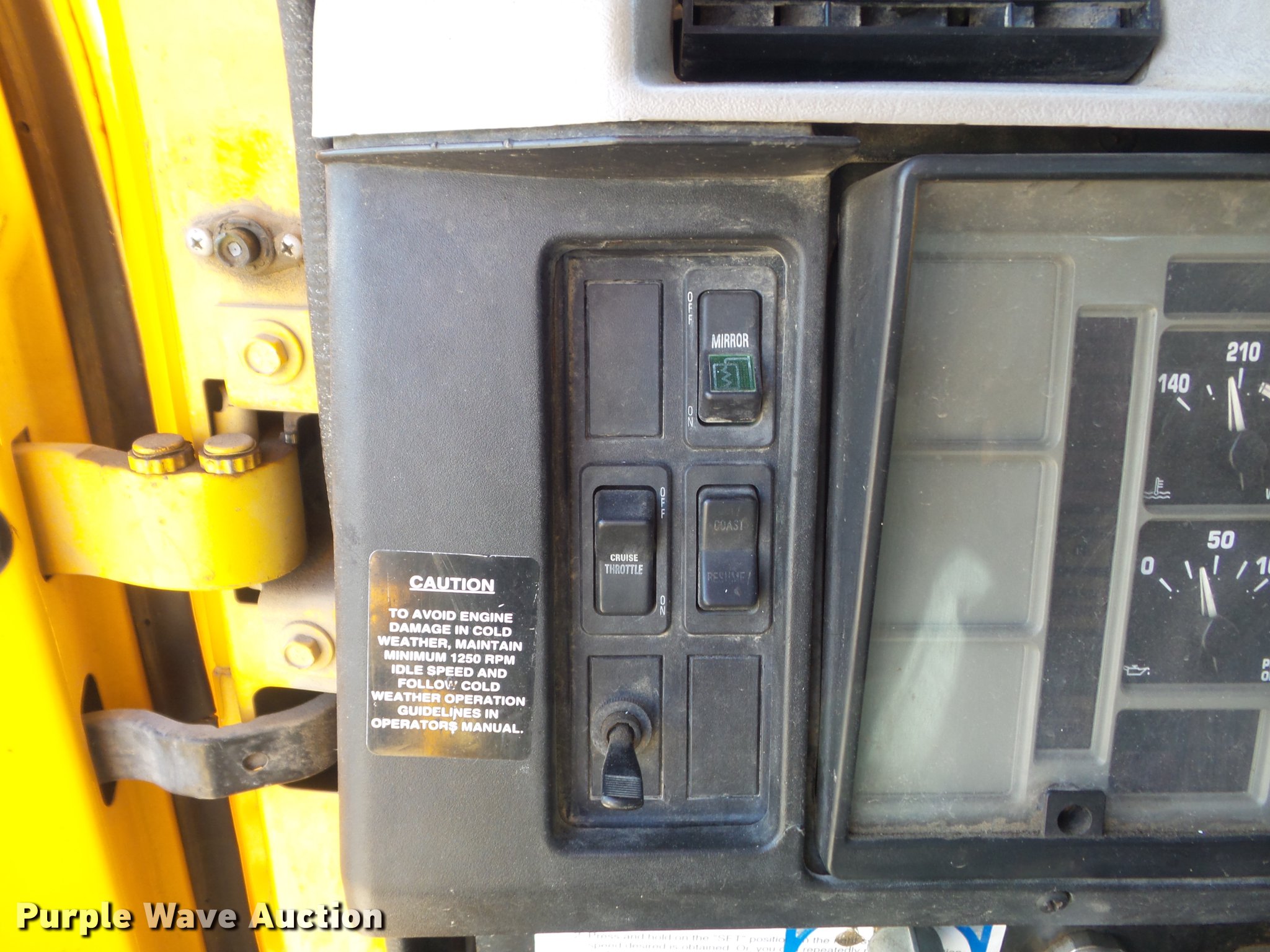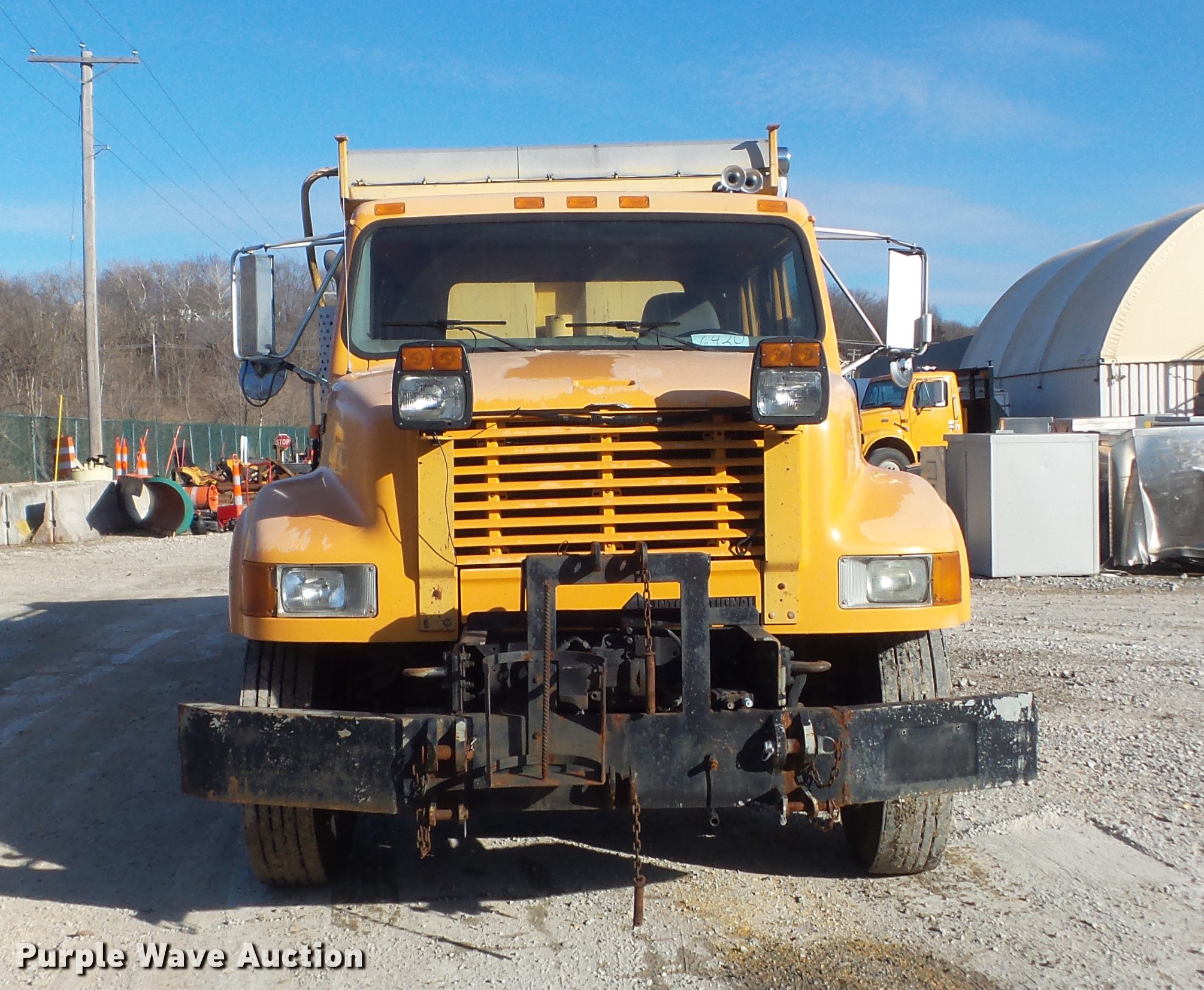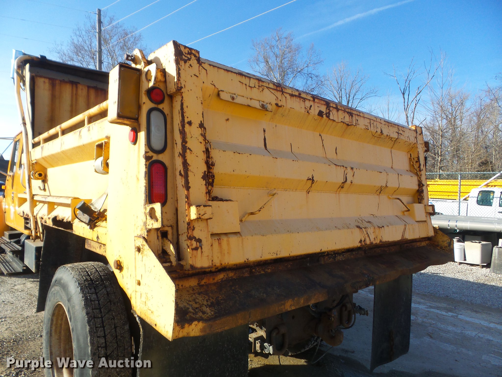 Purple Wave is selling a used Construction Dump Truck in Missouri. This item is a 2001 International 4900 dump truck with the following: 25,065 miles on odometer, 2,603 hours on meter, International DT466 7.6L L6 turbo diesel engine, Allison automatic transmission, Single axle, Heat, Cruise, AM/FM/weatherband, Heated mirrors, Air suspension seat, Front mount PTO, Block heater, 10'L x 96"W steel dump bed, 24" side height, Single ram hoist, Air operated end gate, Roll tarp, Single fuel tank, 206" wheelbase, Pintle hitch, Trailer wiring, Spring suspension, Air brakes, 11R22.5 tires, GVWR 34,220 lbs, FAWR 13,220 lbs, RAWR 21,000 lbs, Windshield chipped, MODOT ID 6420