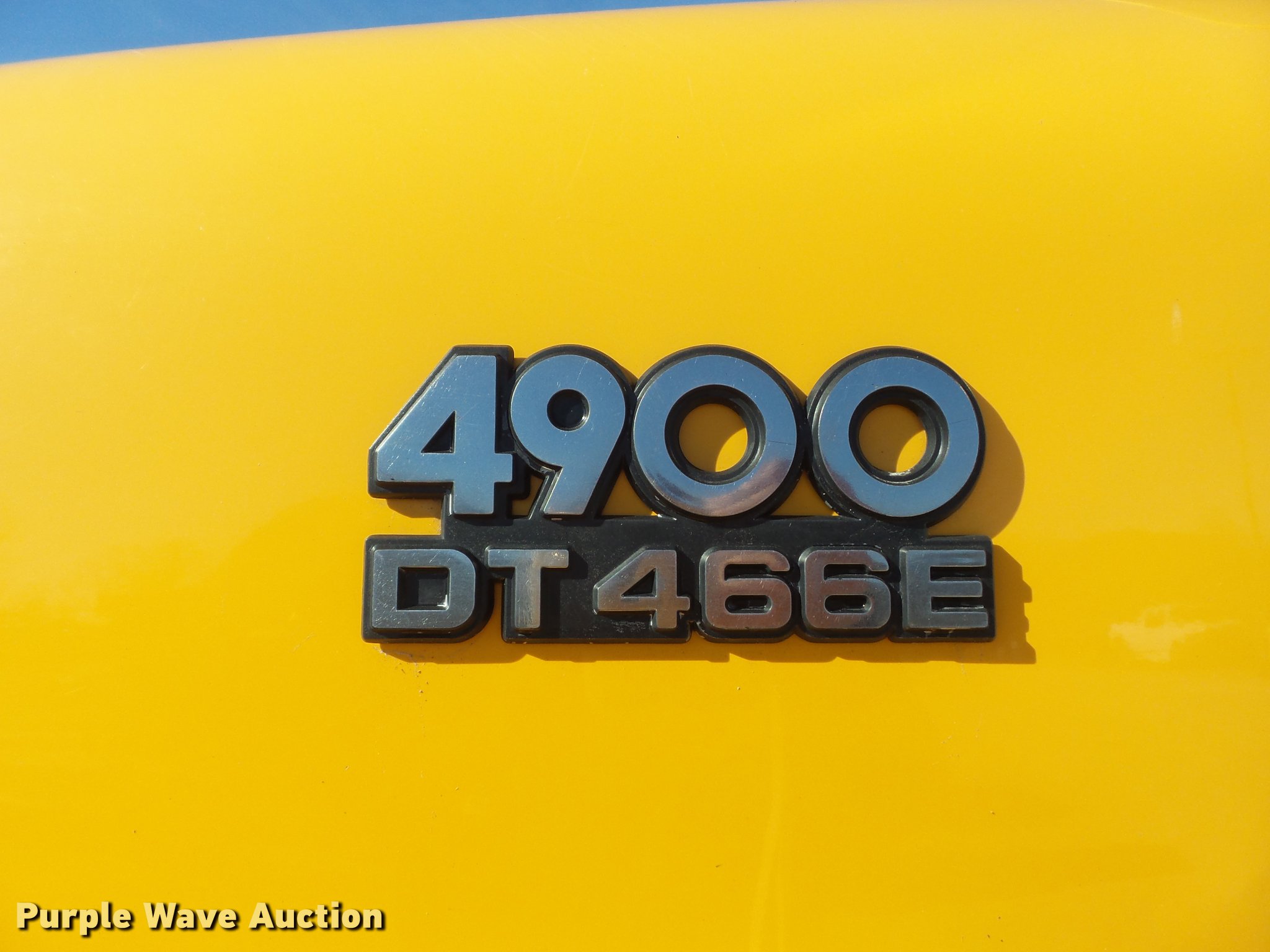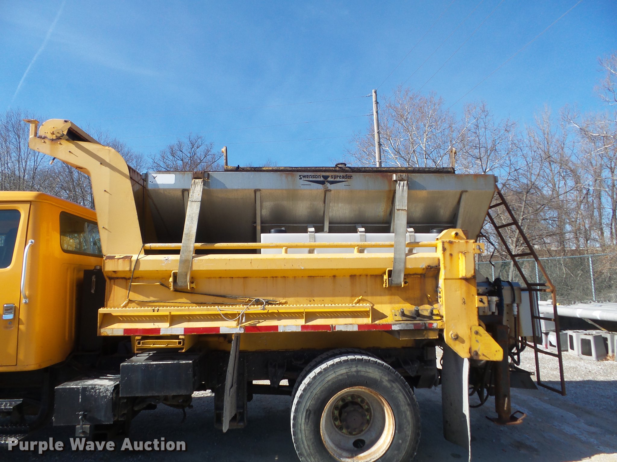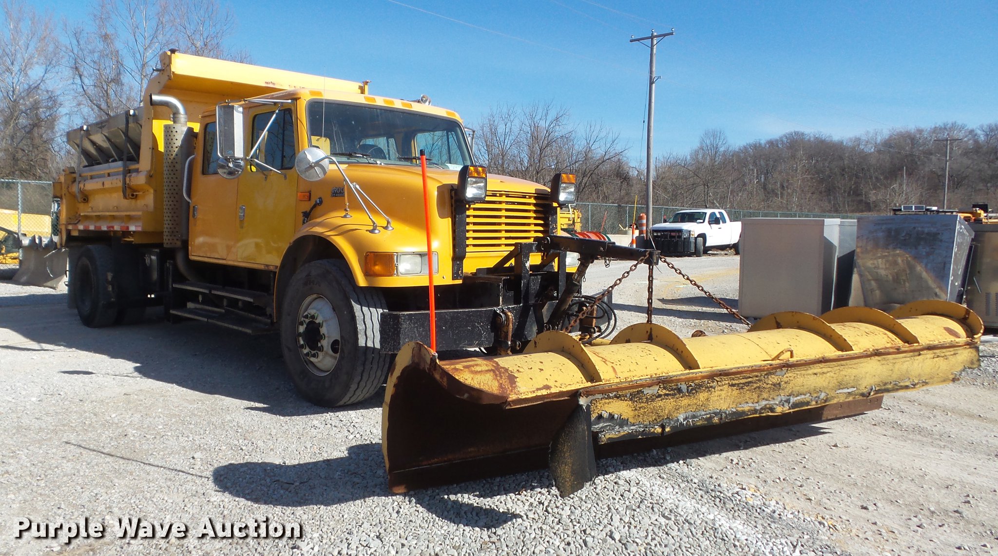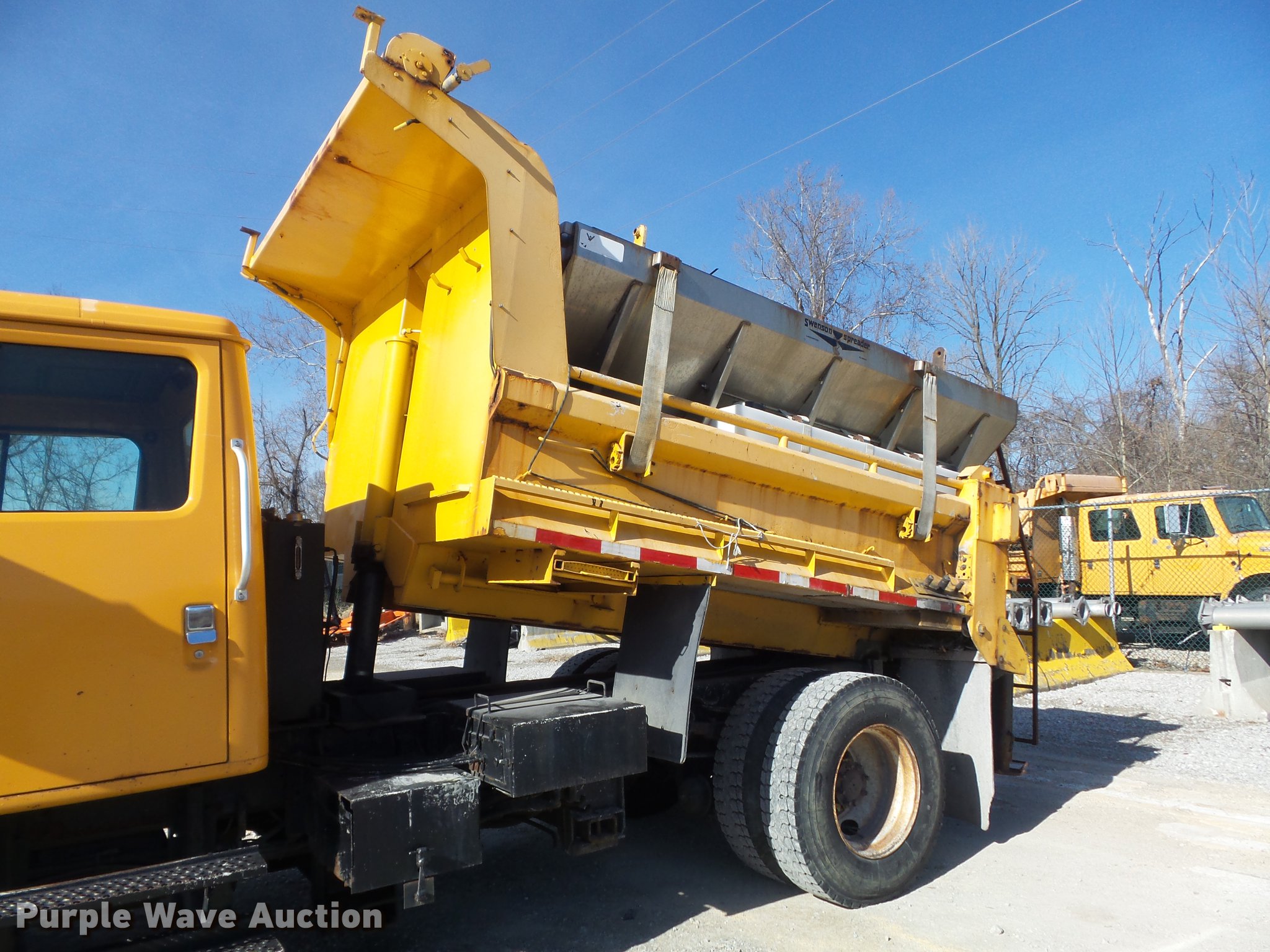 Purple Wave is selling a used Construction Dump Truck in Missouri. This item is a 2002 International 4900 dump truck with the following: 196,870 miles on odometer, 13,845 hours on meter, International DT466E 7.6L L6 turbo diesel engine, Allison automatic transmission, Single axle, AC and heat, Cruise, AM/FM/weatherband, Power windows, Power and heated mirrors, Air suspension seat, Brake controller, PTO, Toolboxes, Wheeler steel dump bed, 10'L x 96"W, 24" side height, Roll tarp, Bed vibrator, Single ram hoist, Air operated end gate, 12'W plow, Swenson spreader, Single fuel tank, Pintle hitch, Spring suspension, Air brakes, 206" wheelbase, 315/80R22.5 front tires, 11R22.5 rear tires, GVWR 37,000 lbs, FAWR 16,000 lbs, RAWR 21,000 lbs, MODOT ID 6670