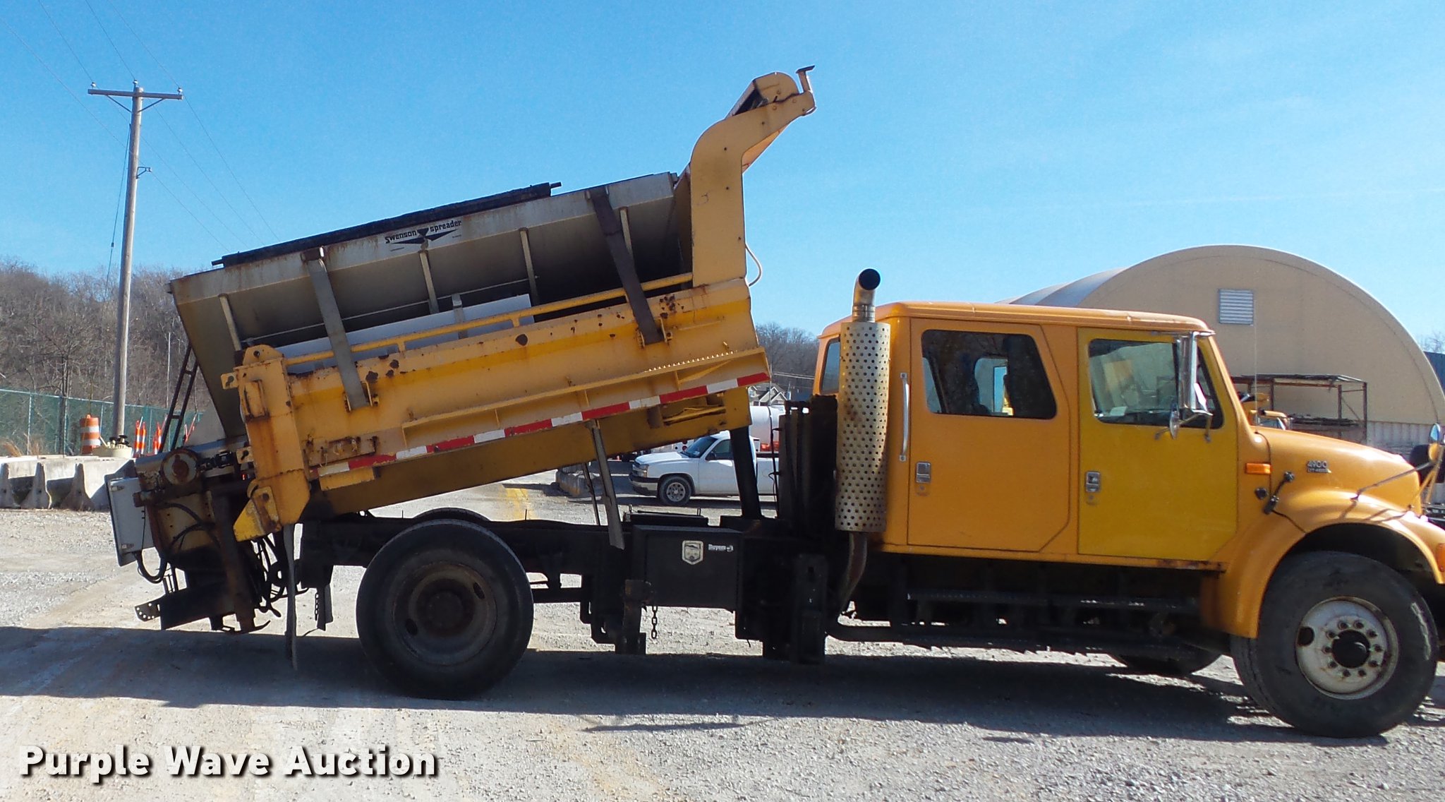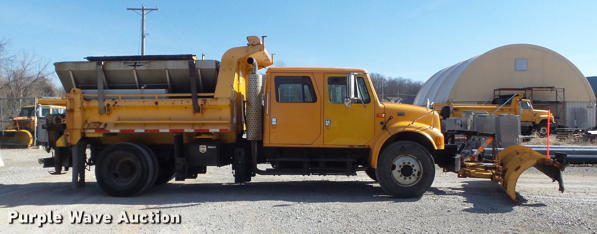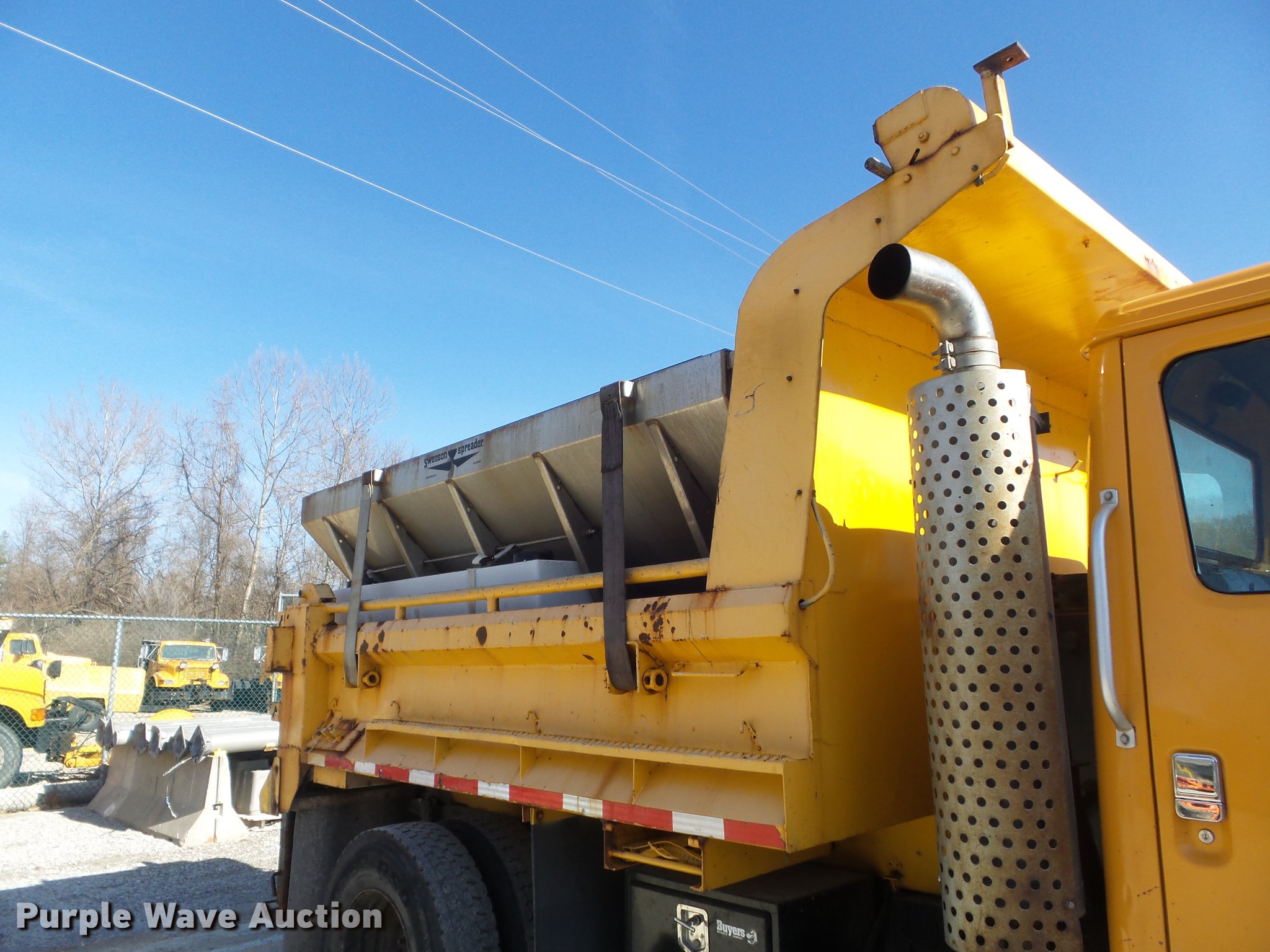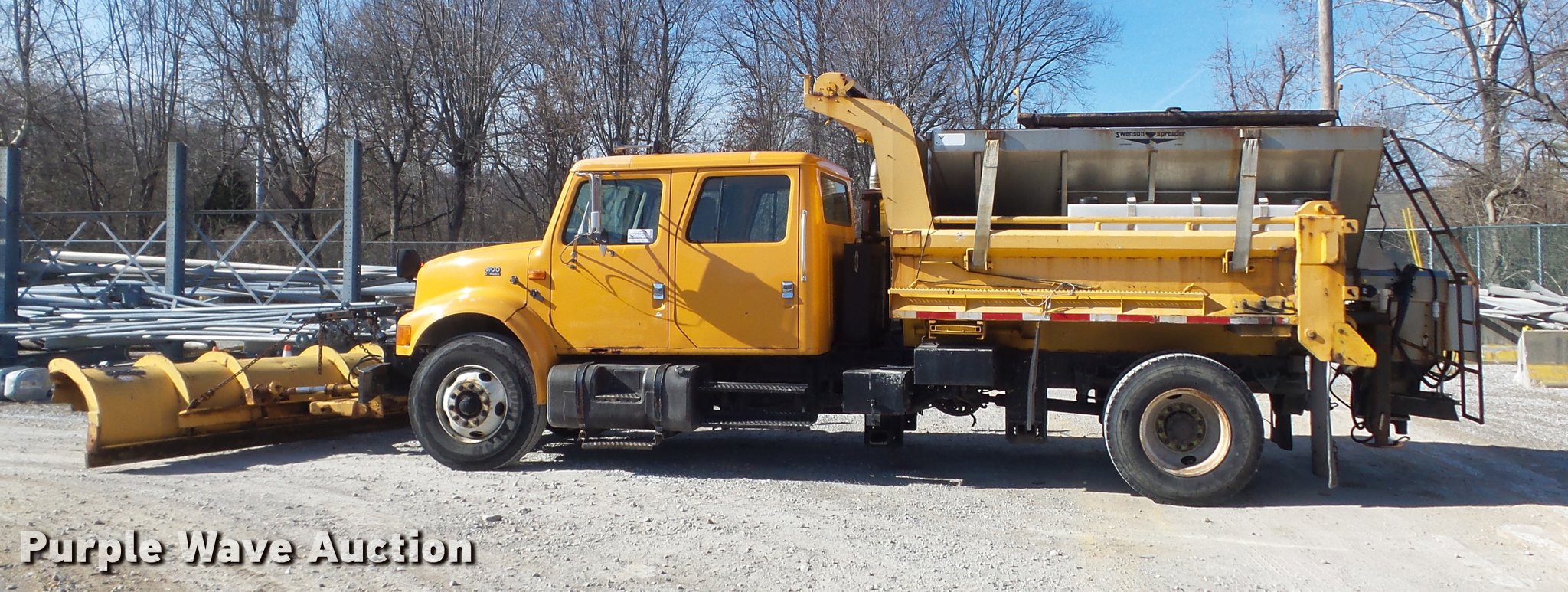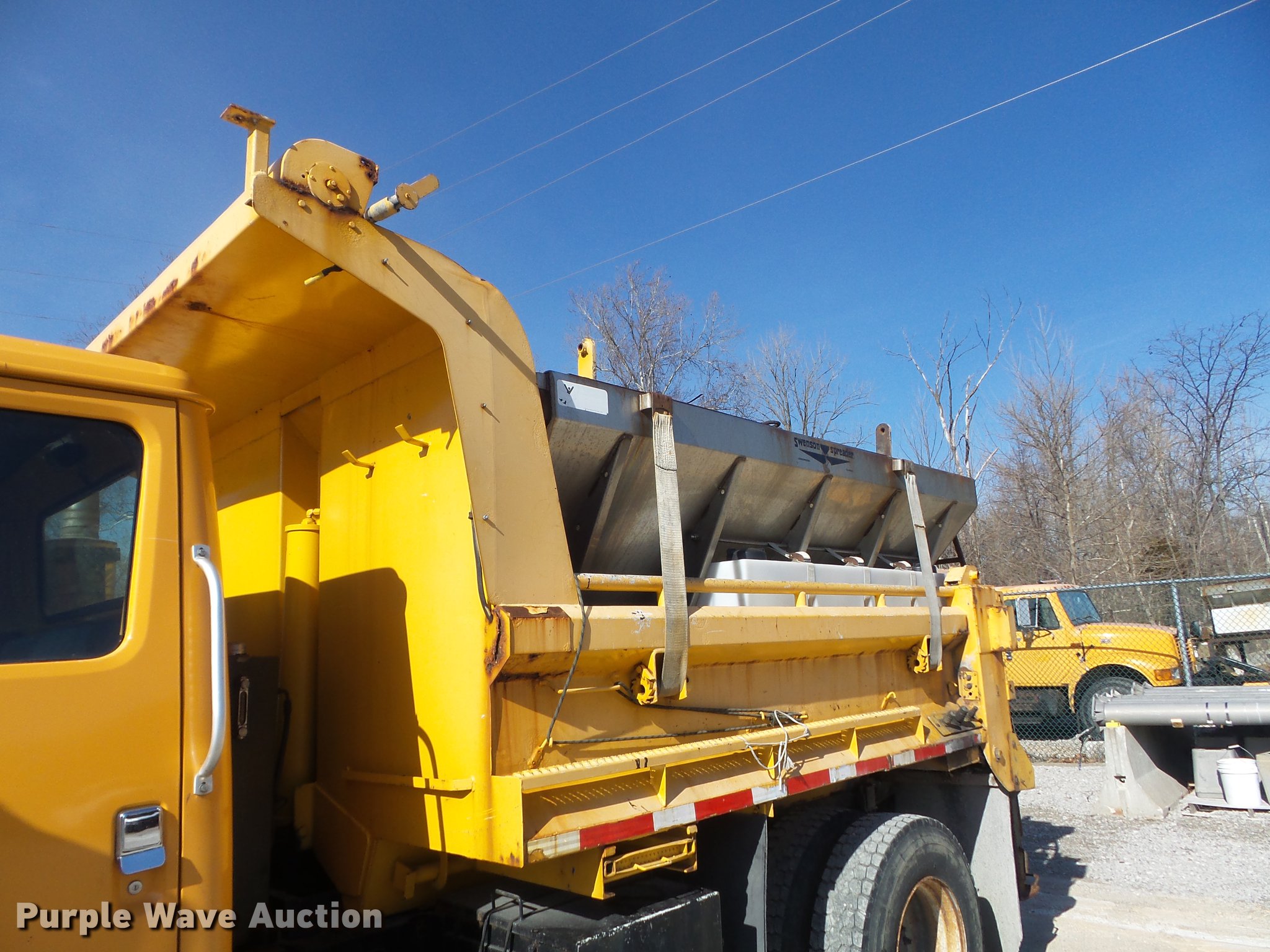 Purple Wave is selling a used Construction Dump Truck in Missouri. This item is a 2002 International 4900 dump truck with the following: 196,870 miles on odometer, 13,845 hours on meter, International DT466E 7.6L L6 turbo diesel engine, Allison automatic transmission, Single axle, AC and heat, Cruise, AM/FM/weatherband, Power windows, Power and heated mirrors, Air suspension seat, Brake controller, PTO, Toolboxes, Wheeler steel dump bed, 10'L x 96"W, 24" side height, Roll tarp, Bed vibrator, Single ram hoist, Air operated end gate, 12'W plow, Swenson spreader, Single fuel tank, Pintle hitch, Spring suspension, Air brakes, 206" wheelbase, 315/80R22.5 front tires, 11R22.5 rear tires, GVWR 37,000 lbs, FAWR 16,000 lbs, RAWR 21,000 lbs, MODOT ID 6670