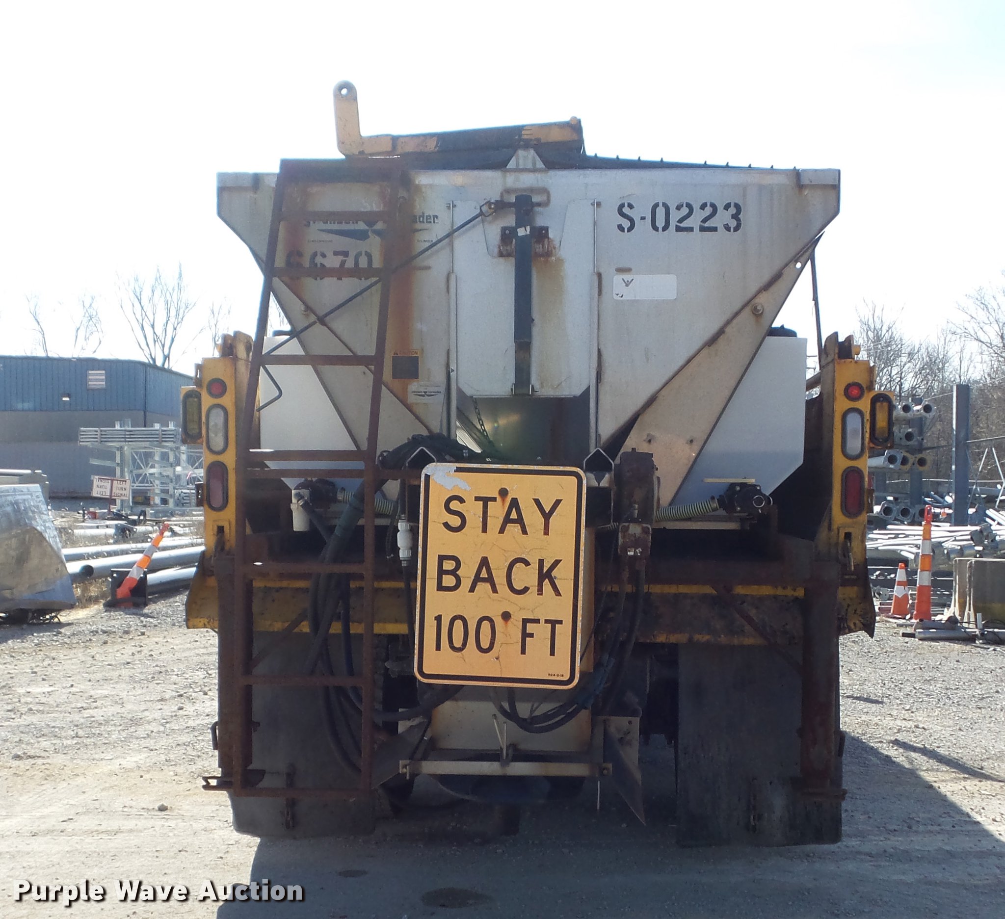 2002 International 4900 dump truck. 196,870 miles on odometer, 13,845 hours on meter, International DT466E 7.6L L6 turbo diesel engine, Allison automatic transmission, Single axle, AC and heat, Cruise, AM/FM/weatherband, Power windows, Power and heated mirrors, Air suspension seat, Brake controller, PTO, Toolboxes, Wheeler steel dump bed 10'L x 96"W, 24" side height, Roll tarp, Bed vibrator, Single ram hoist, Air operated end gate, 12'W plow, Swenson spreader, Single fuel tank, Pintle hitch, Spring suspension, Air brakes, 206" wheelbase, 315/80R22.5 front tires, 11R22.5 rear tires, GVWR 37,000 lbs, FAWR 16,000 lbs, RAWR 21,000 lbs, MODOT ID 6670. Missouri title. 1HTSDAAR22H526055. Missouri Department of Transportation (MODOT). 2309 Barrett Station Rd. Ballwin, MO 63021