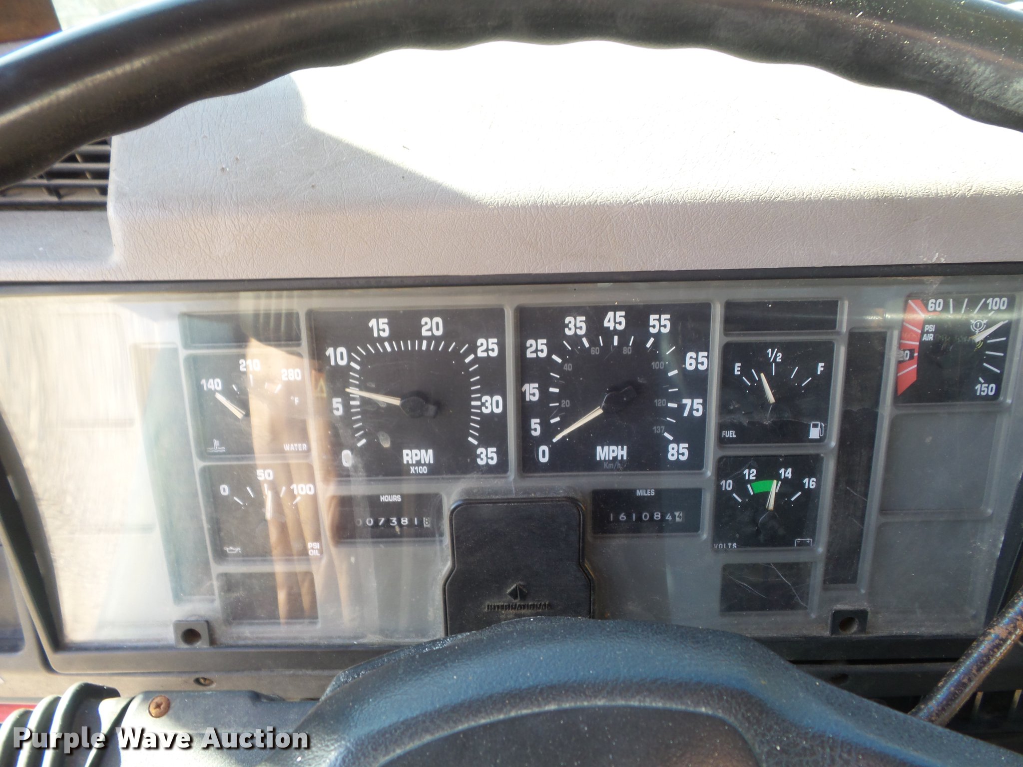 Purple Wave is selling a used Flat Bed Truck in Missouri. This item is a 2000 International 4900 flatbed truck with the following: 161,084 miles on odometer, 7,382 hours on meter, International DT466E 7.6L L6 turbo diesel engine, International Six Plus six speed manual transmission, Single axle, Heat, Cruise, AM/FM/weatherband, Heated mirrors, Air suspension seat, Backup alarm, Block heater, PTO, Knapheide steel flatbed, 11'L x 96"W, Toolbox, Rear air brake hookups, Serial 20070831-0085931, Pintle hitch, Insta-Chain automatic ice chains, Air suspension, Air brakes, 170" wheelbase, 11R22.5 tires, GVWR 34,220 lbs, MODOT ID 6229