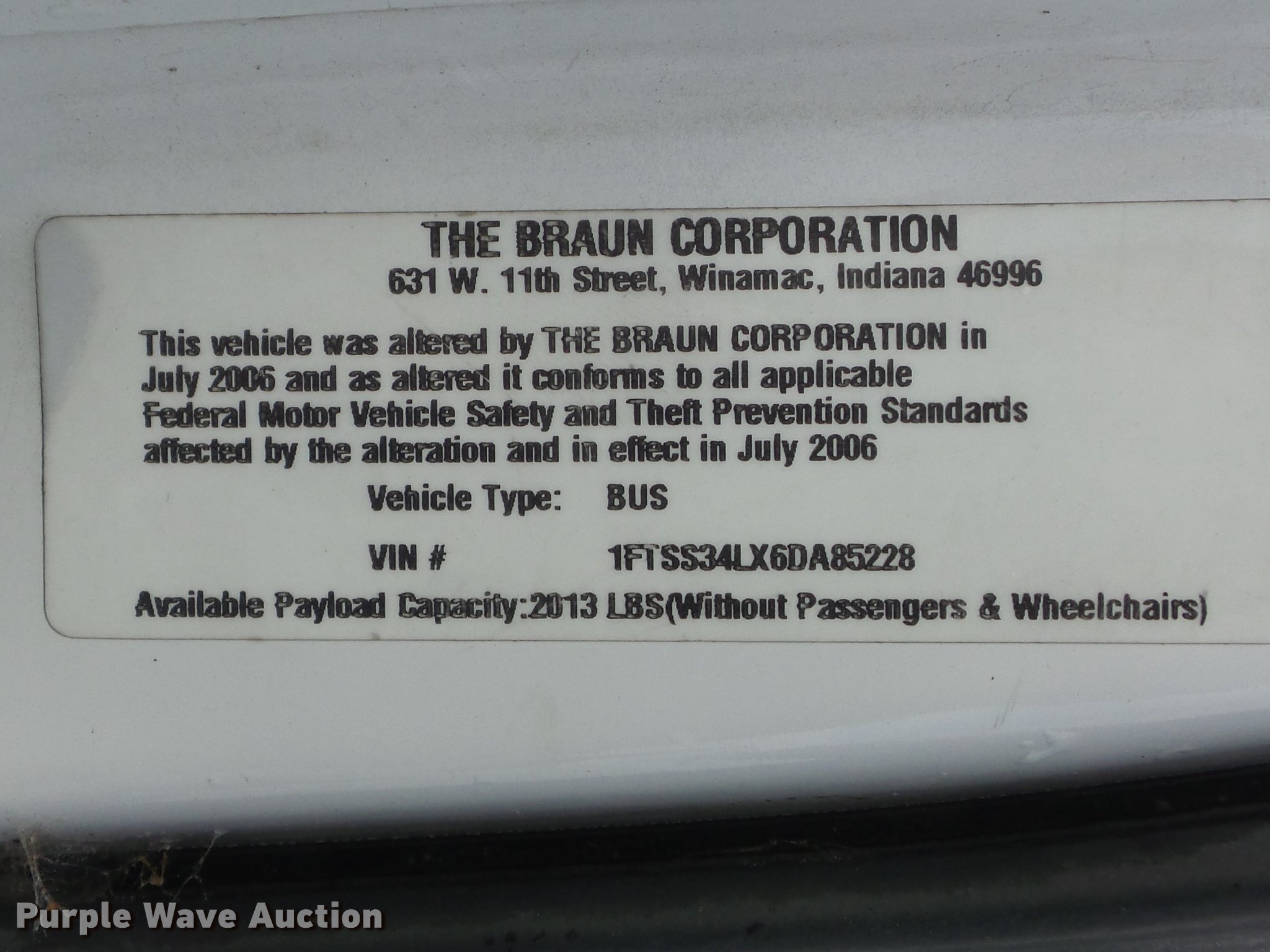 2006 Ford E350 Super Duty van. 93,872 miles on odometer, 5.4L V8 SOHC 16V gas engine, Automatic transmission, AC and heat, Cruise, AM/FM, Power windows and locks, Rear AC, 9 passenger capacity, Child safety seat, Braun ACL9171B wheelchair lift Serial 0501098, Wheelchair tie down area, Carrier AC roof unit, Spring suspension, Hydraulic brakes, LT245/75R16 tires, GVWR 9,400 lbs, Dead battery, Non-operational backup camera, Front passenger door inoperable Possible bad toggle switch, Wheelchair lift intermittently works Possible bad safety switch. Missouri title. 1FTSS34LX6DA85228. Pike County Senate Bill 40. 900 Independence Dr. Bowling Green, MO 63334