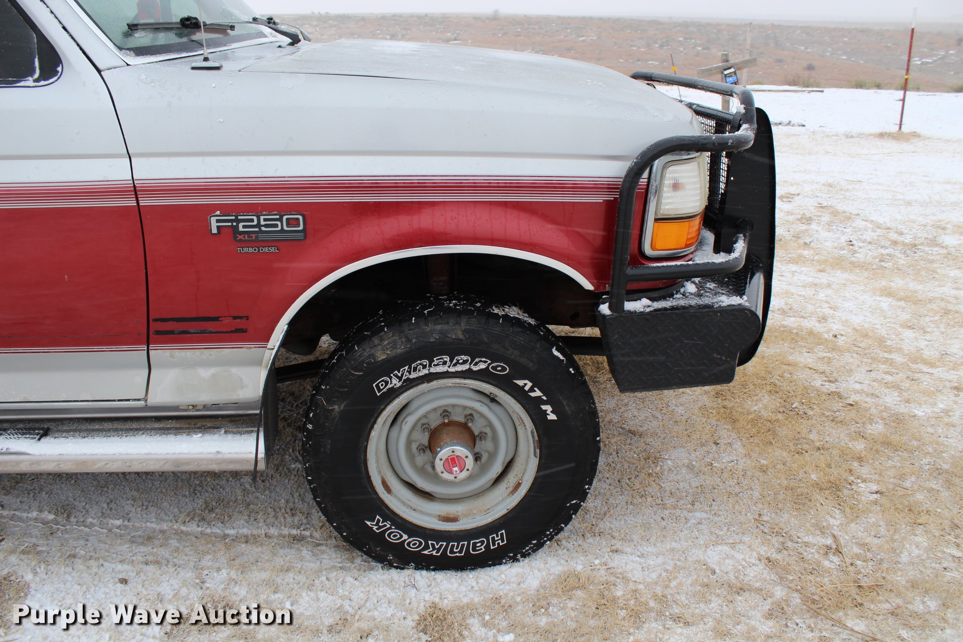 Purple Wave is selling a used 3/4 or 1 Ton Pickup or Van in Kansas. This item is a 1993 Ford F250 SuperCab pickup truck with the following: 212,972 miles on odometer, 7.3L V8 OHV 16V turbo diesel engine, Five speed manual transmission, Four wheel drive, AC and heat, Tilt, Cruise, AM/FM/CD, Power windows, locks, and seats, Cloth interior, Running boards, GR grill guard, Front receiver hitch, Long bed, Gooseneck ball, Dual fuel tanks, Trailer wiring, 235/55R16 tires, Idler pulley makes noise, Chipped windshield