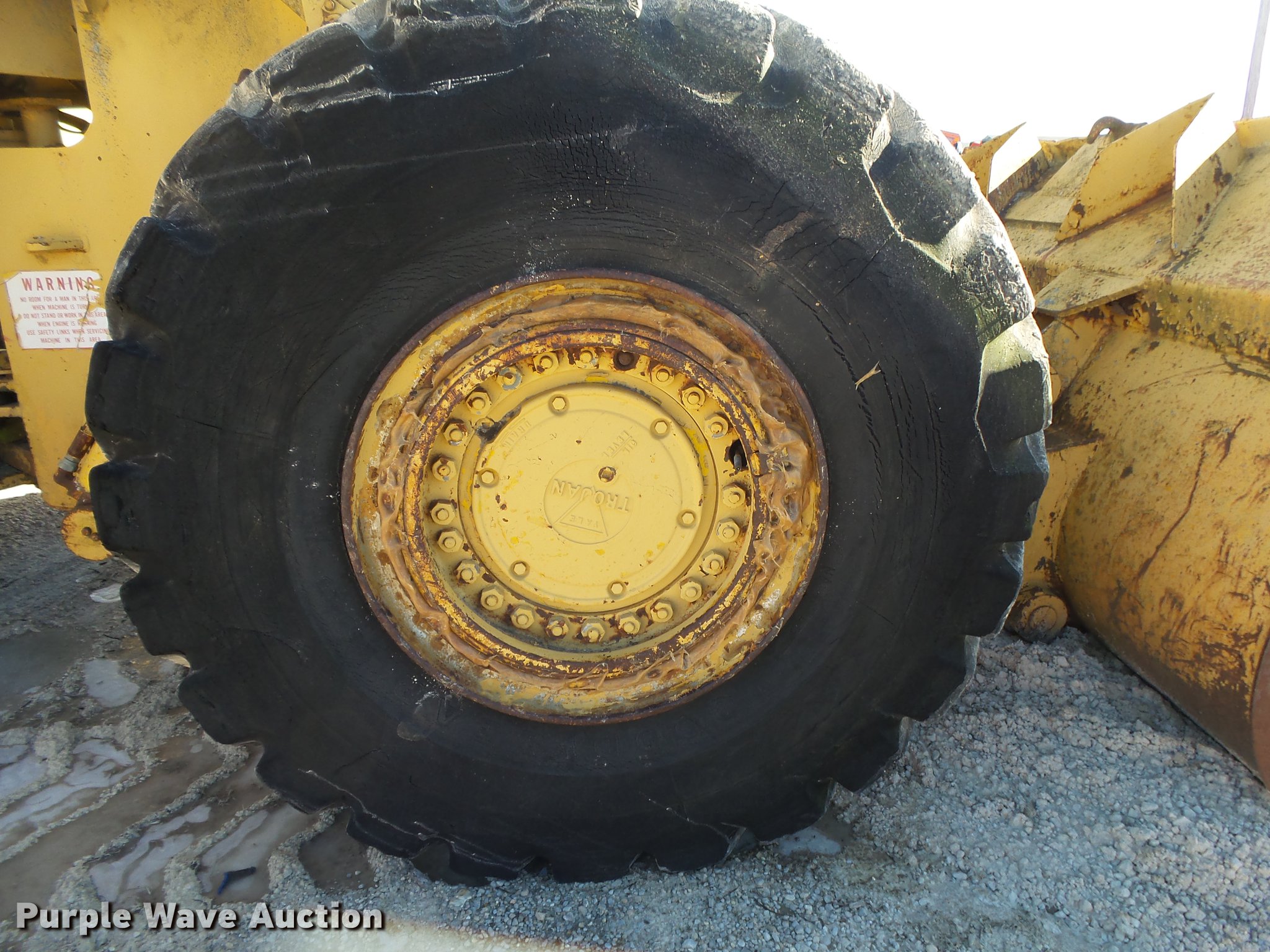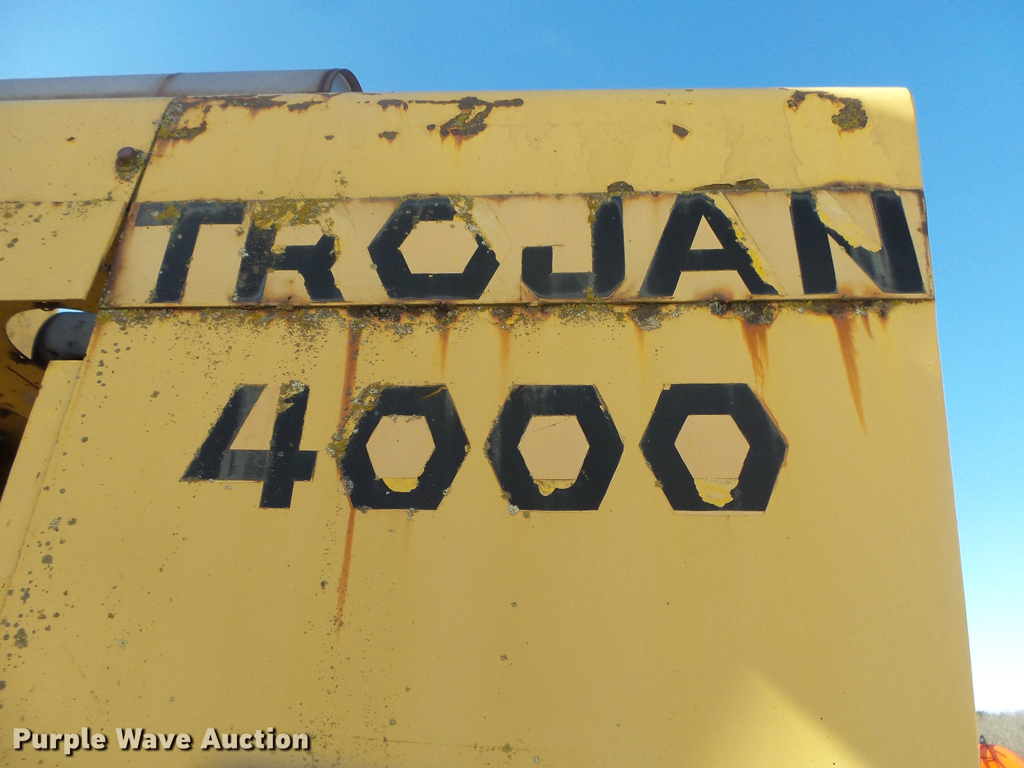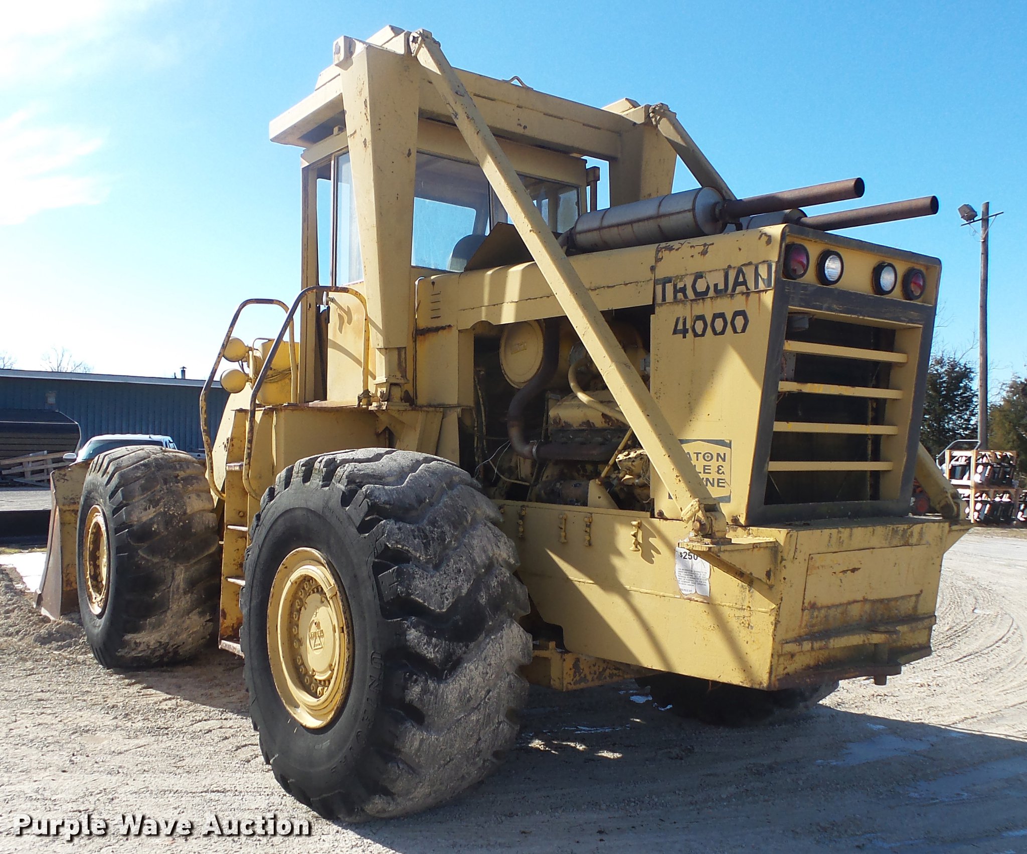 Purple Wave is selling a used Wheel Loader in Missouri. This item is a Trojan 4000 wheel loader with the following: 1,517 hours on meter, Detroit Diesel eight cylinder diesel engine, Shuttle shift transmission, 3F-3R gears, Enclosed cab, Suspension seat, Two-lever bucket controls, Front work lights, 125"W general purpose bucket, Weld-on cutting edge, (7) teeth, Self-leveling, Manual quick coupler, 26.5-25 tires, Battery dead, Transmission issues, Unit will not go into forward gears