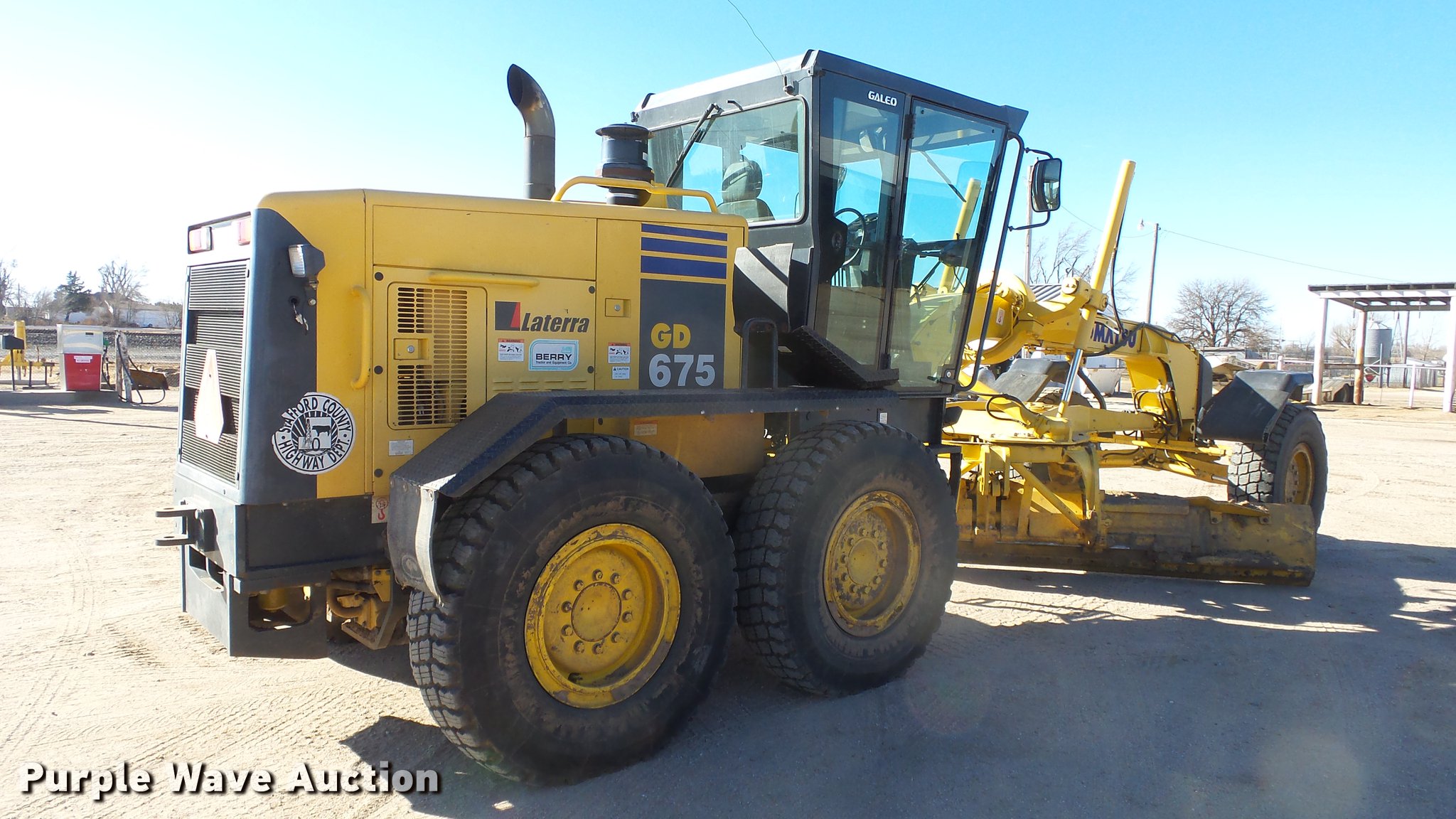 Purple Wave is selling a used Motor Grader in Kansas. This item is a 2004 Komatsu GD675 motor grader with the following: 7,902 hours on meter, Komatsu SAA6D107E-1 six cylinder turbo diesel engine, 207 HP, Serial 46039526, Powershift transmission, 8F-4R gears, EROPS, AC and heat, AM/FM, Suspension seat, Front and rear work lights, 16'W moldboard, Tip control, Side shift, 14.00R24 tires, Serial 50007