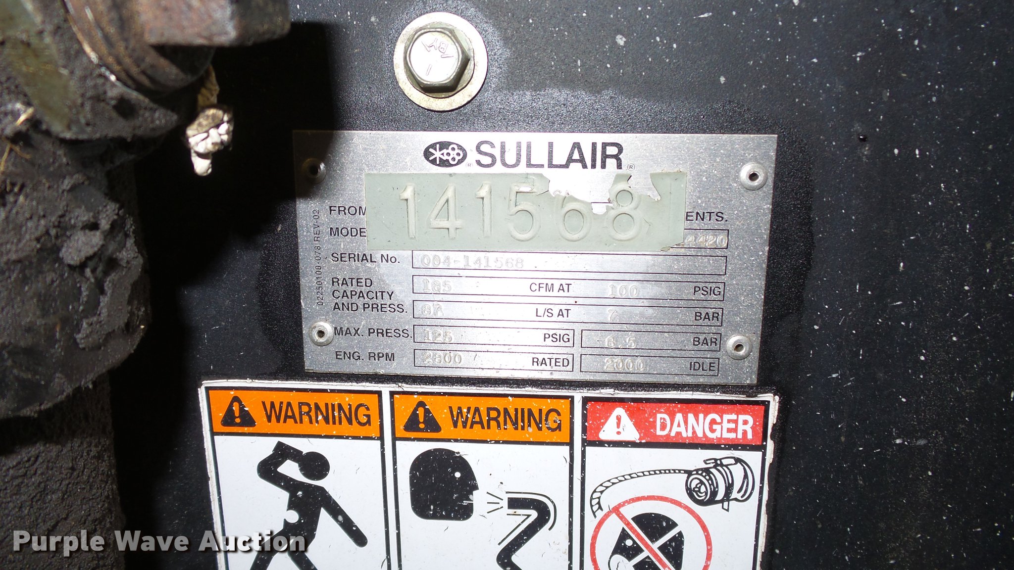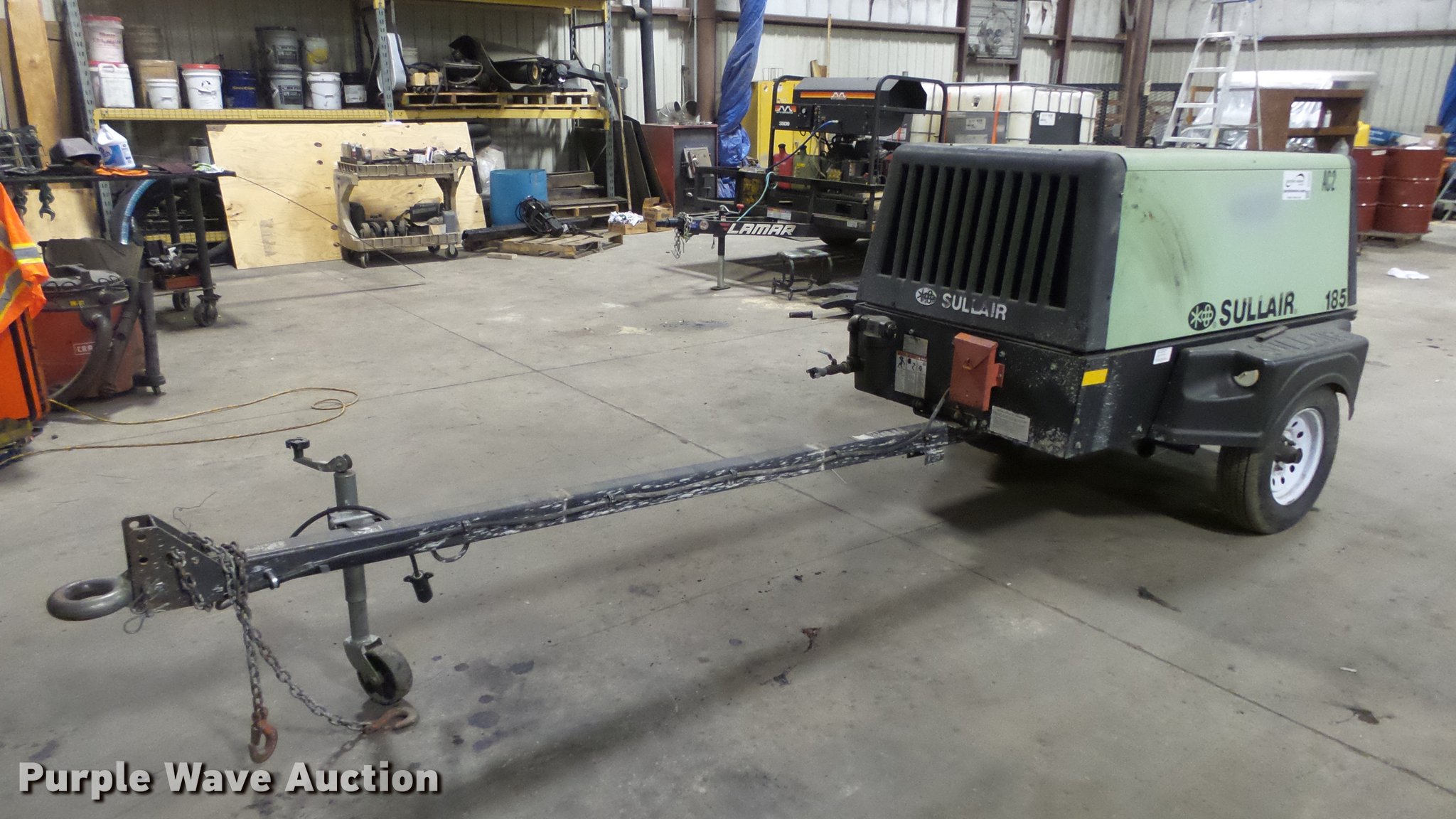 Sullair 185 air compressor. 1,291 hours on meter, Four cylinder diesel engine, 185 CFM, Pintle hitch, 175/80R13 tires. This is worksite support equipment and will not come with a title. Transfer of ownership documentation will be a bill of sale. 004-141568. Circle C Paving. 630 E Industrial St. Goddard, KS 67052