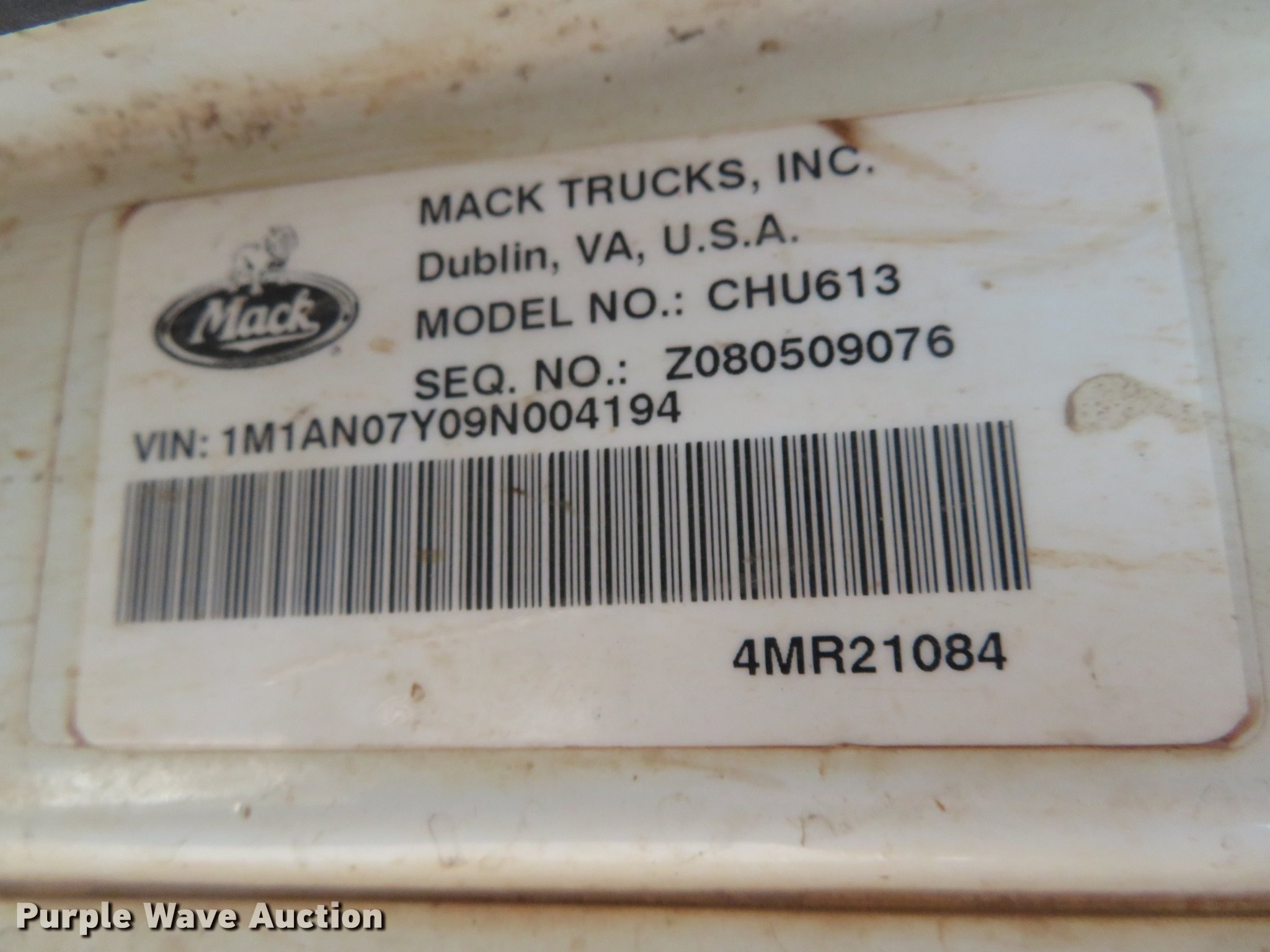 Purple Wave is selling a used Truck Tractor in Kansas. This item is a 2009 Mack CHU613 semi truck with the following: 362,974 miles on odometer, Mack MP8 12.7L L6 diesel engine, Eight speed manual transmission, Tandem axle, Heat, AM/FM, Power windows and locks, Air suspension seat, PTO, NVE vacuum pump, Exterior visor, Single rear exhaust stack, Air suspension, Air brakes, 11R24.5 tires, Unit# 46