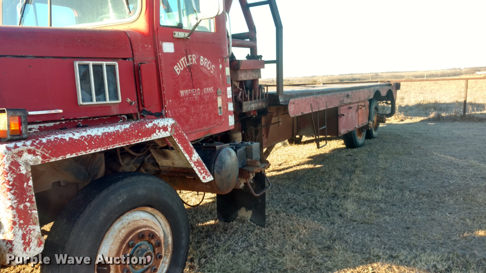 Purple Wave is selling a used Flat Bed Truck in Kansas. This item is a 1978 International Paystar 5000 oilfield rig up truck with the following: 279,693 miles on odometer, 40,723 hours on meter, Diesel engine, Manual transmission, Tandem axle, Heat, Suspension seat, PTO, 22'8"L x 96"W steel oilfield flatbed, (2) winches, Rolling tailboard, Spring suspension, 11R24.5 tires, Parts may be missing, Non-operational unit, parts only