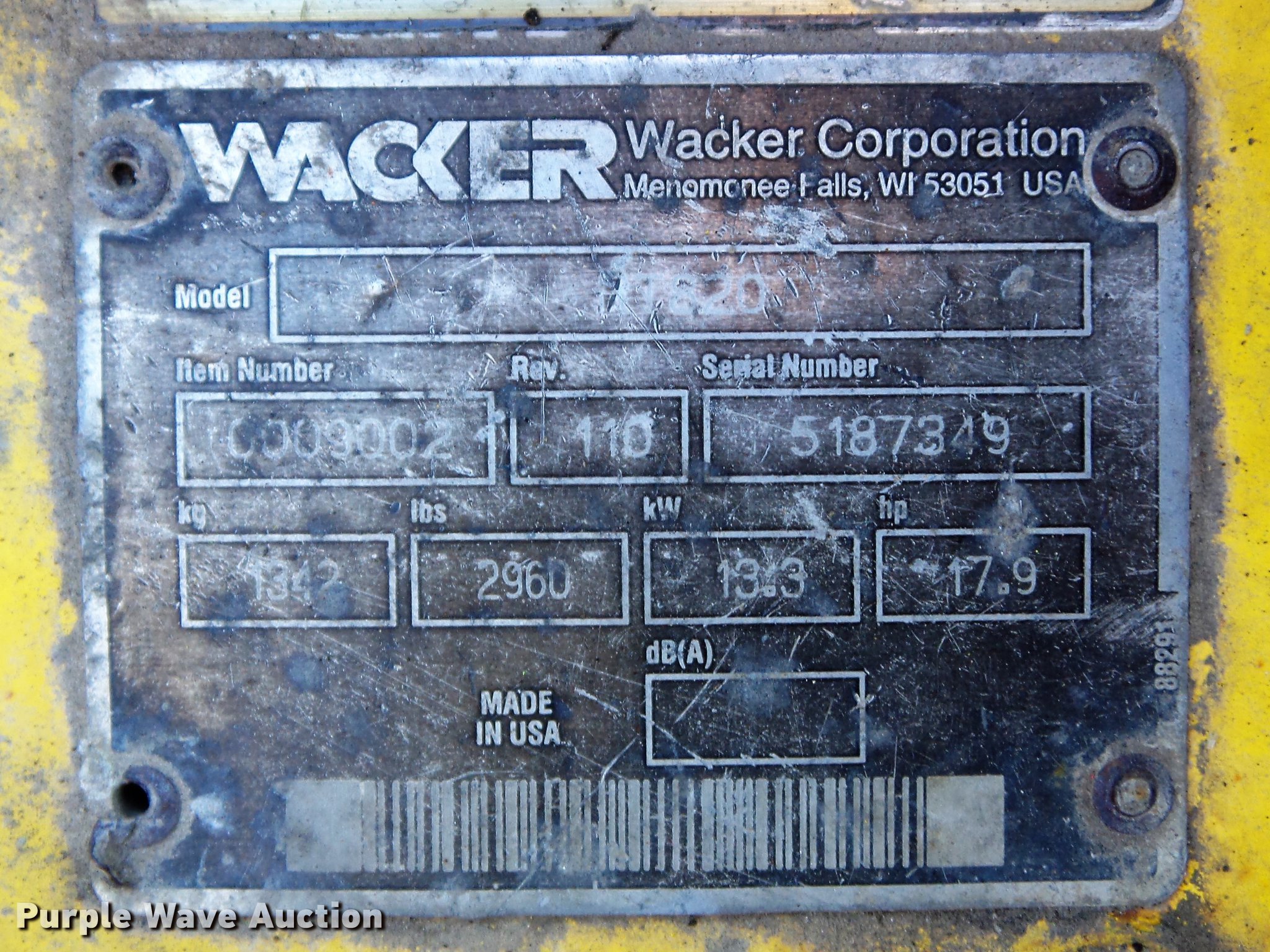 Purple Wave is selling a used Walk Behind Compactor in Missouri. This item is a Wacker RT820 trench compactor with the following: 975 hours on meter, Lombardini two cylinder diesel engine, Hydrostatic transmission, 32"W padfoot drums, Front and rear drum scrapers, Remote, Serial 5187349