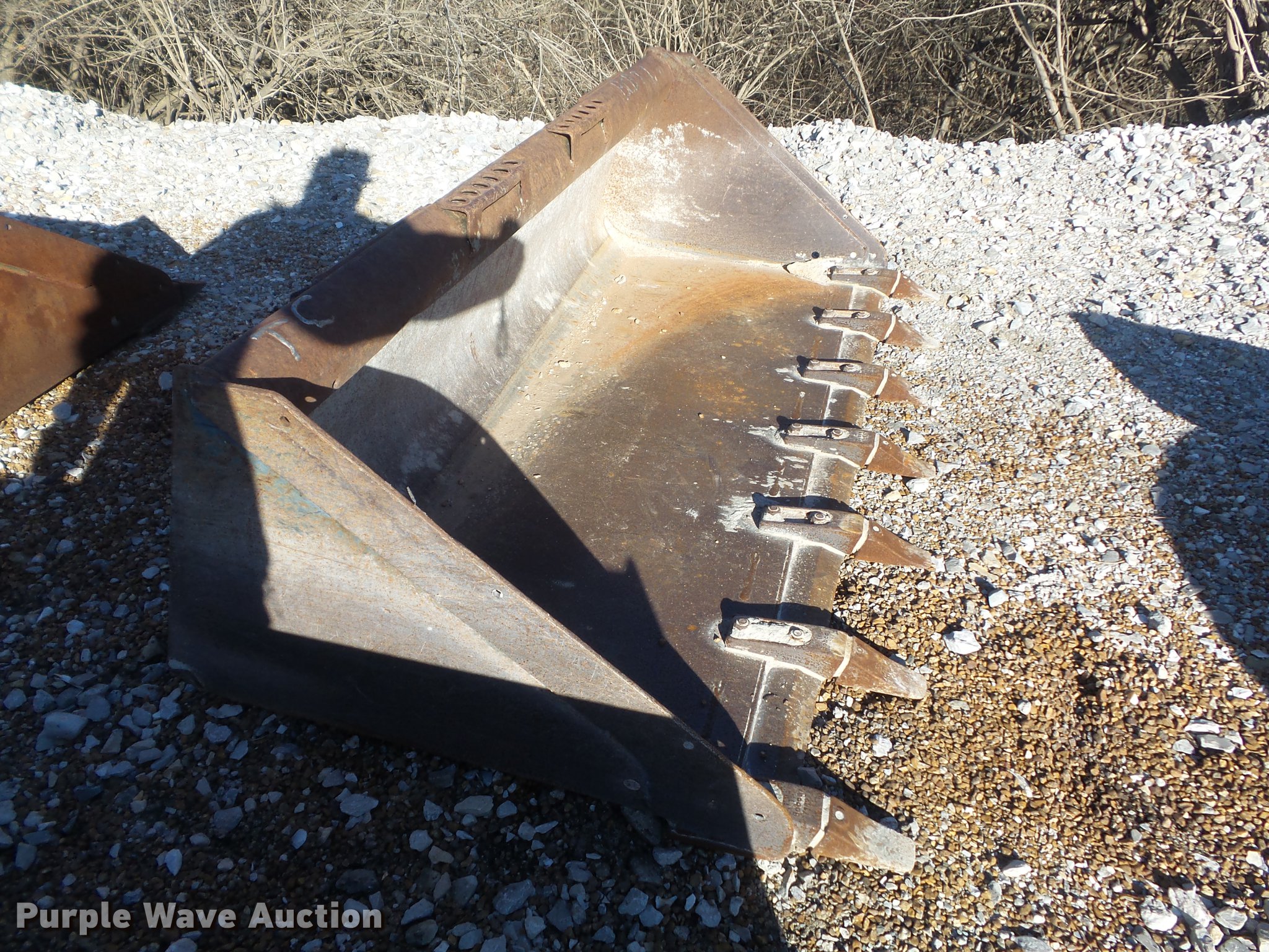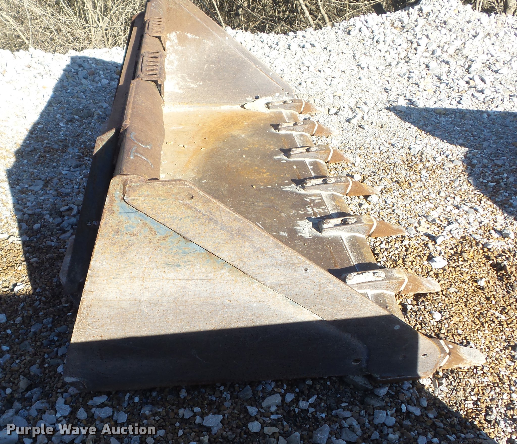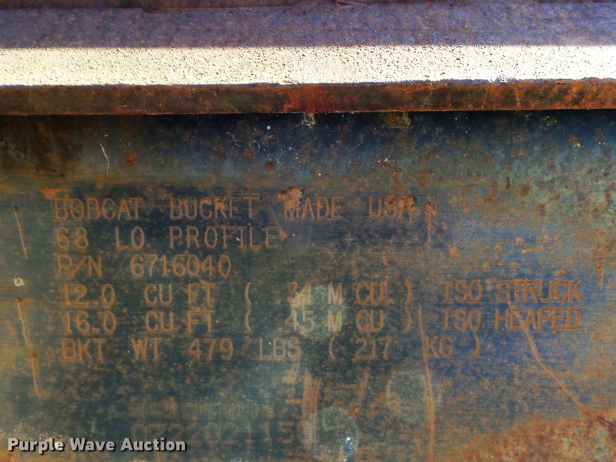 Purple Wave is selling a used Skid Steer Attach. in Missouri. This item is a Bobcat 68 Lo Profile skid steer bucket with the following: 68"W, (7) pin-on teeth, 16 cu.ft. heaped capacity, 12 cu.ft. struck capacity, Part No. 6716040