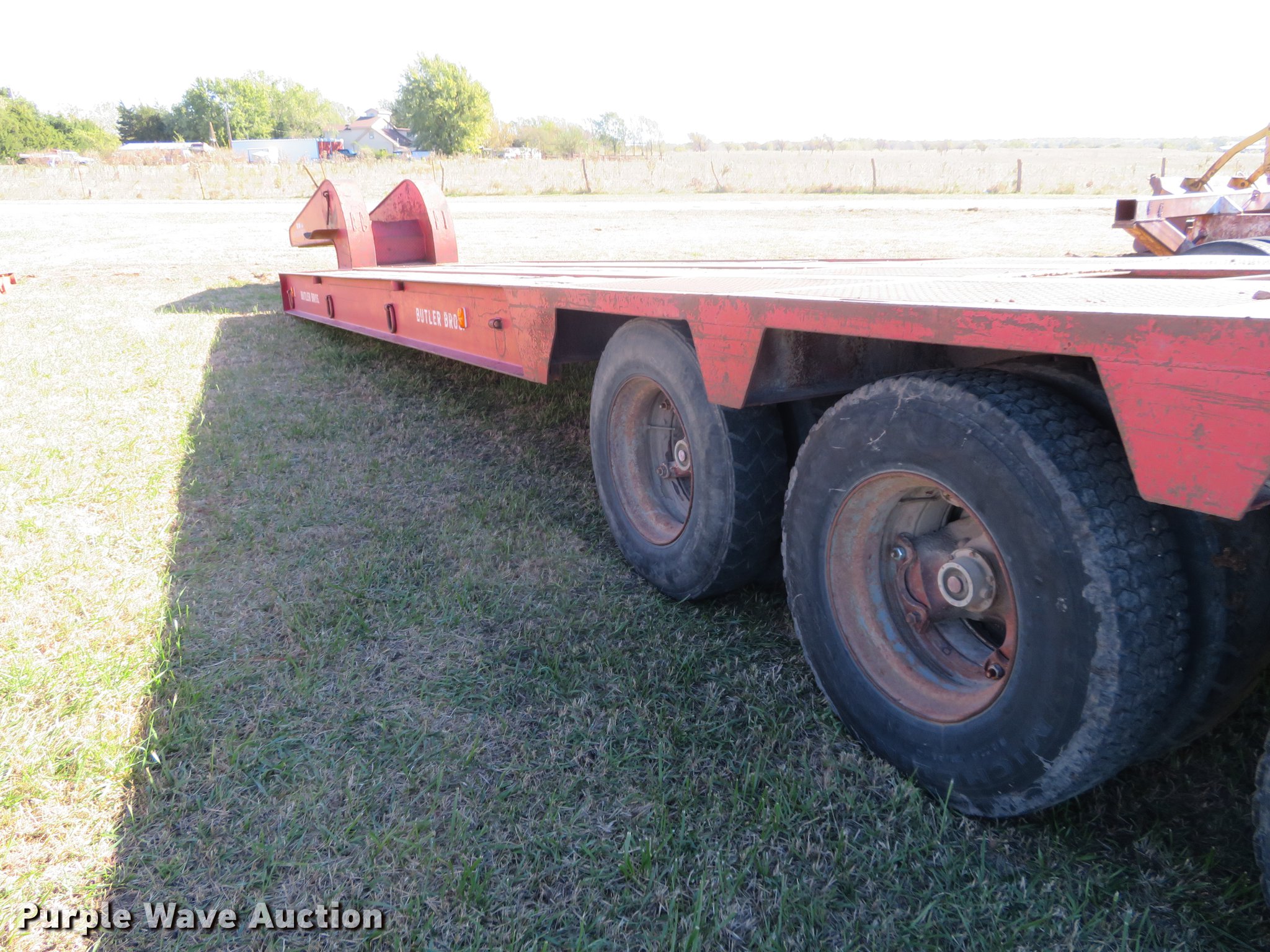 1985 Shop Built equipment trailer. 34'L x 102"W, Wood deck, Rolling tailboard, Spring suspension, Air brakes, Triple axle, 11R22.5 tires, Unit# 35T. Kansas title. KS101734. Butler Brothers, Inc.. Winfield, KS 67156