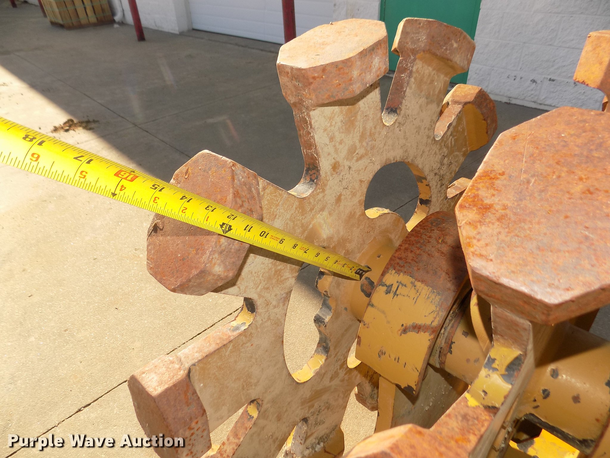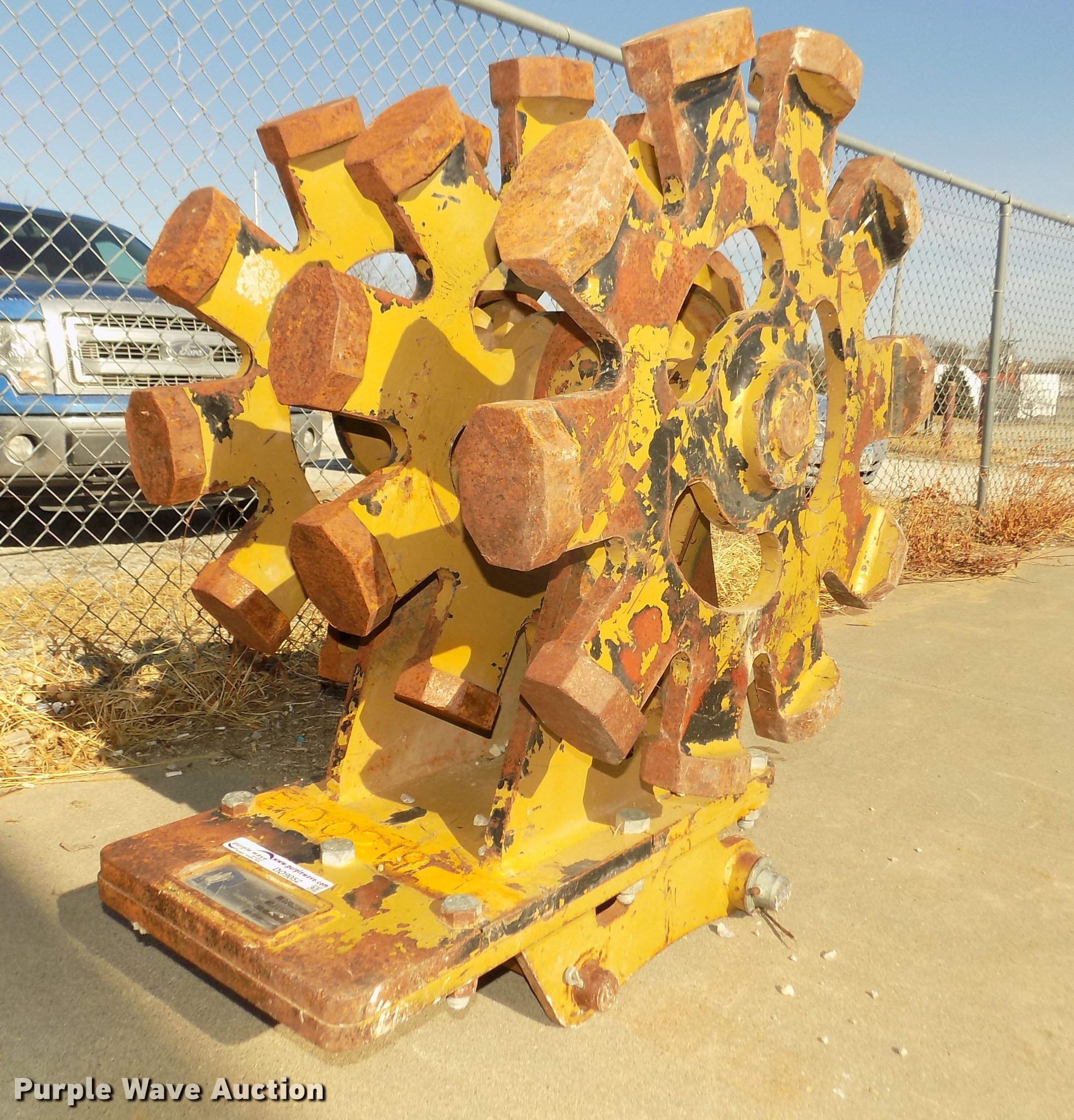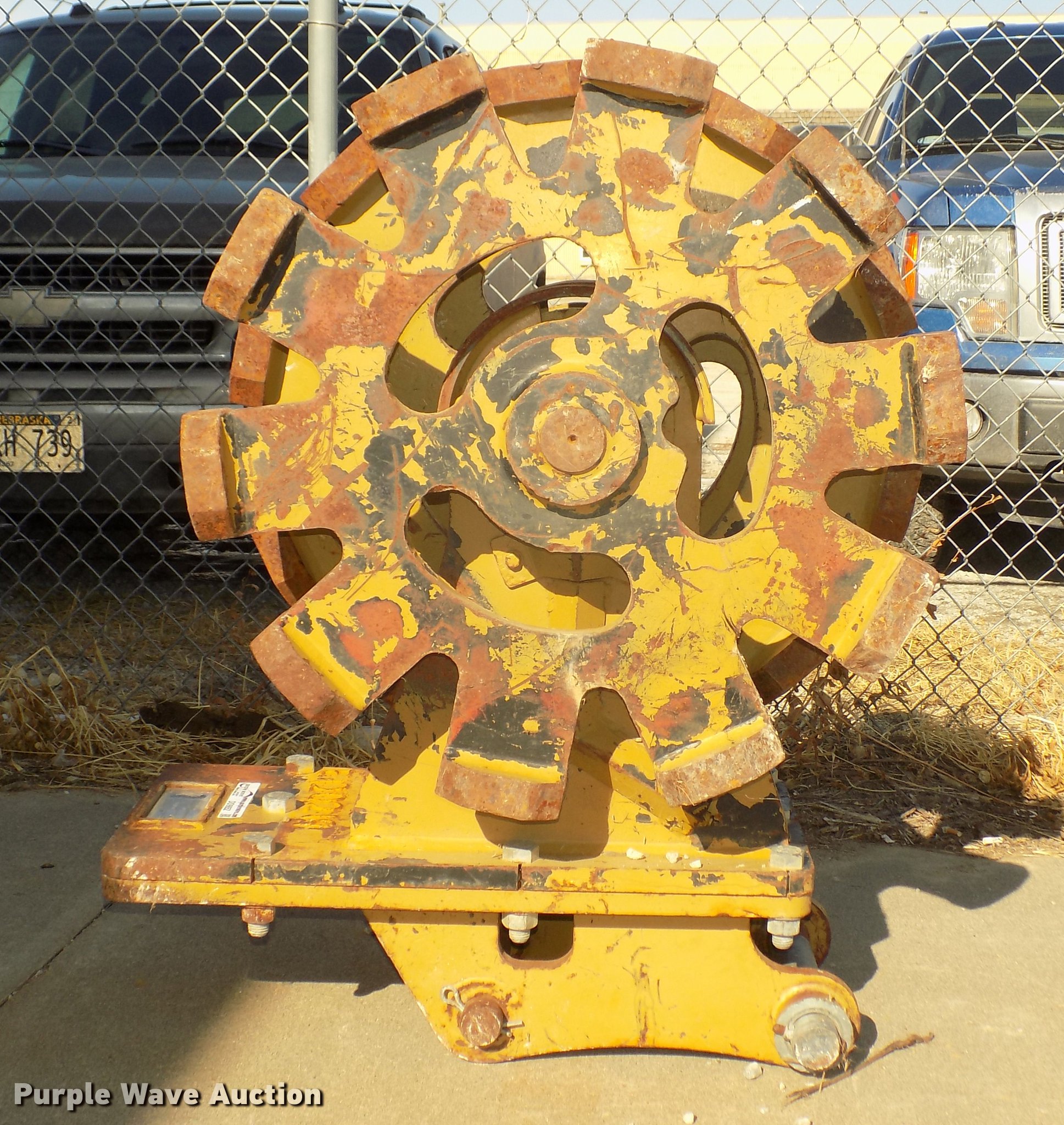 Purple Wave is selling a used Compaction Wheel in Nebraska. This item is a Rockland WB24-3 excavator compaction wheel with the following: (3) 29" diameter rims, 13 3/4" O.C. distance between pins, 10 1/4" I.D. ear width, Approximately 1 3/4" and 2" pins, 12"L feet, 4 7/8"L x 3 3/4"W x 1.5"H pads, Attachment plate for Caterpillar 420D backhoe quick attach, Serial 7262601, Unit# E120219
