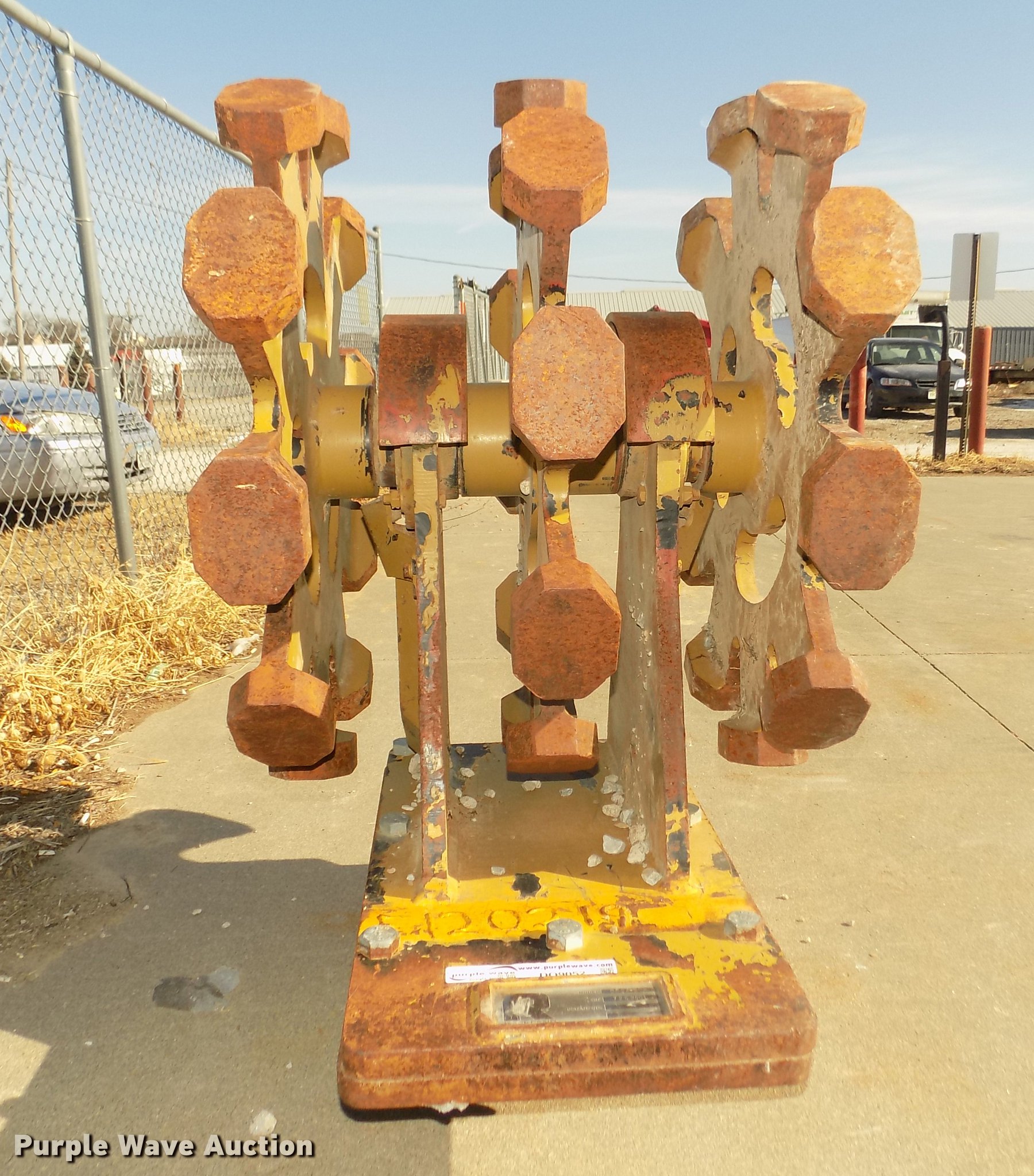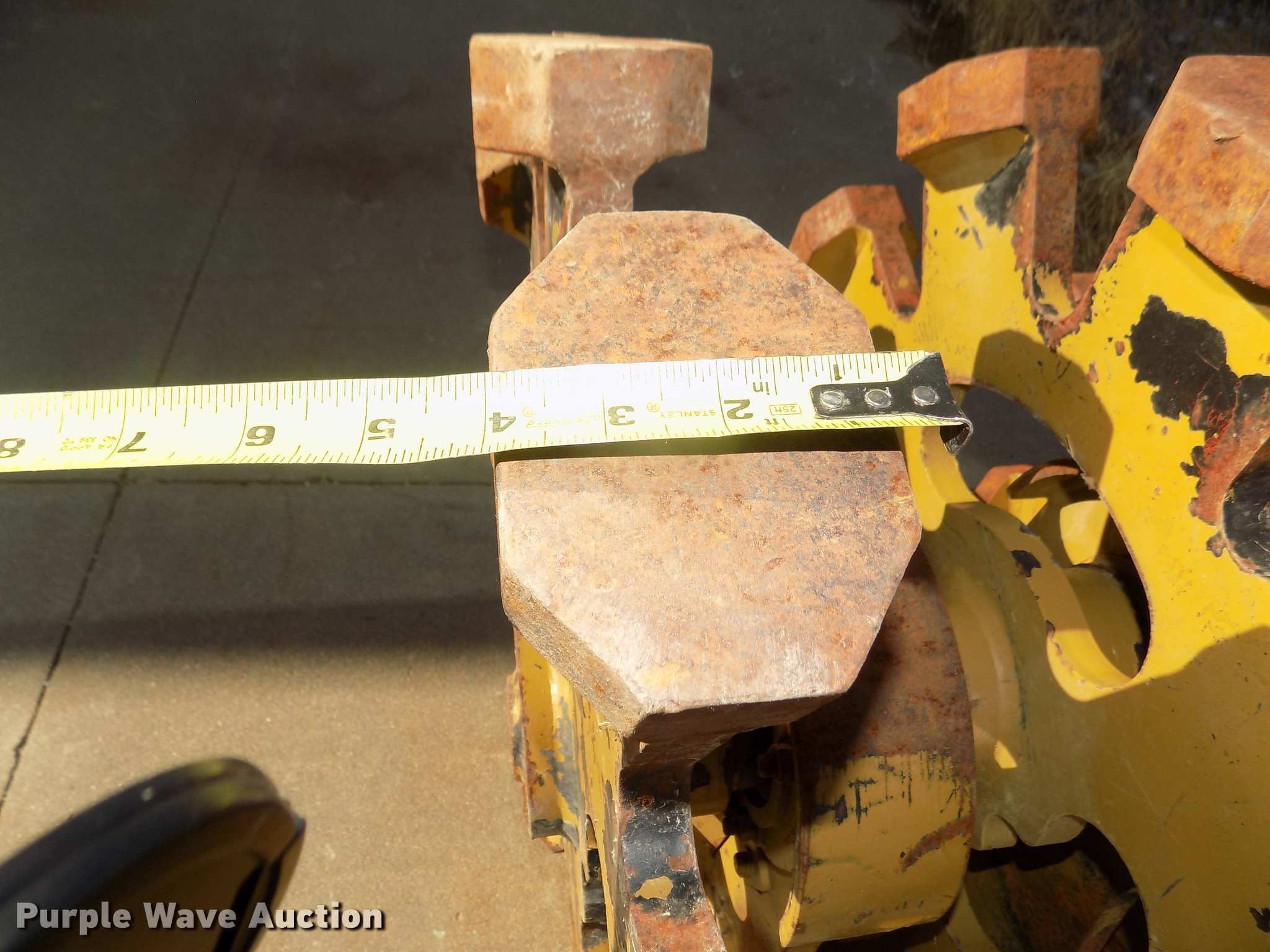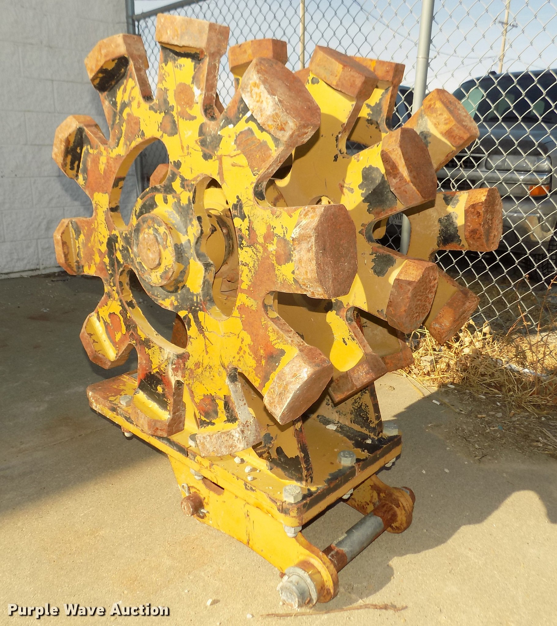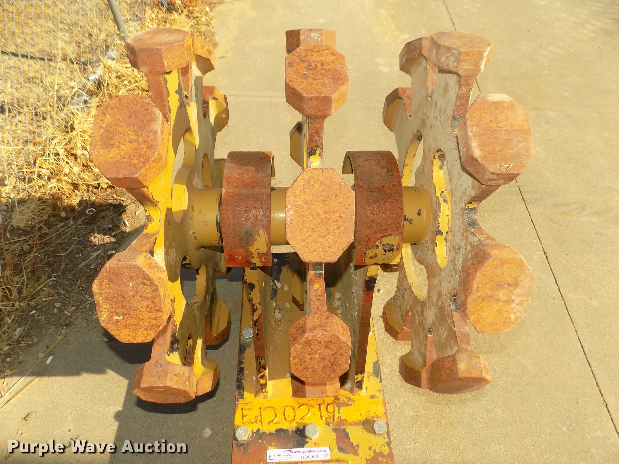 Purple Wave is selling a used Compaction Wheel in Nebraska. This item is a Rockland WB24-3 excavator compaction wheel with the following: (3) 29" diameter rims, 13 3/4" O.C. distance between pins, 10 1/4" I.D. ear width, Approximately 1 3/4" and 2" pins, 12"L feet, 4 7/8"L x 3 3/4"W x 1.5"H pads, Attachment plate for Caterpillar 420D backhoe quick attach, Serial 7262601, Unit# E120219