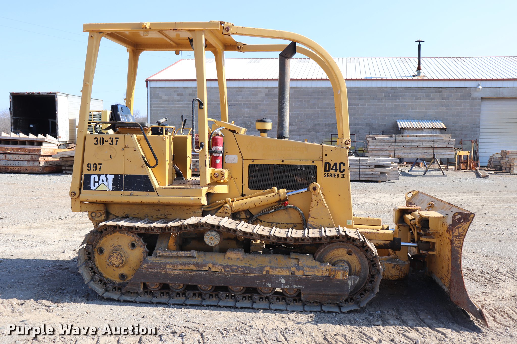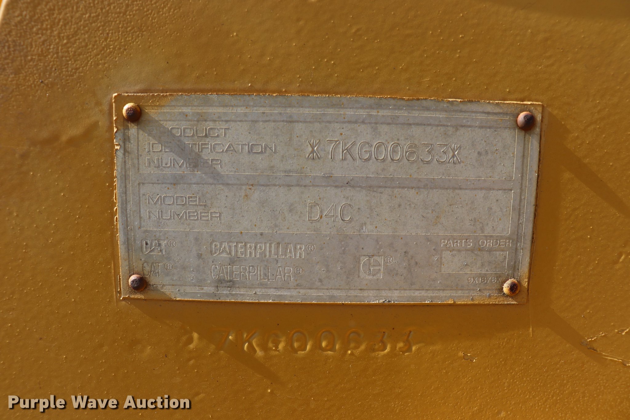 Purple Wave is selling a used Crawler Dozer in Oklahoma. This item is a 1992 Caterpillar D4C Series II dozer with the following: 980 hours on meter, Four cylinder diesel engine, Direct-drive transmission, 3F-3R gears, Canopy, Suspension seat, Clutch brake steering, 96" six-way dozer blade, Pin hitch, Six bottom rollers, 16"W single grouser track pads, Unknown operating condition, Tracks worn, Possible linkage issue with third gear, Serial 7KG00633, Unit# 30-37