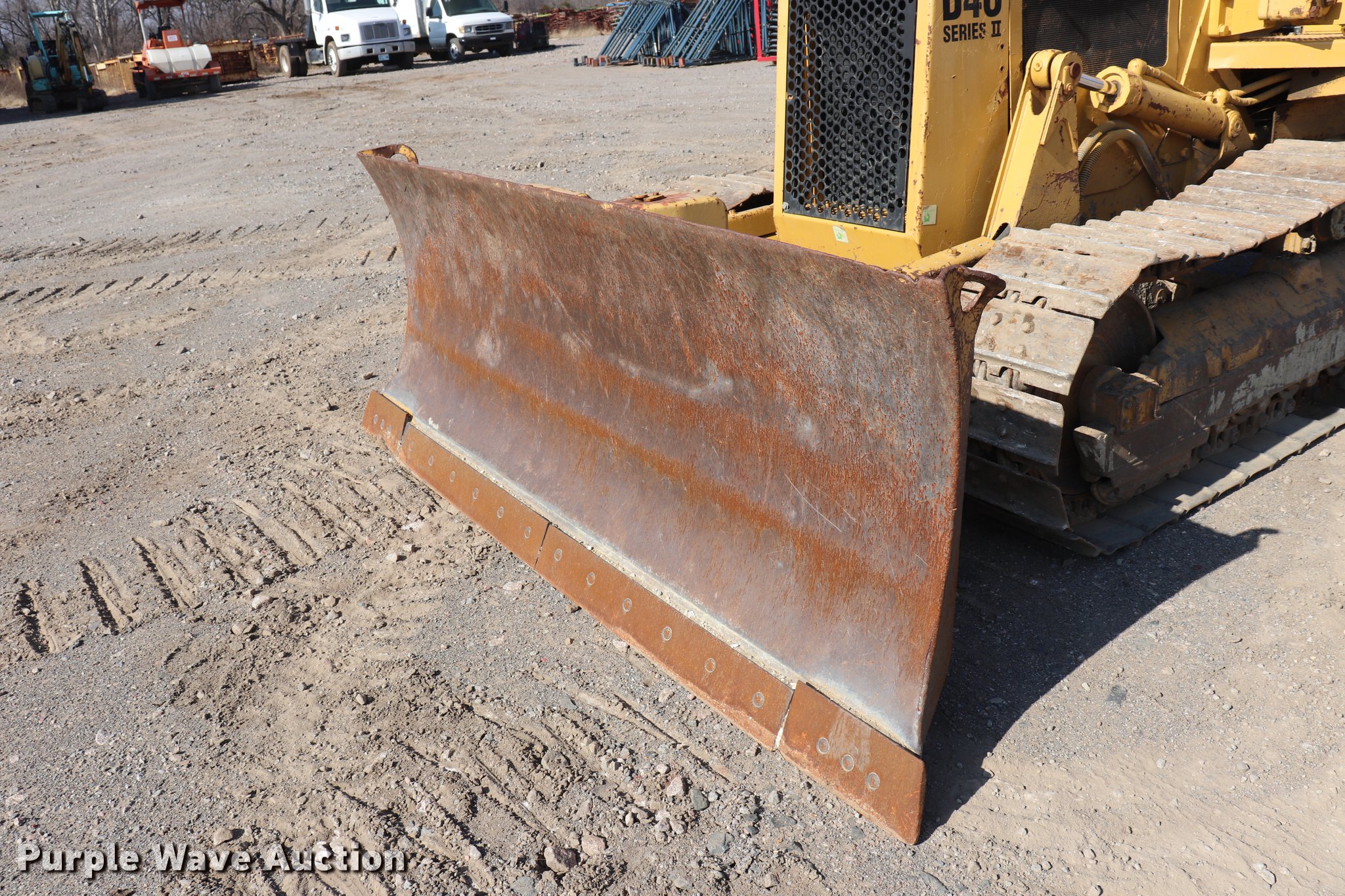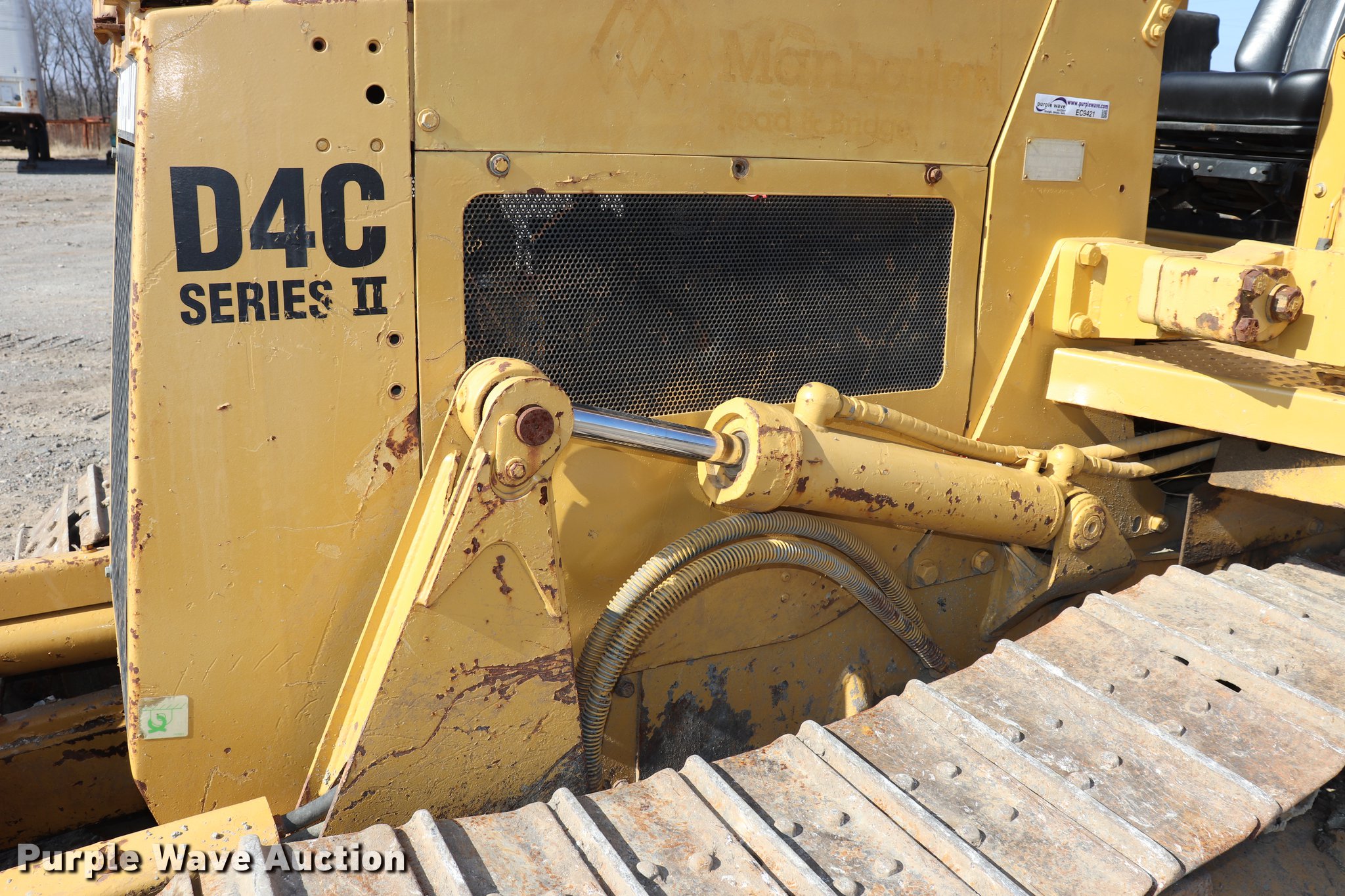 1992 Caterpillar D4C Series II dozer. 980 hours on meter, Four cylinder diesel engine, Direct-drive transmission 3F-3R gears, Canopy, Suspension seat, Clutch brake steering, 96" six-way dozer blade, Pin hitch, Six bottom rollers, 16"W single grouser track pads, Unknown operating condition, Tracks worn, Possible linkage issue with third gear, Serial 7KG00633, Unit# 30-37. Manhattan Road & Bridge. 5429 E Hancock St. Muskogee, OK 74403