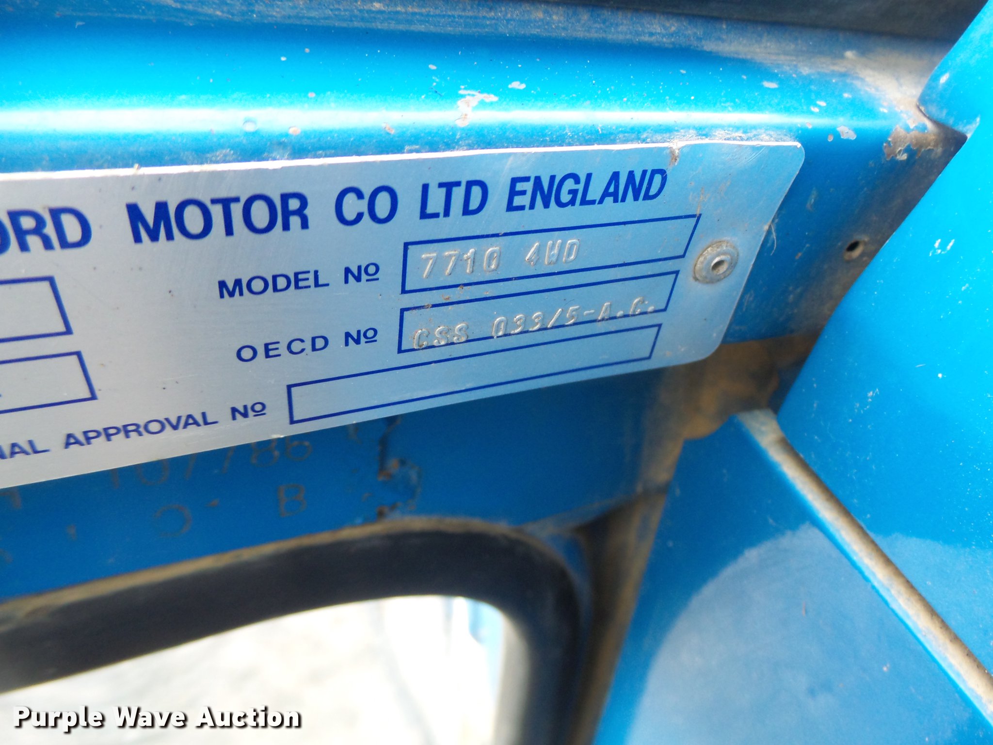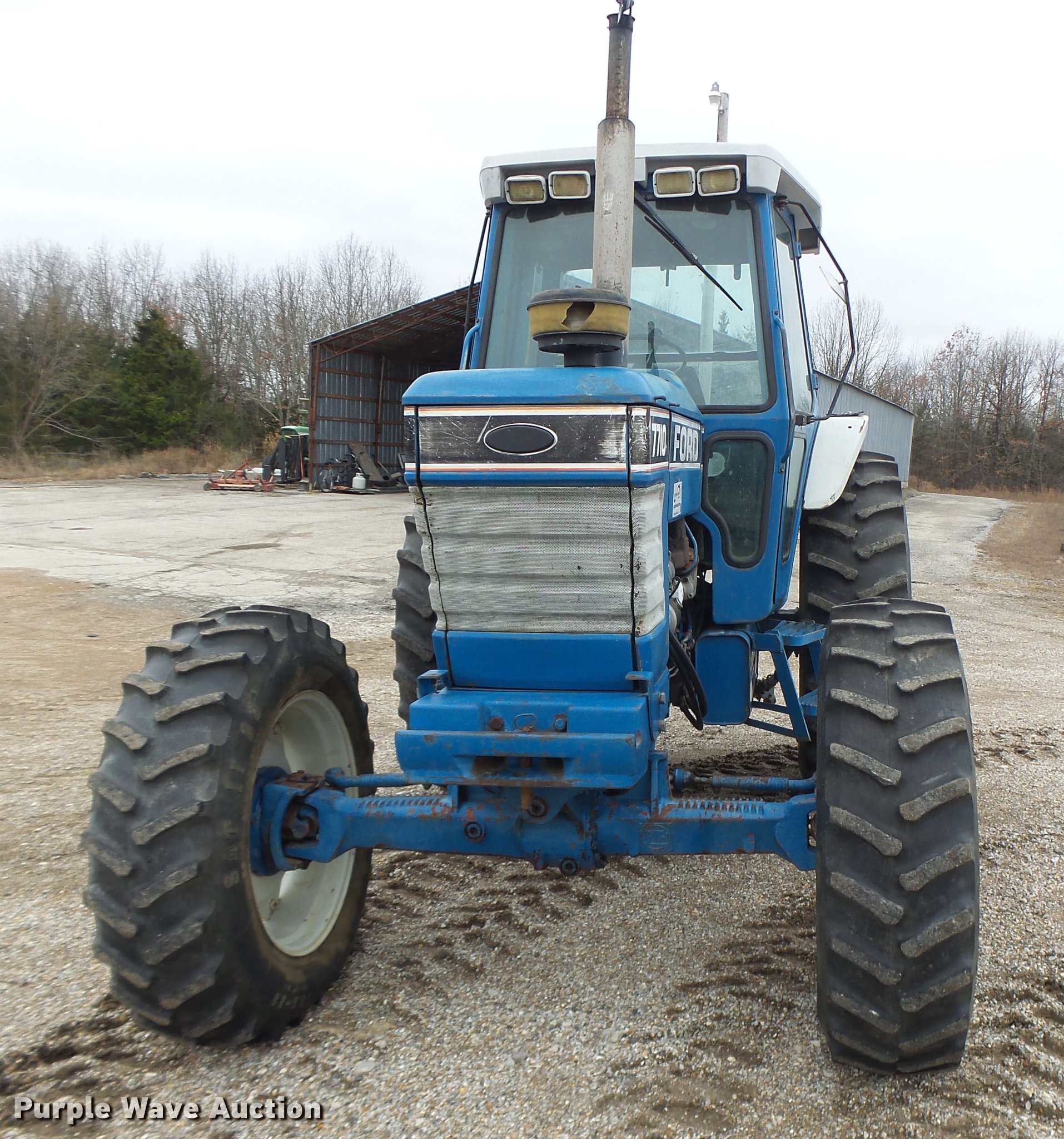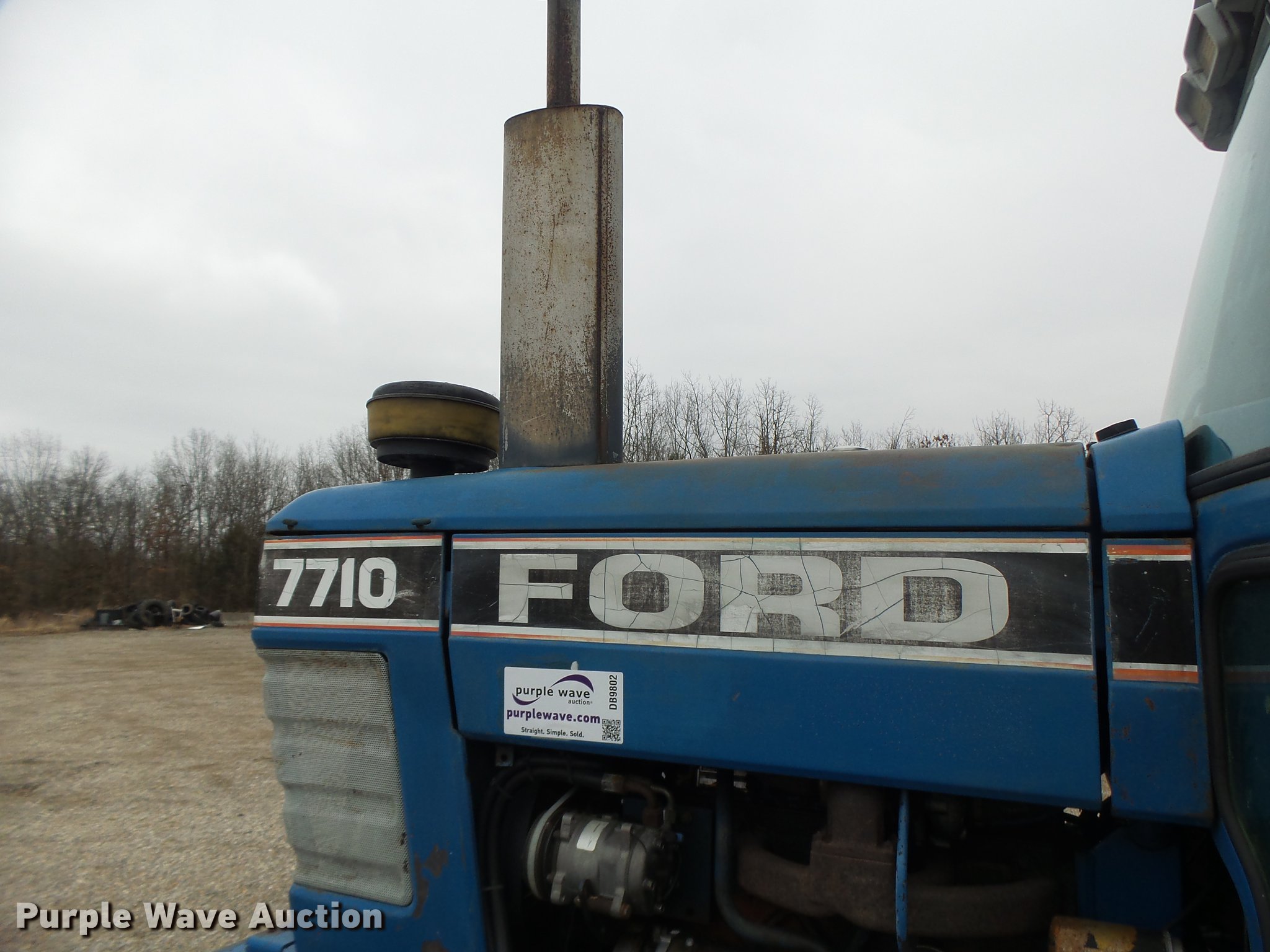 Purple Wave is selling a used Tractor in Missouri. This item is a Ford 7710 MFWD tractor with the following: 5,273 hours on meter, Four cylinder diesel engine, Manual transmission, 8F-4R gears, Enclosed cab, AC and heat, Spring suspension seat, Three point, 540 PTO, (4) rear hydraulic remote sets, 13.6-28 front tires, 18.4-38 rear tires, Serial BH76418